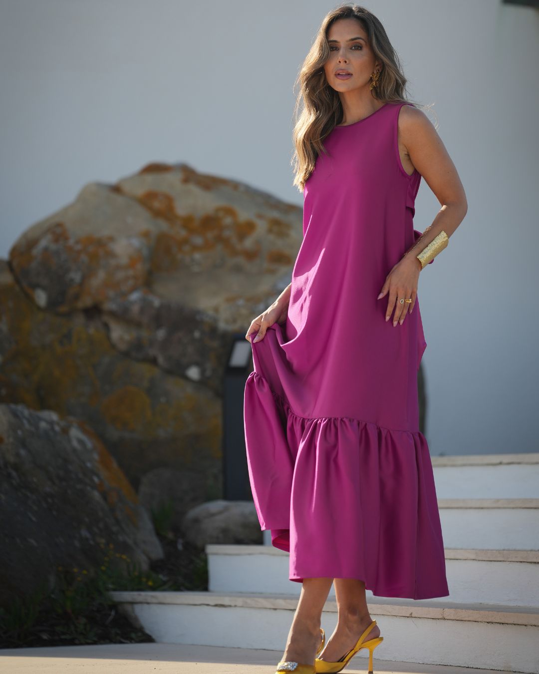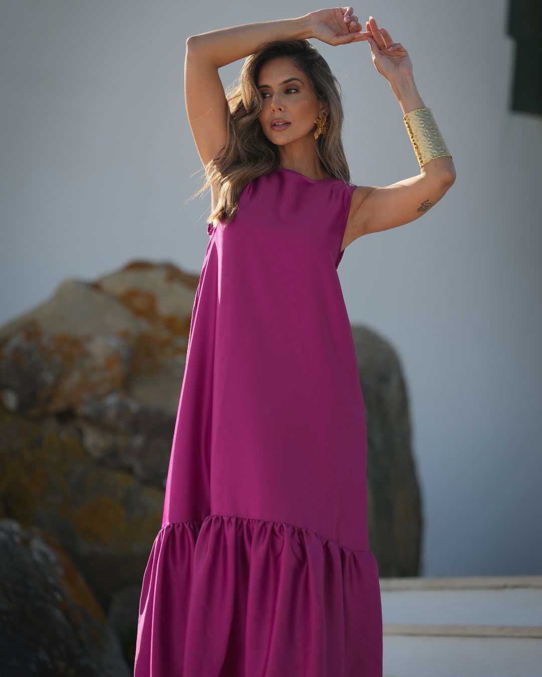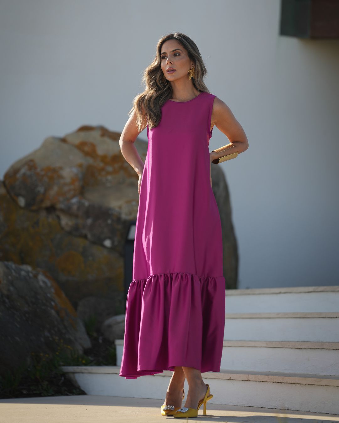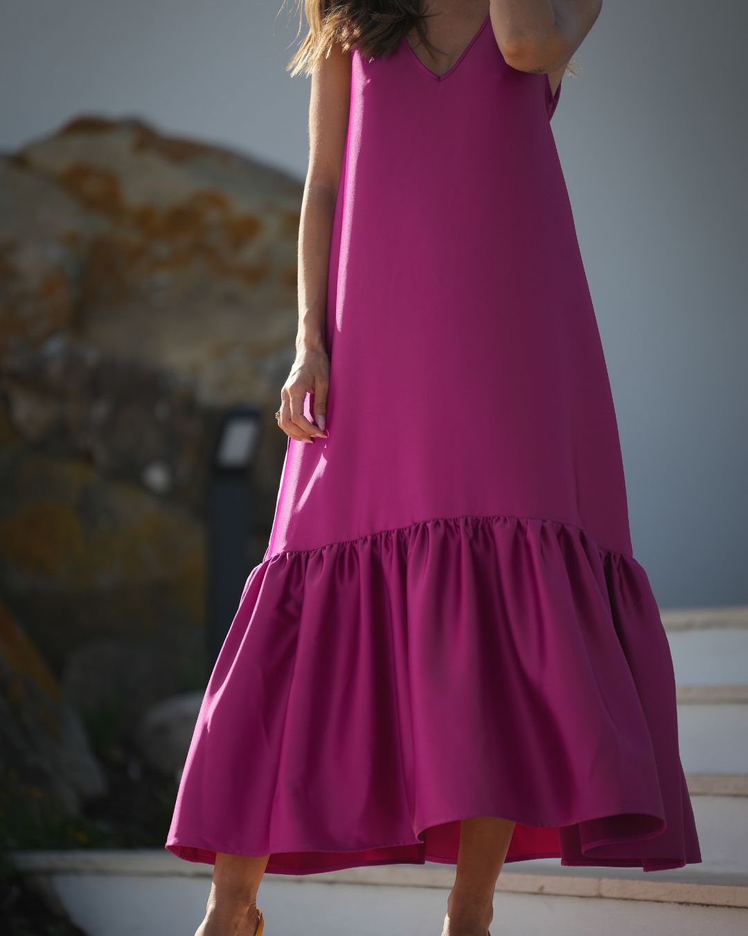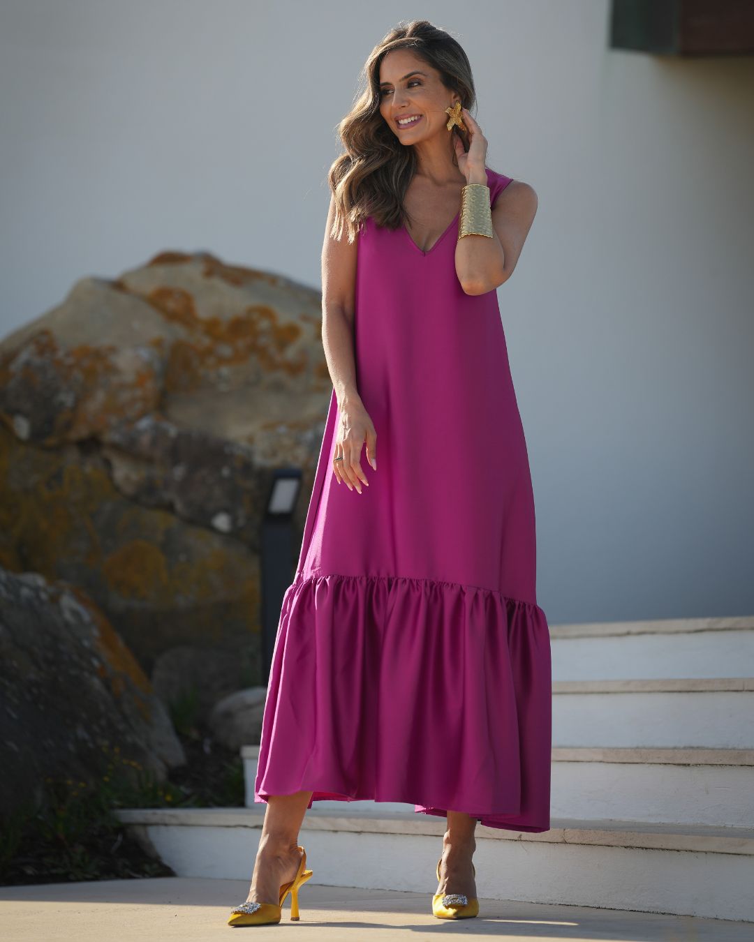 4 meters of a dress with a ruffle, with a V-neck at the back but which you can also wear at the front, with a belt that can be worn with a bow at the back, or a cross at the front, there are several ways you can wear it. The dress you can wear to a ceremony or to go out to dinner, just change the shoes and accessories and voila