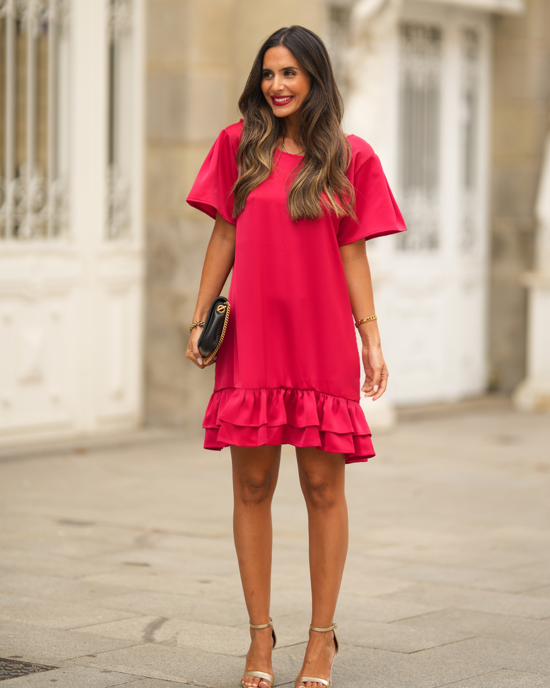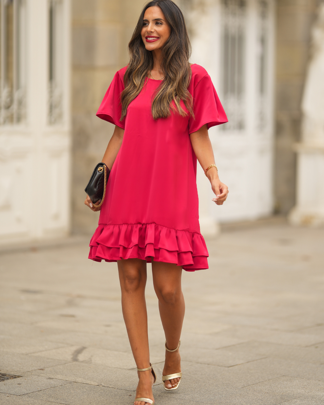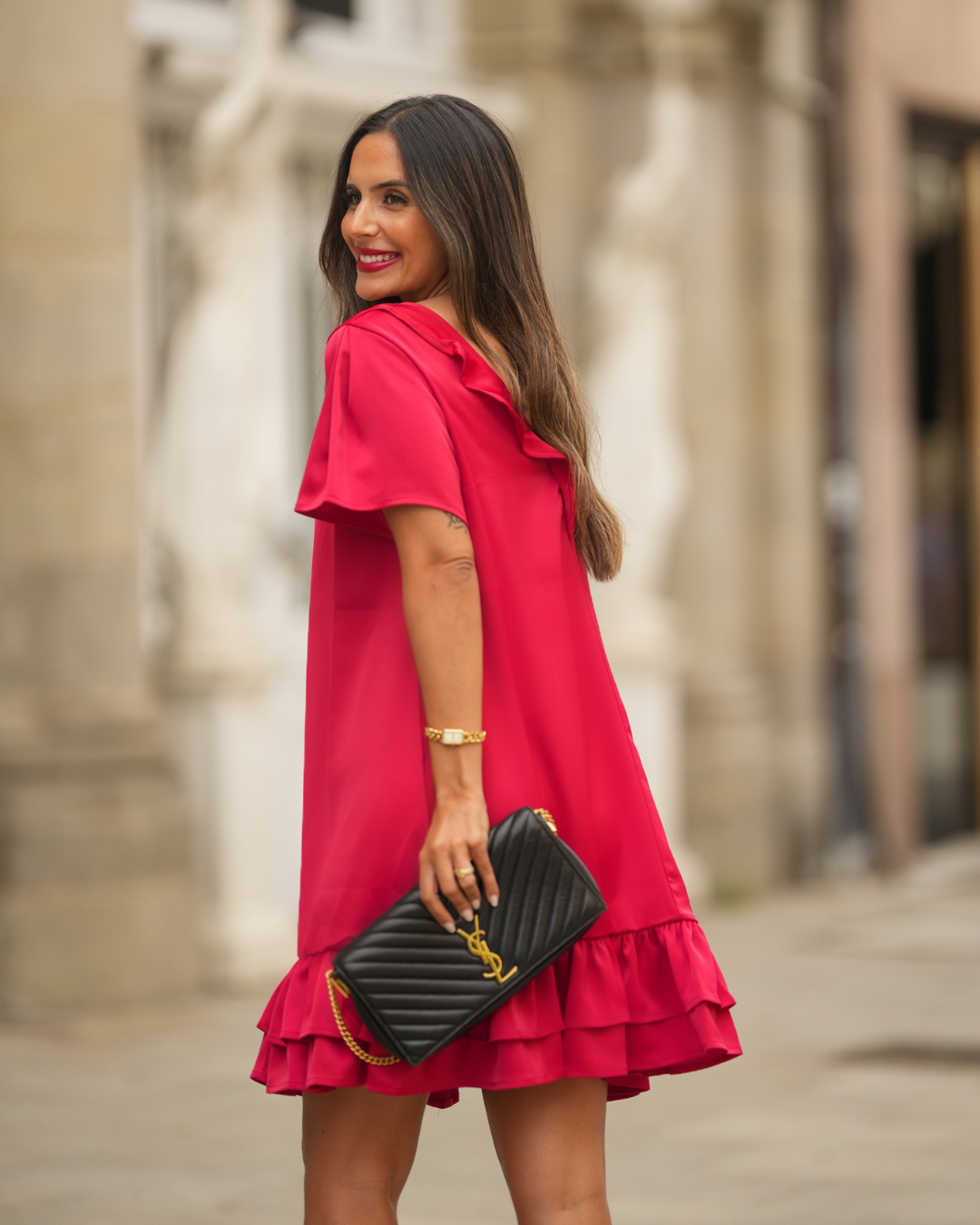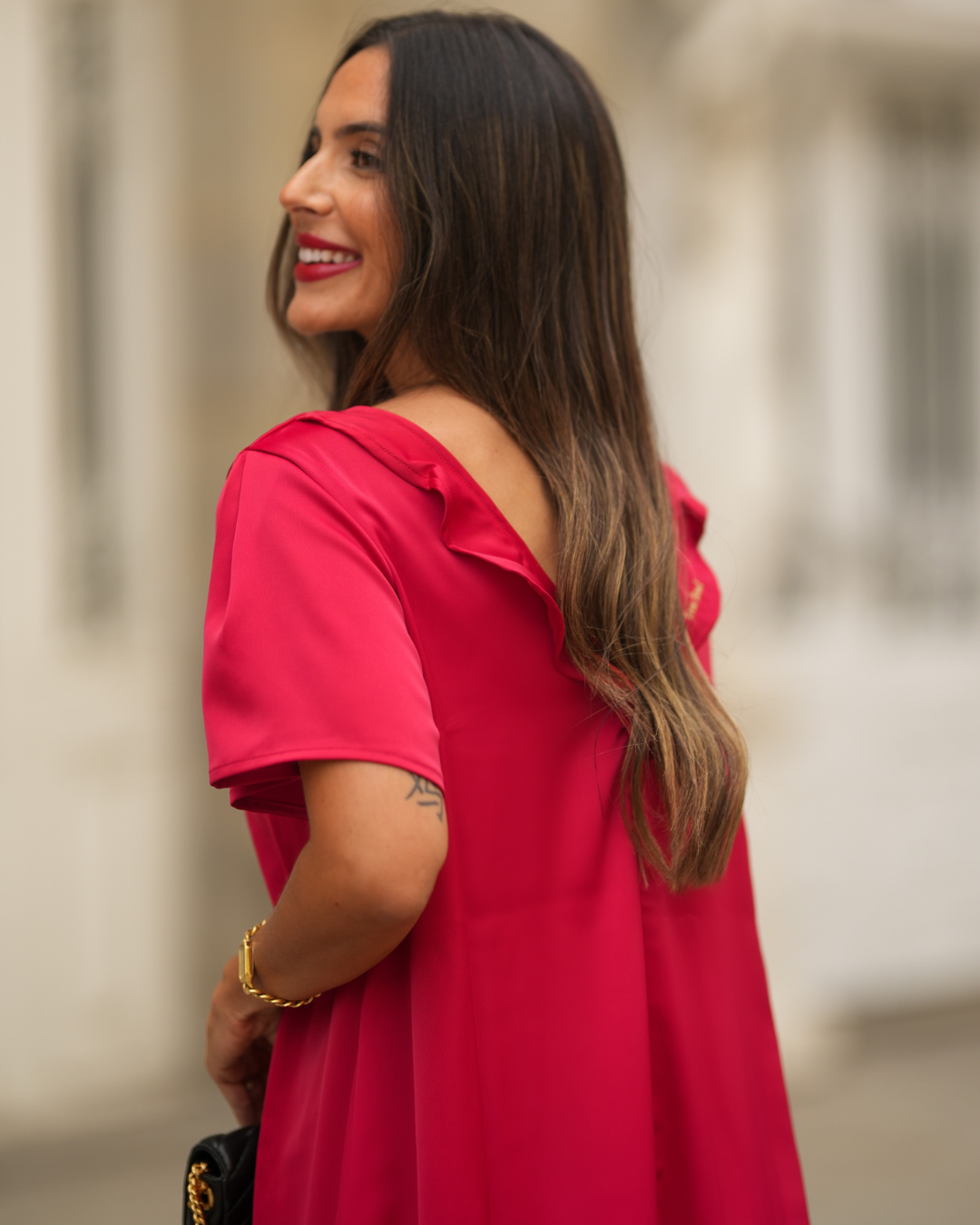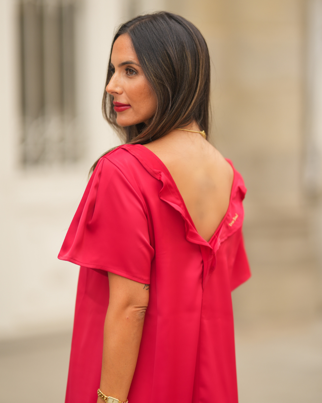 One of our bestsellers since 2020 is back with some upgrades! Reversible dress in a slightly satiny fabric, with a V-neck opening at the back and a ruffle detail all around. You can wear the neckline at the back or at the front, 2 in 1.