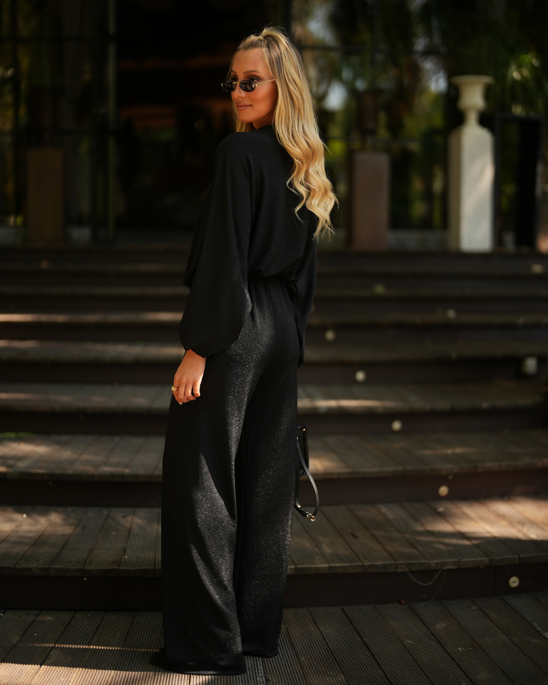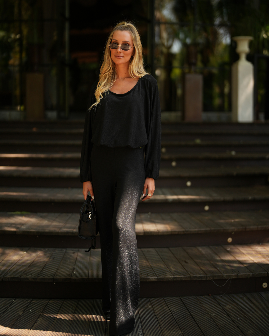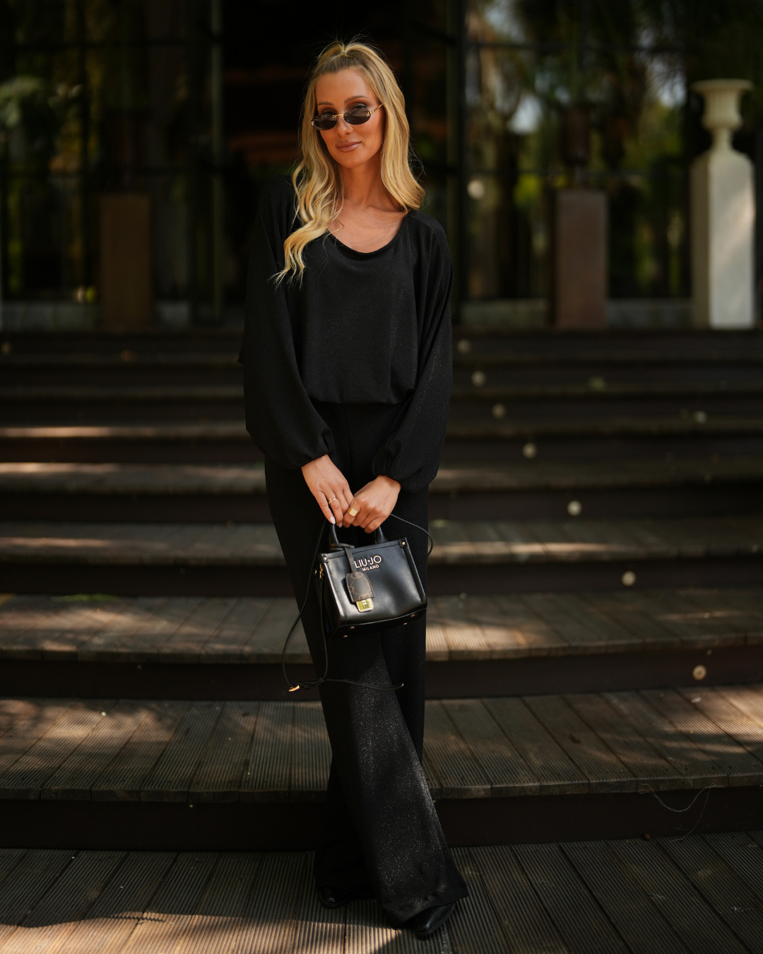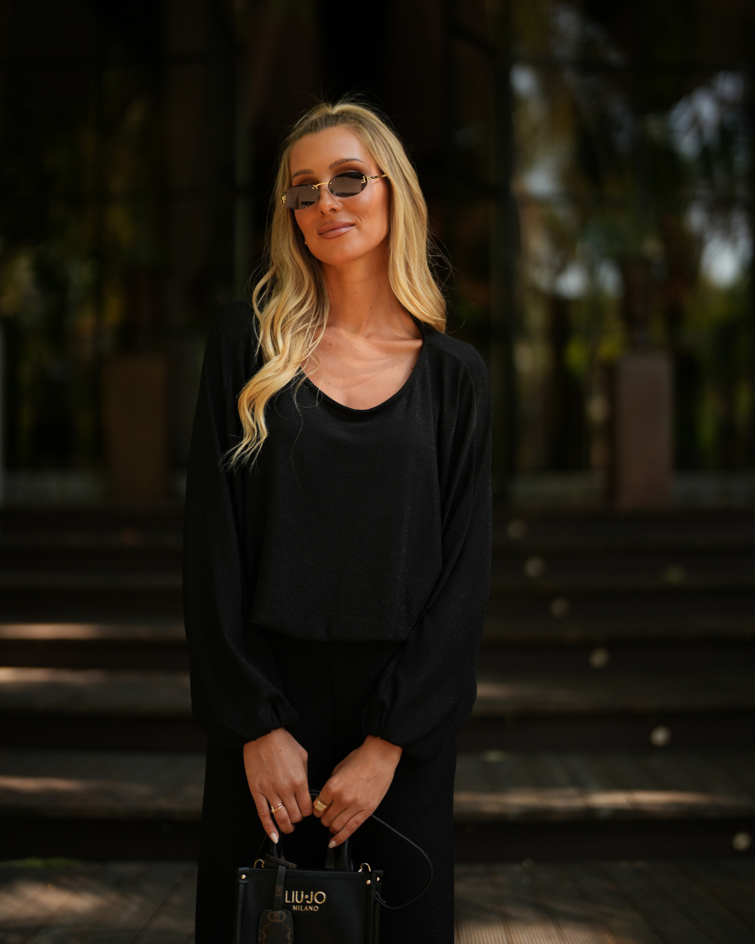 Blouse in lurex knit, with a slight shine, double-sided drape effect at the waist to make you feel more comfortable and to fit more body types, disguising the waist area. Flared sleeves at the shoulder, with a gathered effect all over the sleeve cap. Fastens with a teardrop button at the back. On the collar you will find the inspirational statement embroidered in lurex thread in the color of the shine, You Shine.