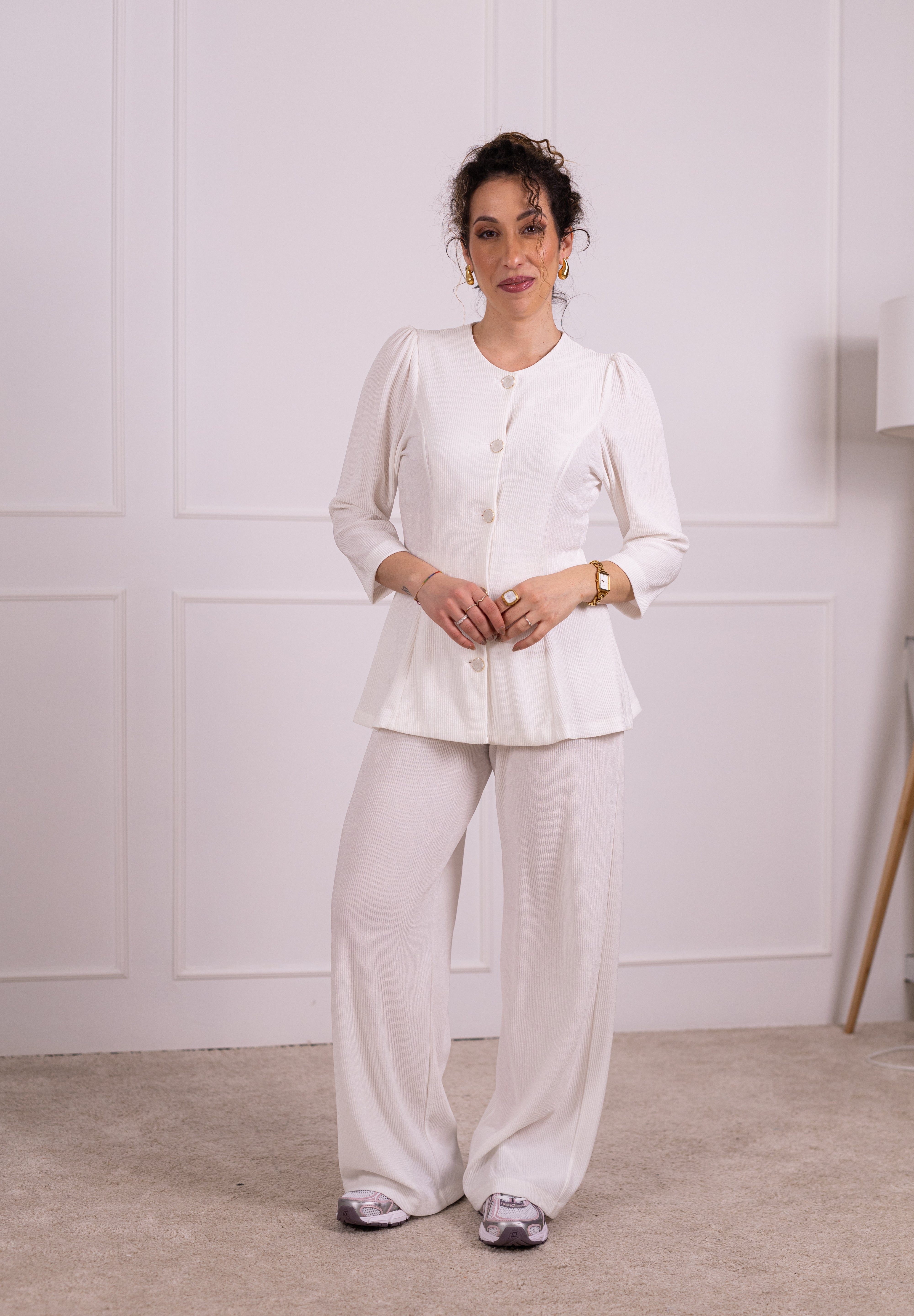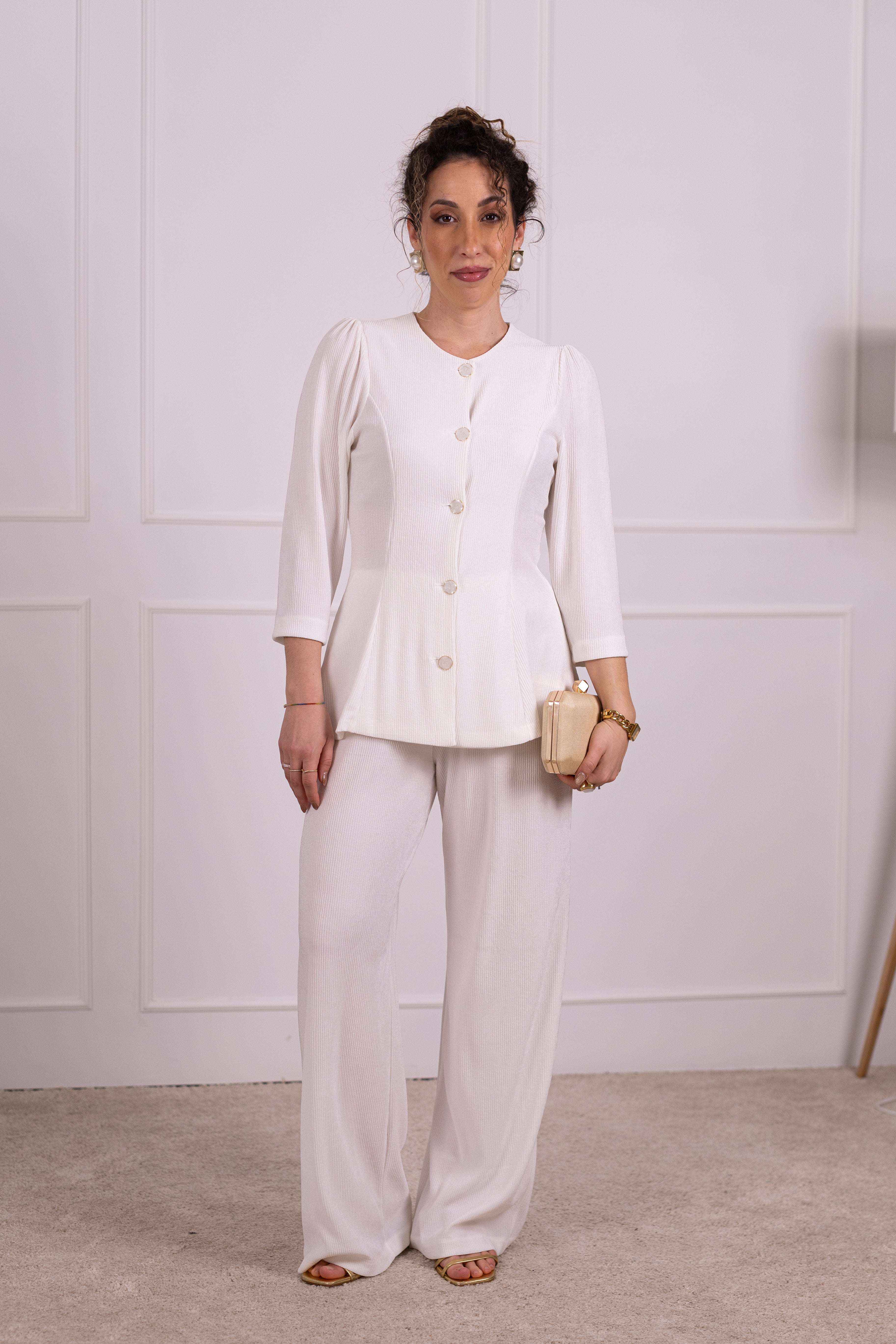 Os seis botões joia acrescentam um requinte singular, enquanto as mangas 3/4 reforçam a sua versatilidade. A cintura mais definida valoriza a silhueta, proporcionando um efeito mais cintado e feminino.