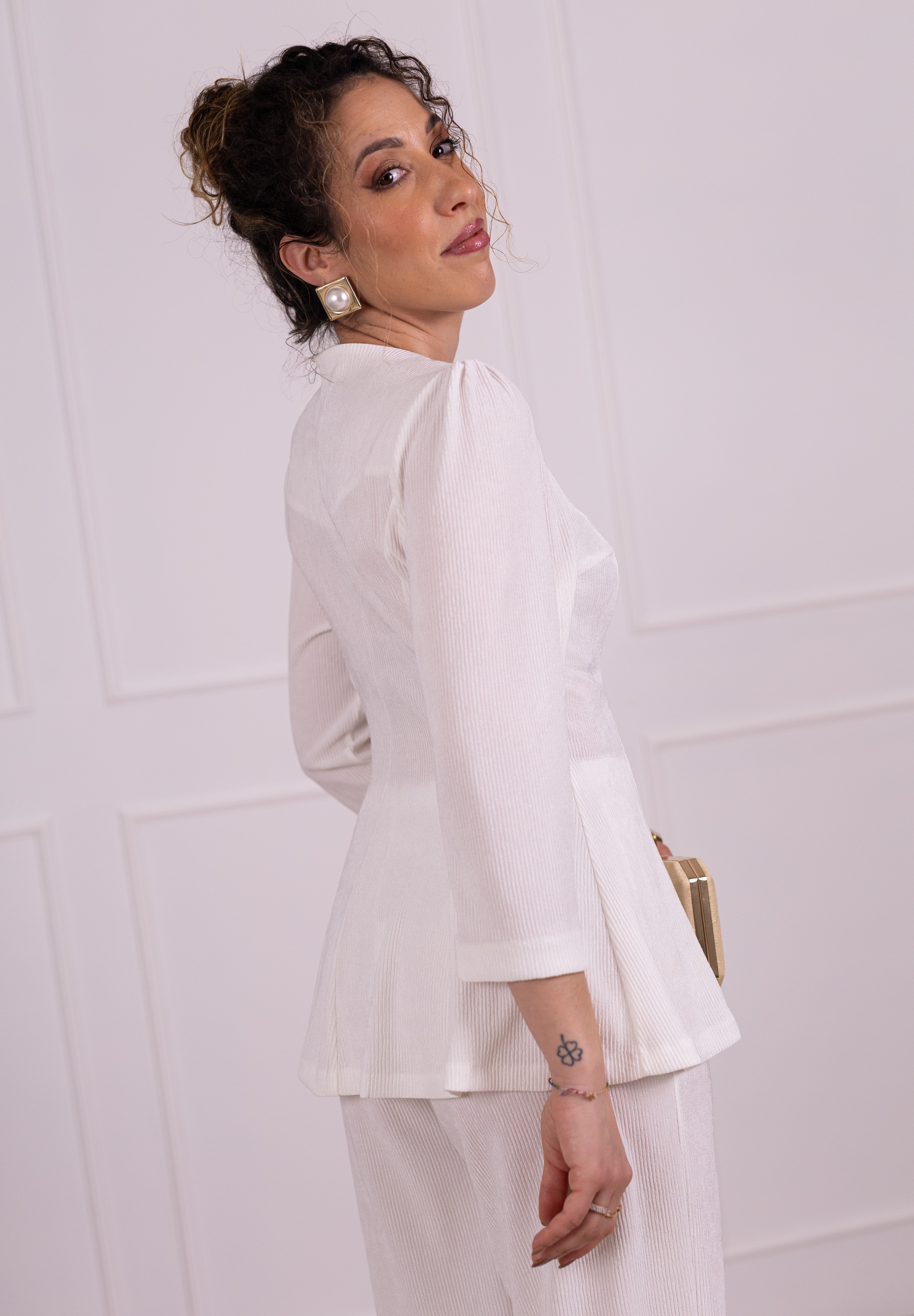 A nossa blusa/casaco é confeccionada em tecido plissado com um subtil brilho, que lhe confere sofisticação e presença. Apresenta franzido nos ombros e efeito de pinças à frente e nas costas, criando estrutura e elegância no fitting.