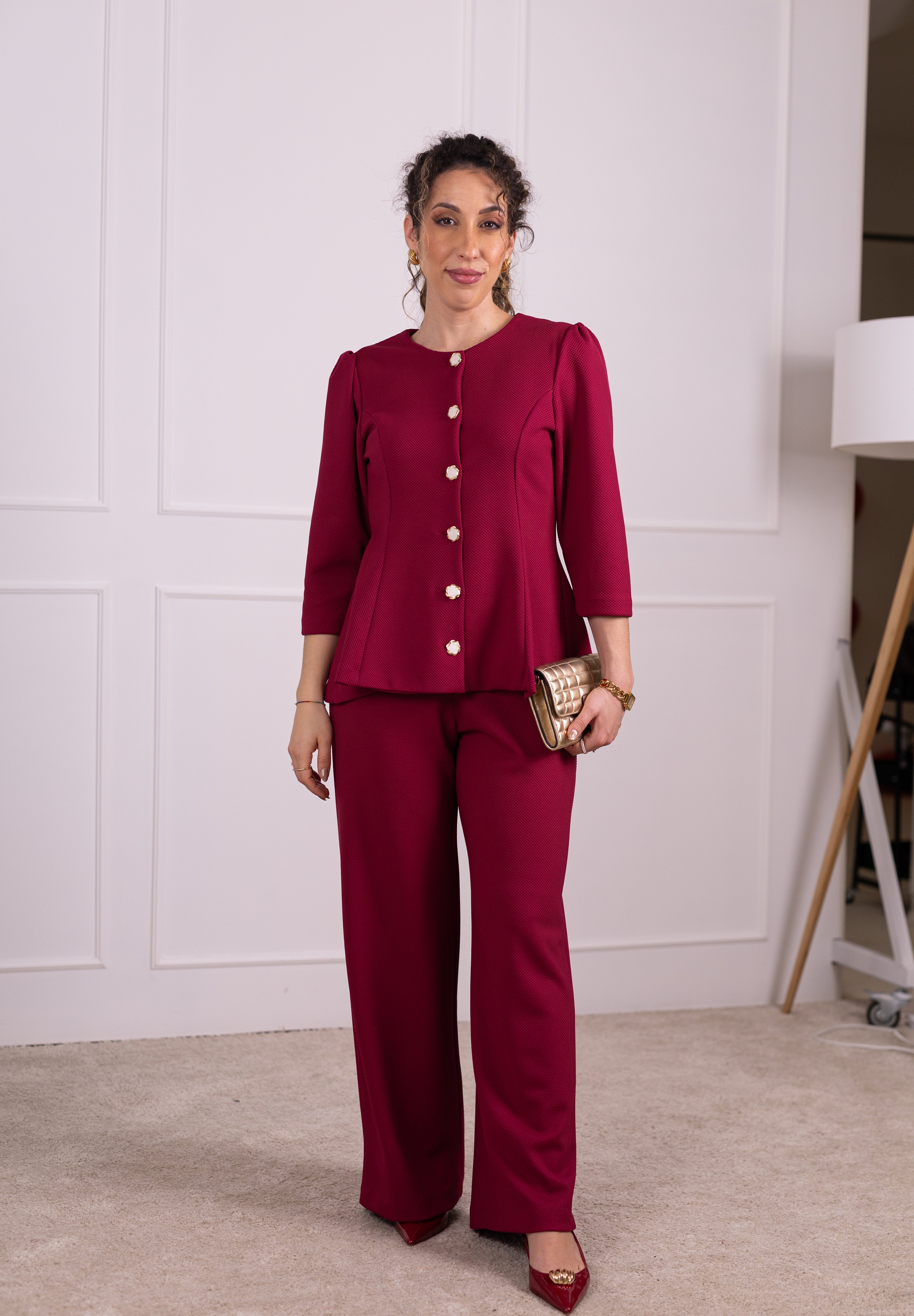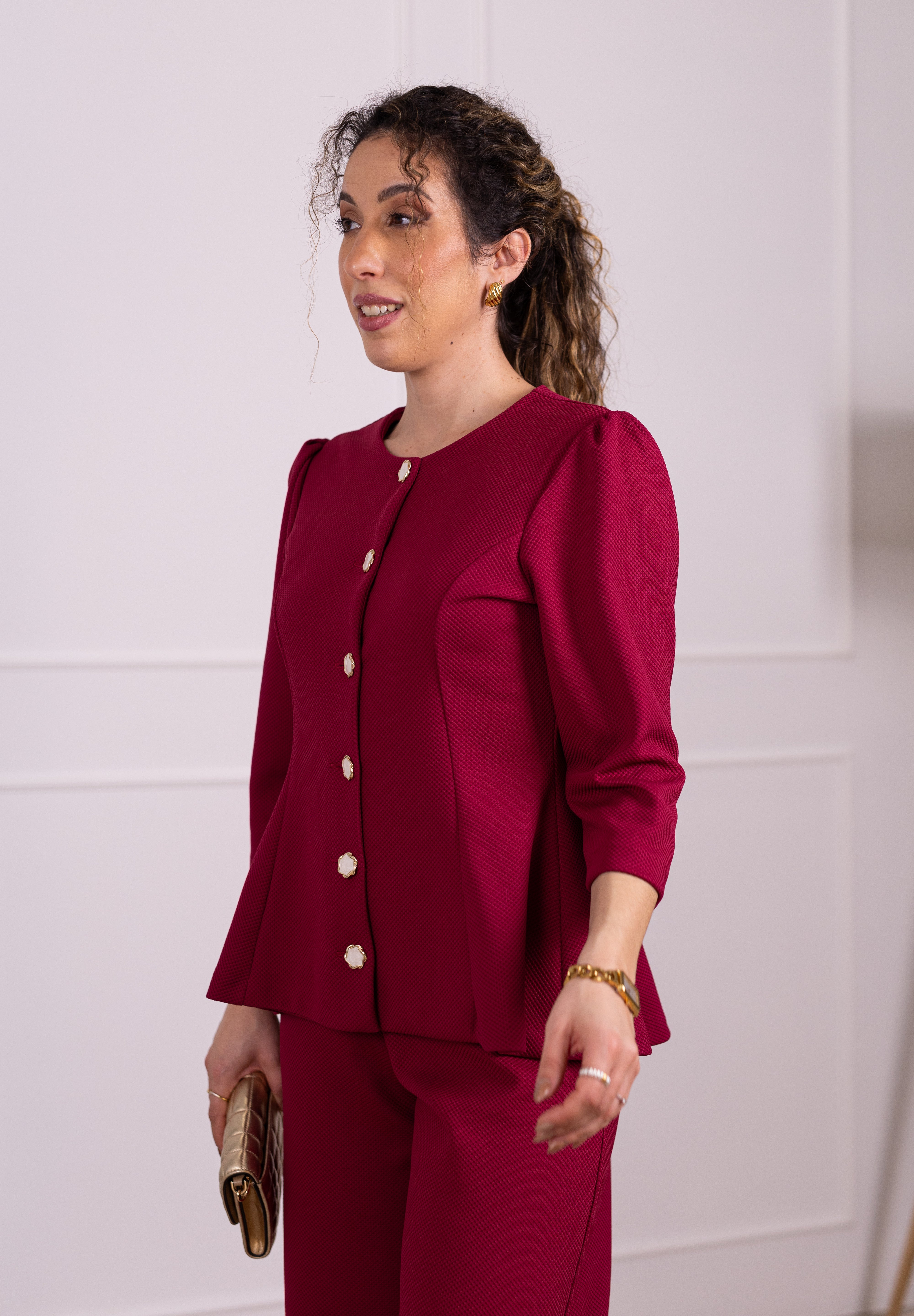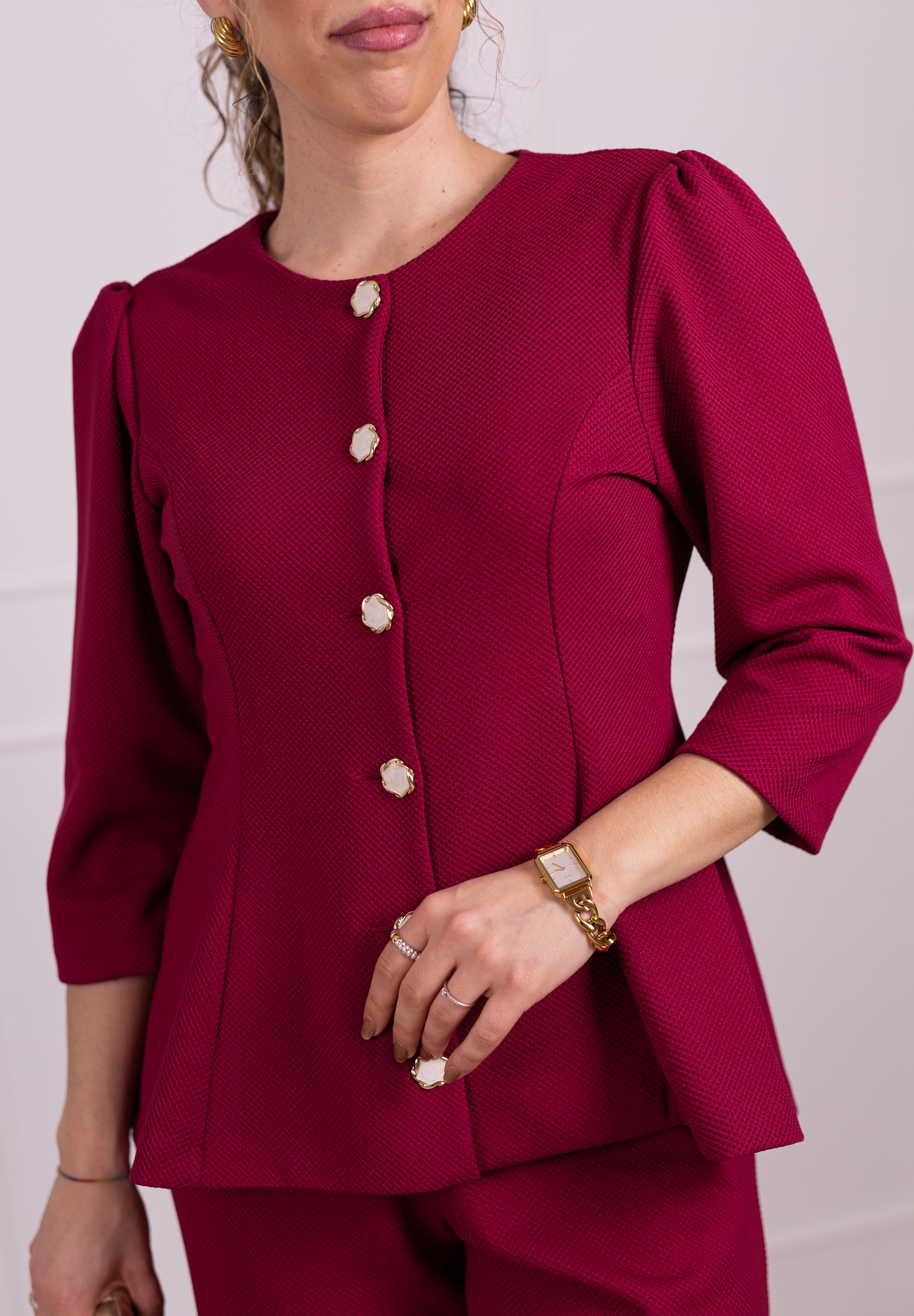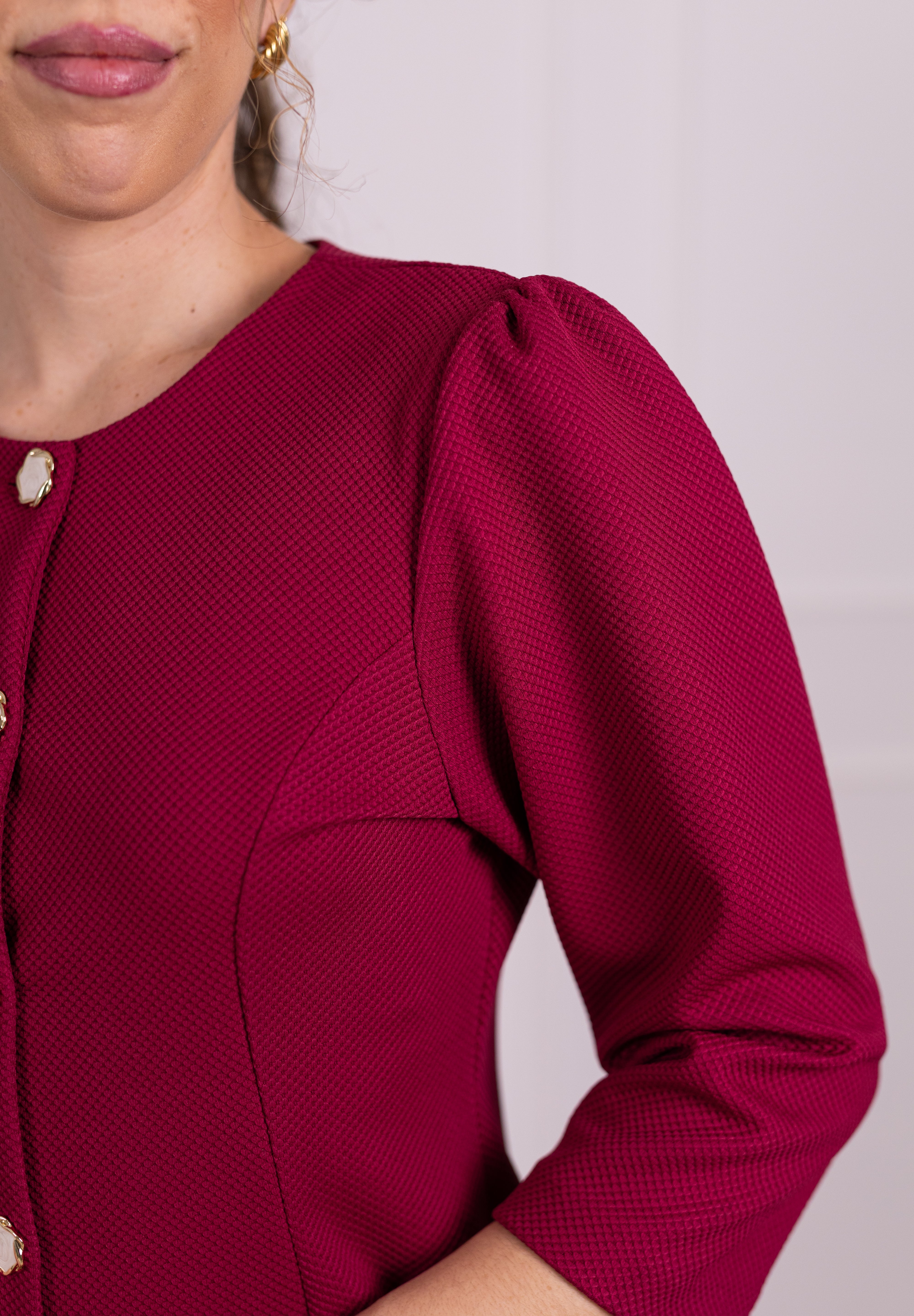 Os seis botões jóia acrescentam um requinte singular, enquanto as mangas 3/4 reforçam a sua versatilidade. A cintura mais definida valoriza a silhueta, proporcionando um efeito mais cintado e feminino.