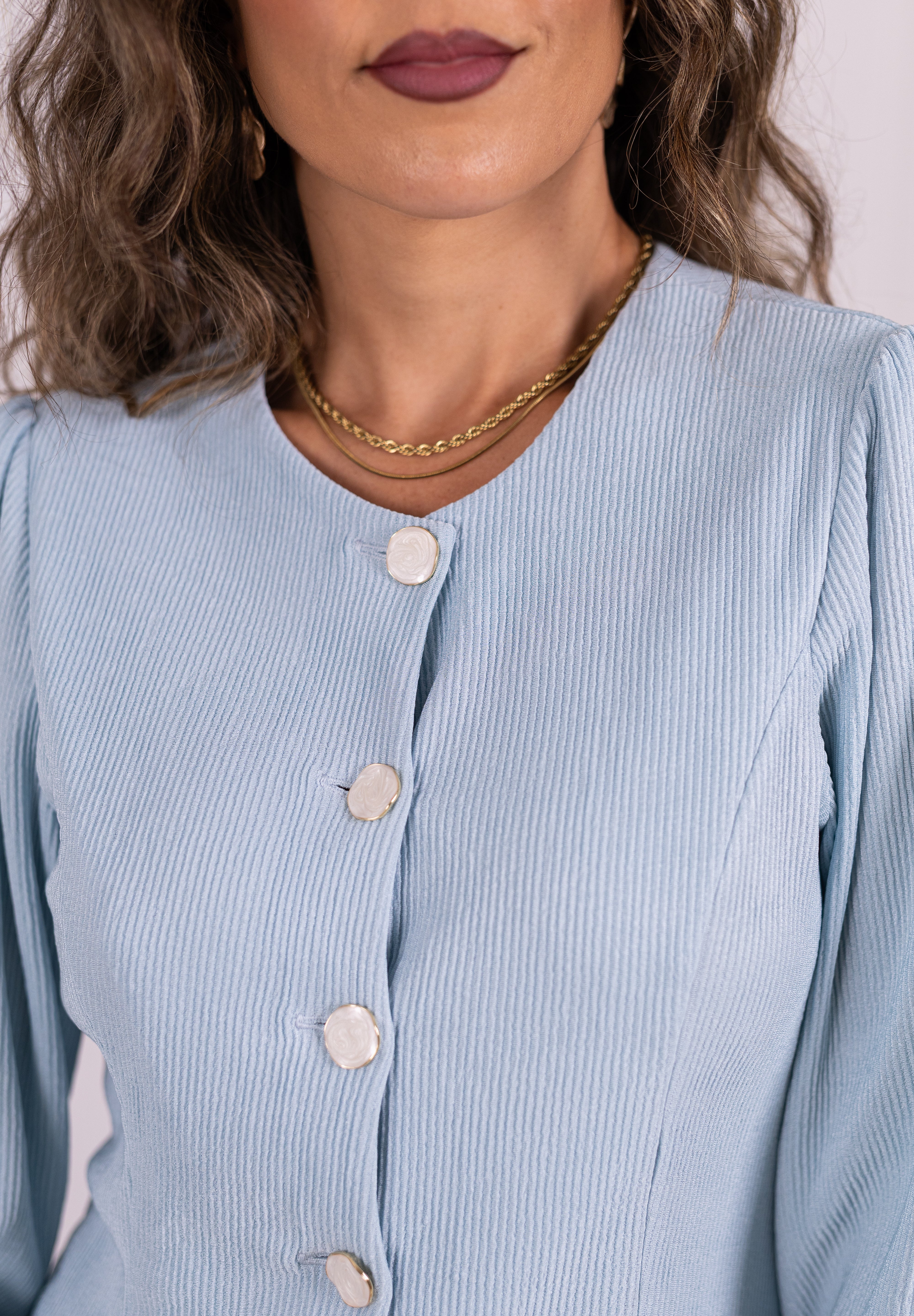 Os seis botões joia acrescentam um requinte singular, enquanto as mangas 3/4 reforçam a sua versatilidade. A cintura mais definida valoriza a silhueta, proporcionando um efeito mais cintado e feminino.