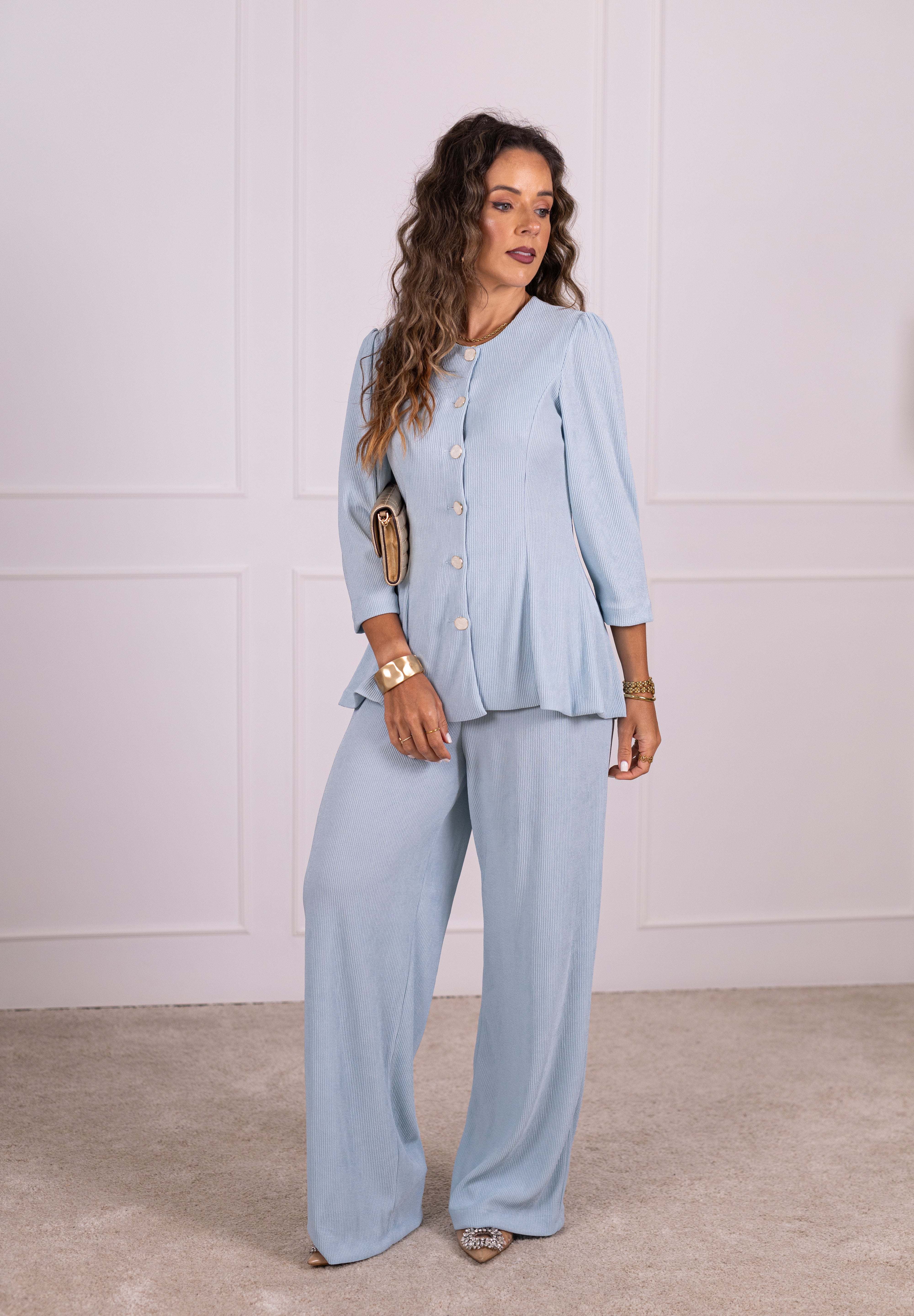 As nossas novas calças são confeccionadas em tecido plissado leve e solto, com um subtil brilho, que lhes confere sofisticação e leveza. De cintura subida, com elástico interior, adaptam-se confortavelmente a diferentes silhuetas, valorizando vários tipos de corpo.