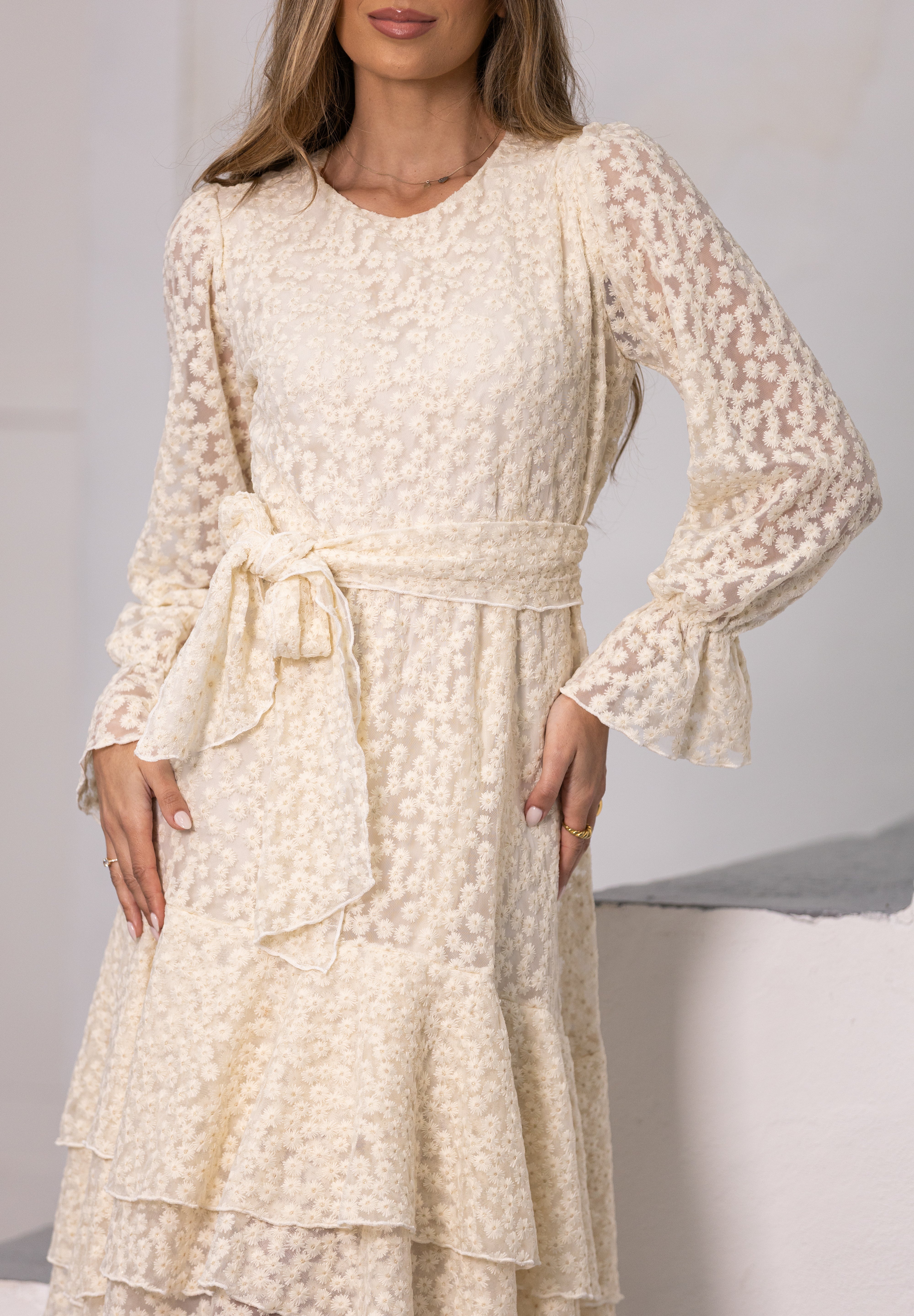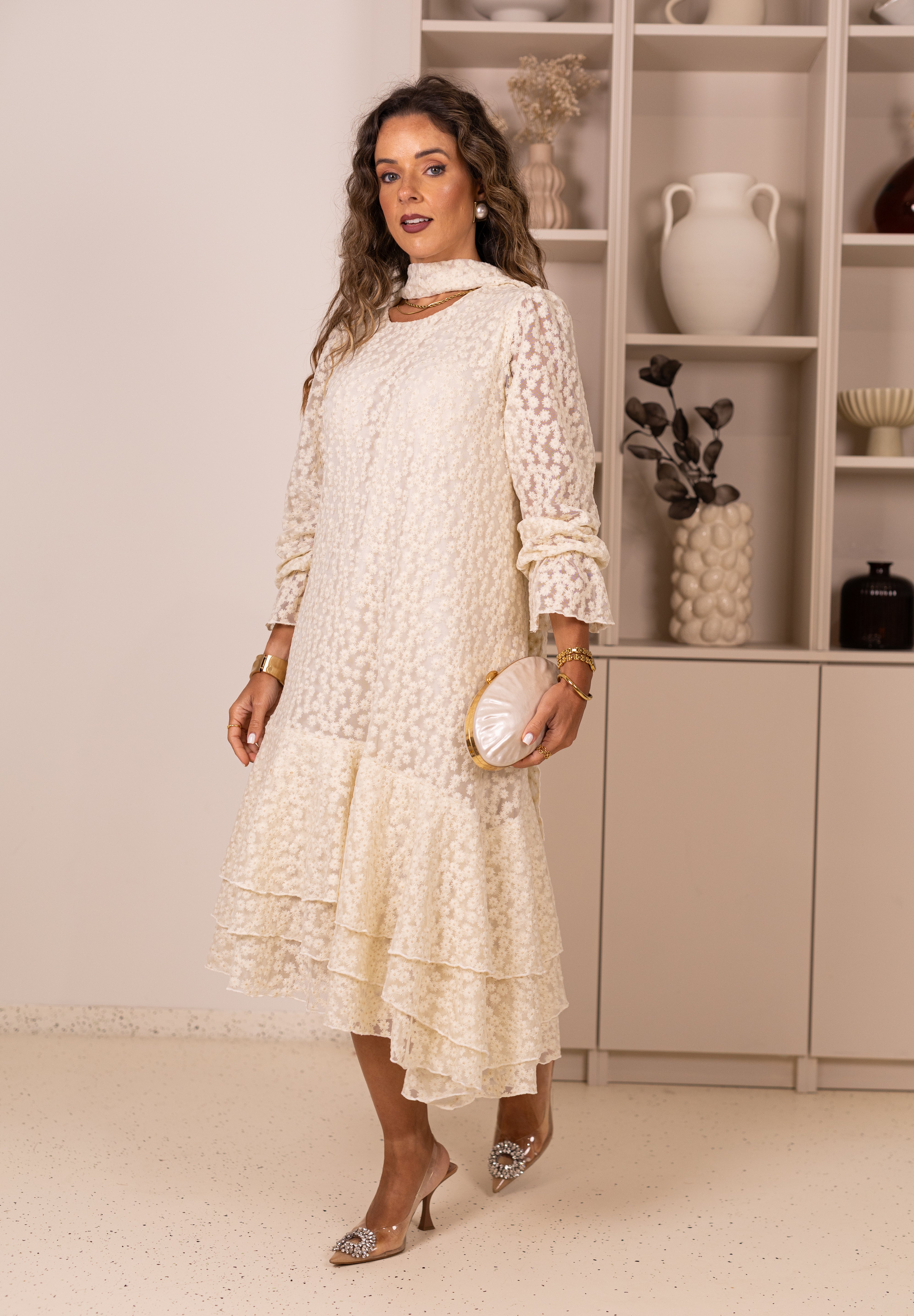 Os três folhos assimétricos conferem leveza e um fitting esvoaçante, criando movimento a cada passo. Inclui encharpe ou cinto, permitindo adaptar o look consoante a ocasião e os acessórios, há liberdade para criar e reinventar os seus próprios t-looks.