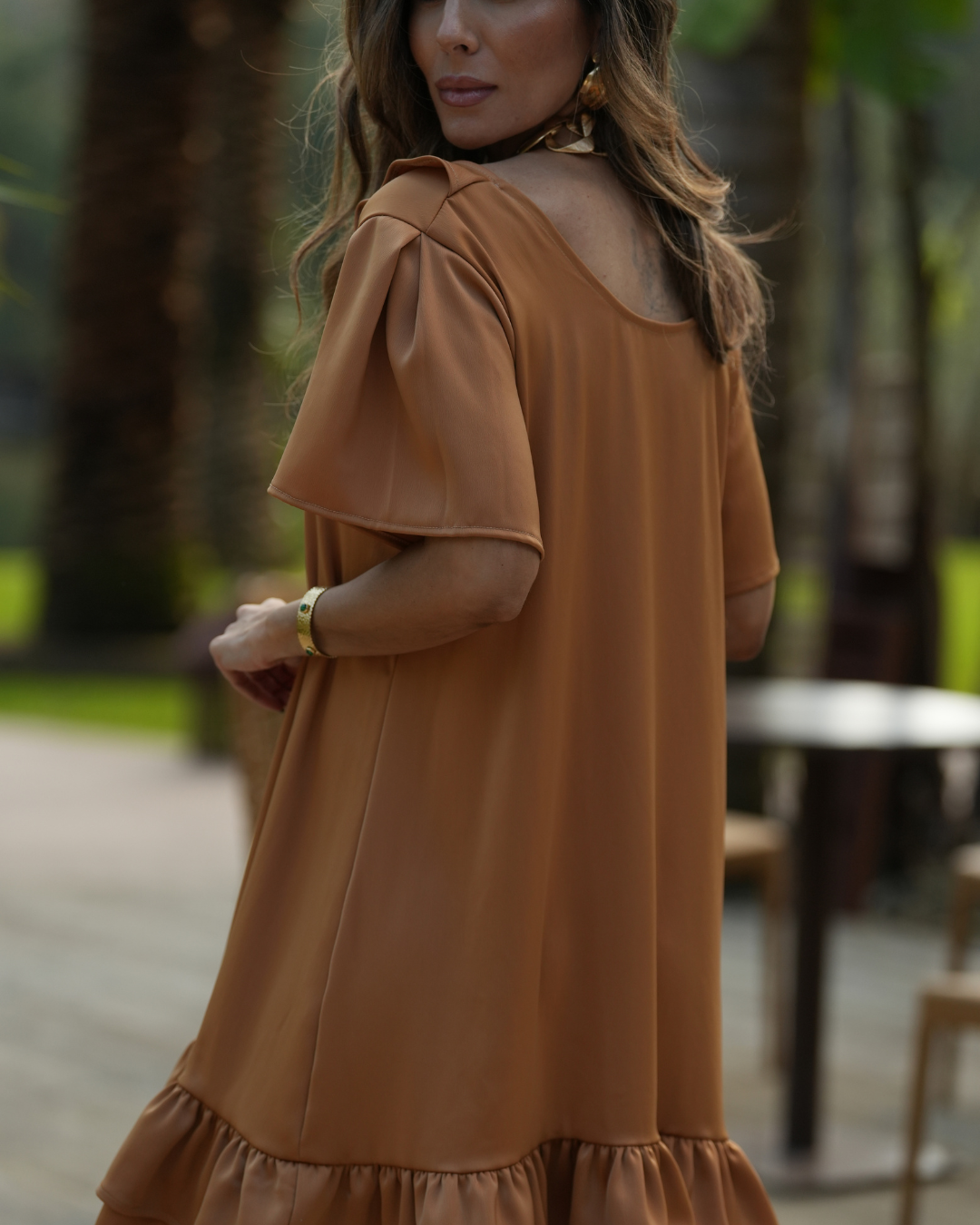 Reversible dress in slightly satiny fabric, with a V-shaped opening at the back and a ruffle detail around the edges. You can wear the neckline at the back or at the front, 2 in 1.