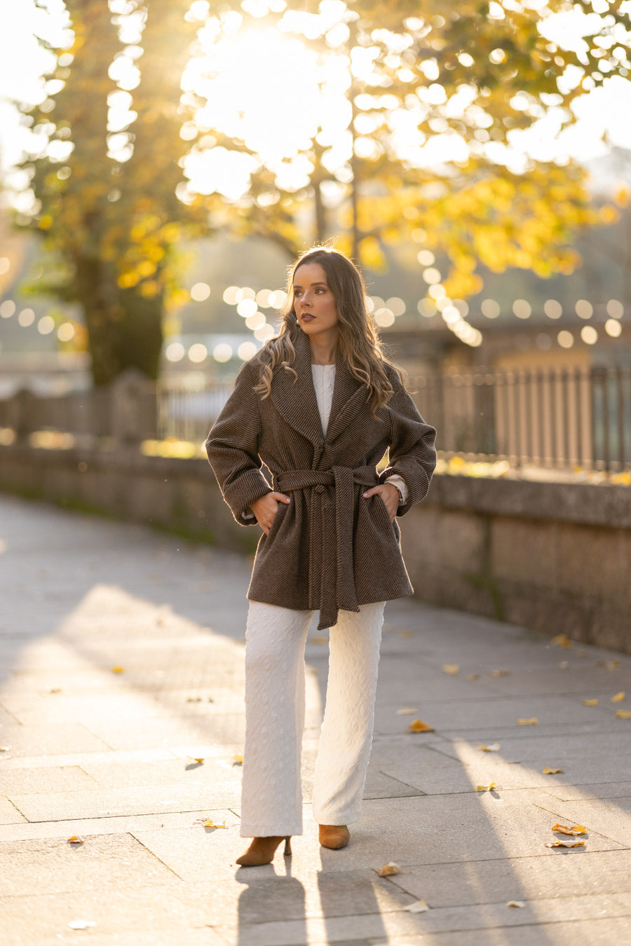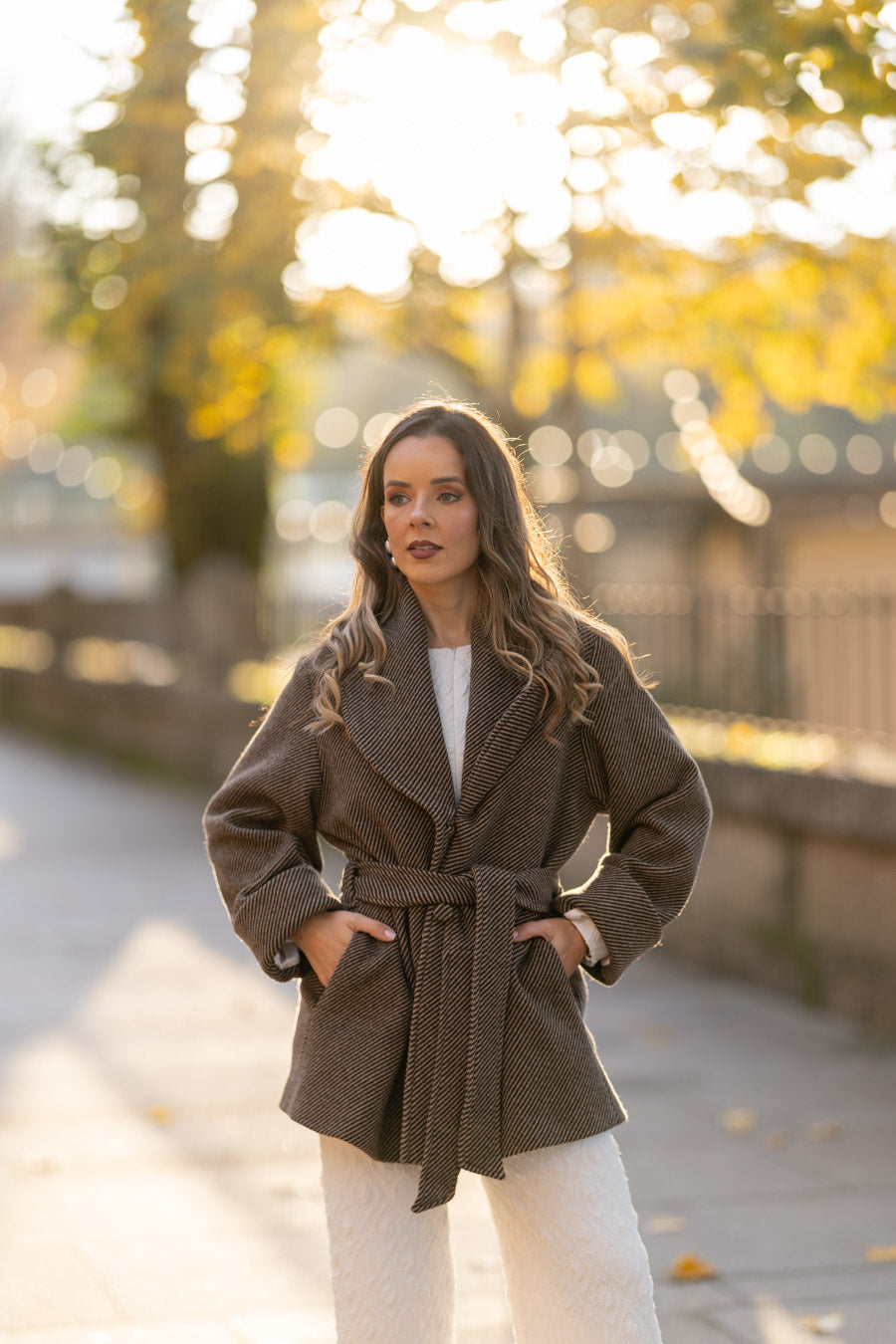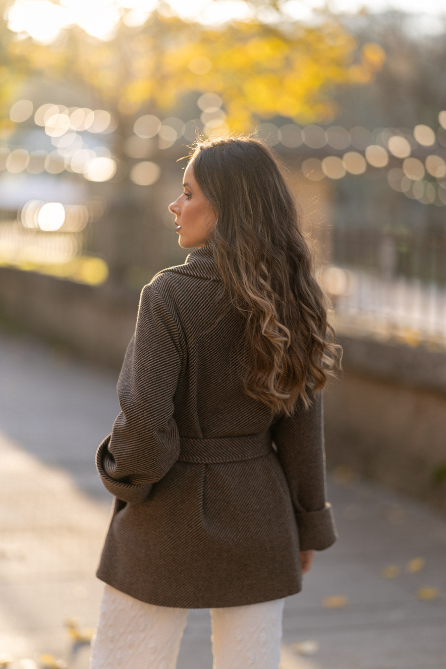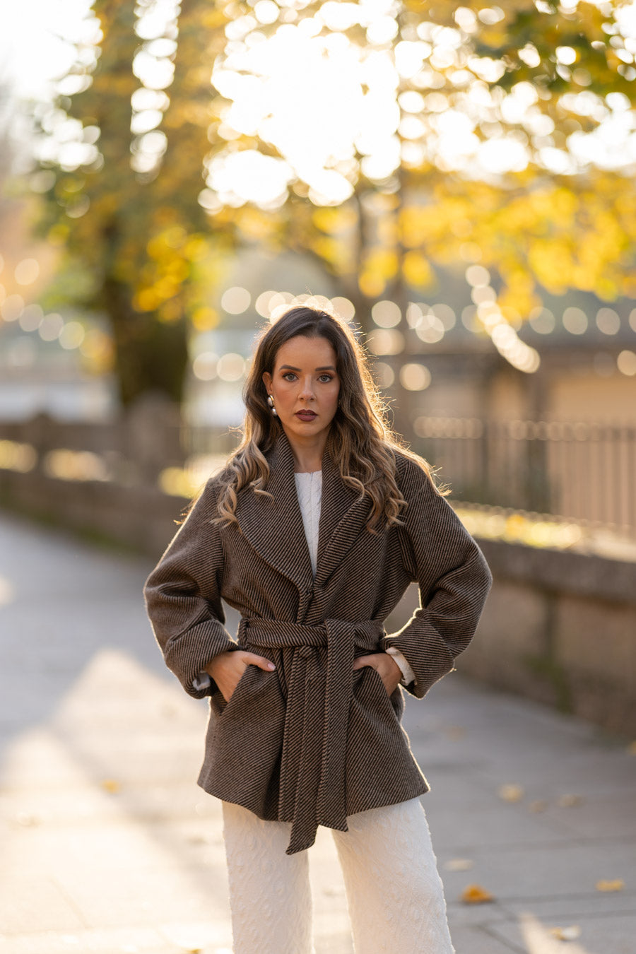 Fully lined in beige satin fabric sublimated with our logo. 3 jewel buttons, with puff sleeves that allow you to wear knitted garments, puff sleeves, and anything else you want without feeling uncomfortable. The sleeves end in pleated cuffs. With side pockets at the waist.