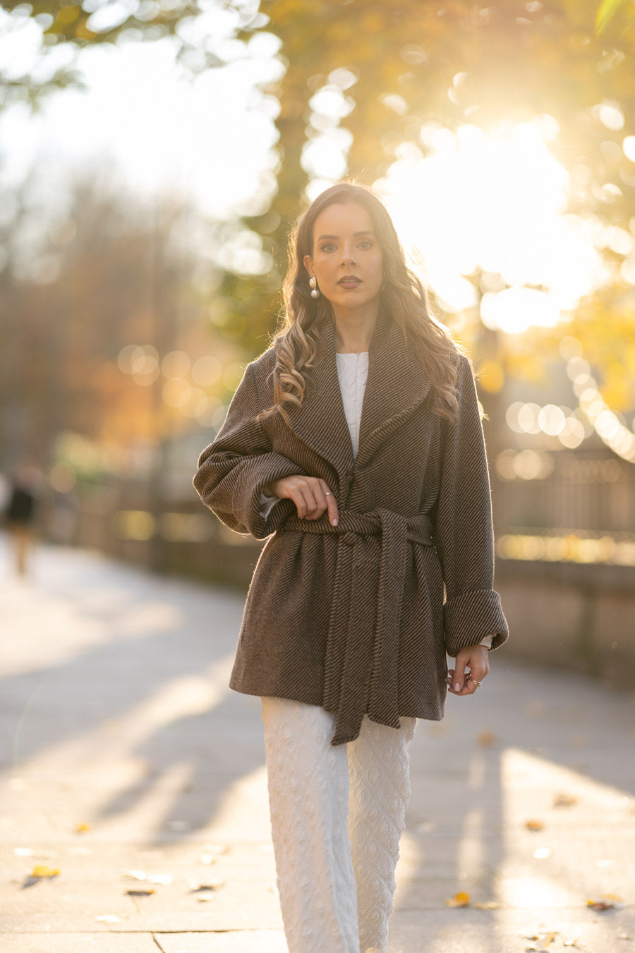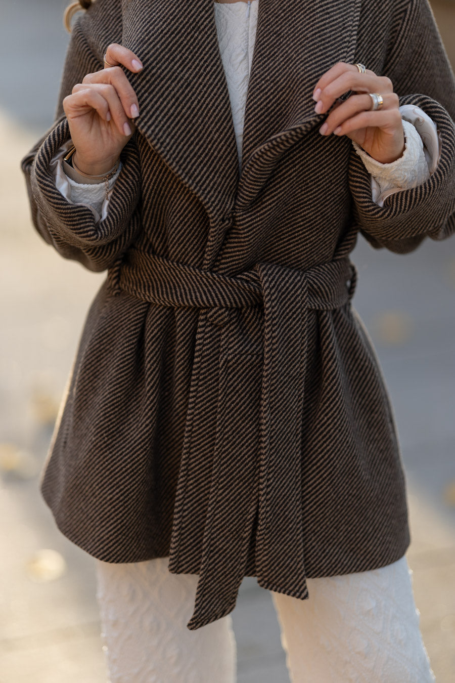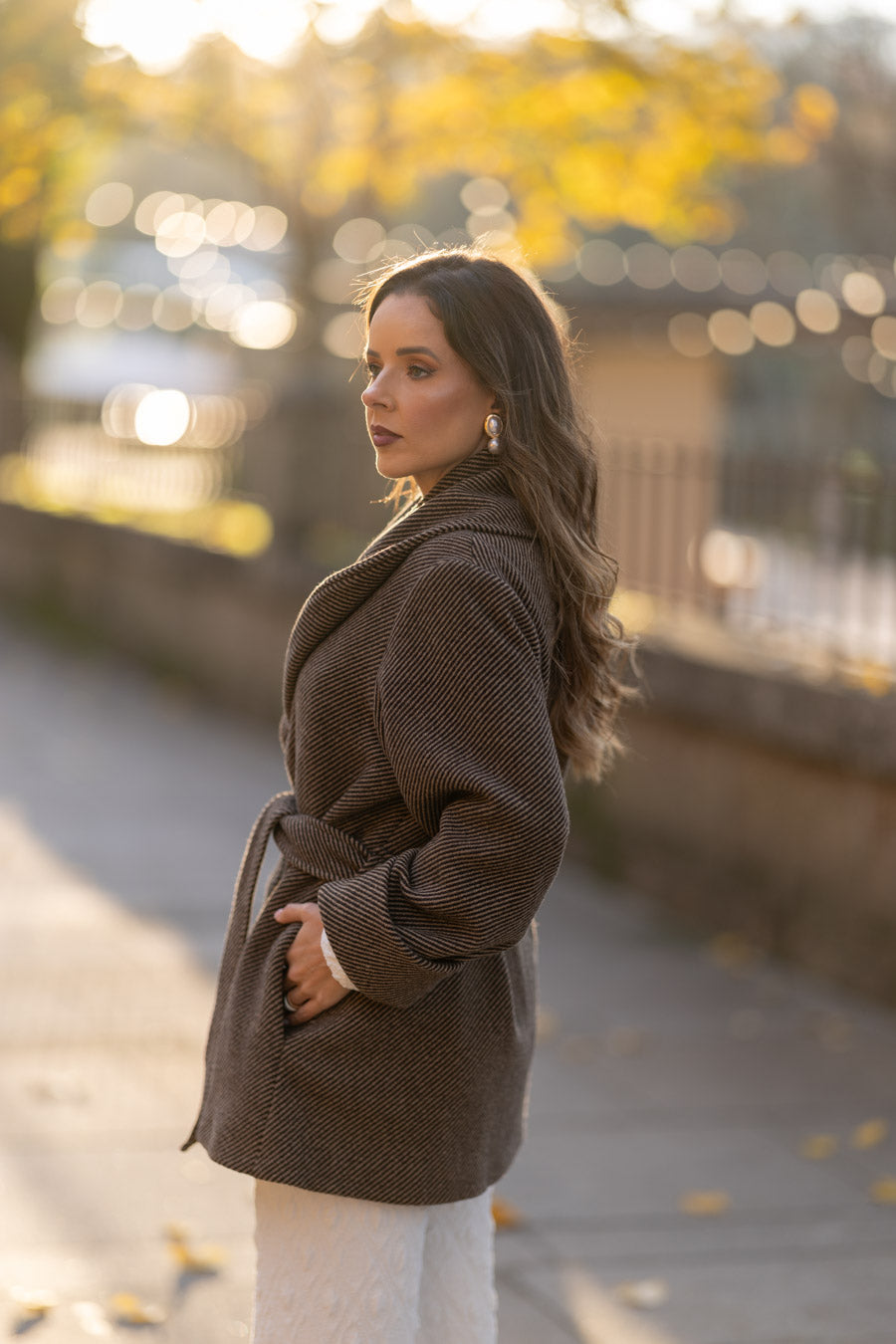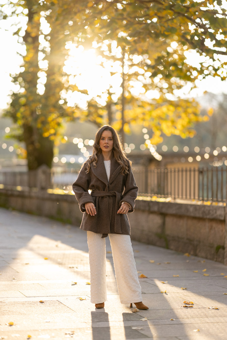 Fully lined in beige satin fabric sublimated with our logo. 3 jewel buttons, with puff sleeves that allow you to wear knitted garments, puff sleeves, and anything else you want without feeling uncomfortable. The sleeves end in pleated cuffs. With side pockets at the waist.