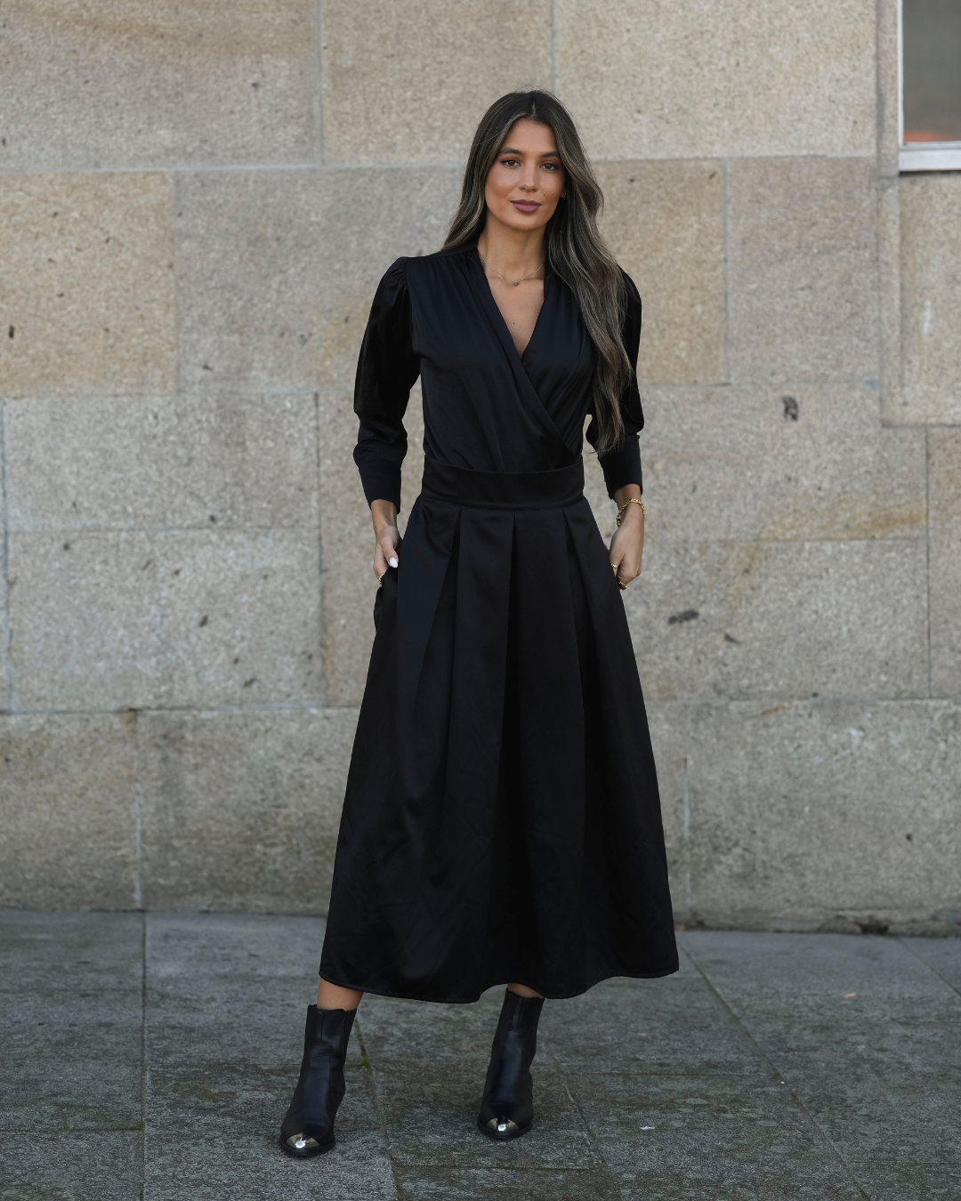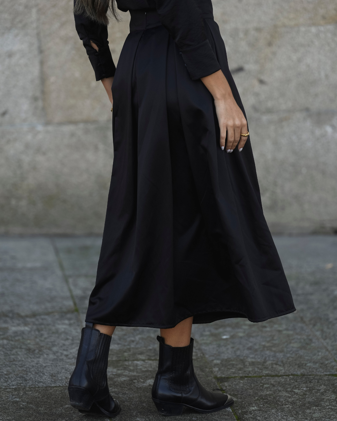 Nuestra falda coraje, creada en 2020, ha vuelto, más larga, siendo una fuerte tendencia este año y en los próximos años. Fabricado en un nuevo tejido estructurado con efecto ante aterciopelado, perfecto para estas estaciones más frías. En el reverso, la tela tiene un acabado satinado que le da mayor sofisticación y diferencia.