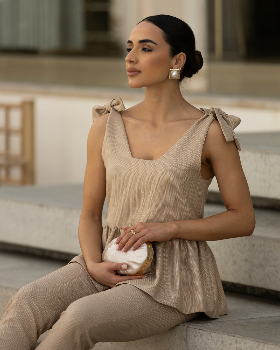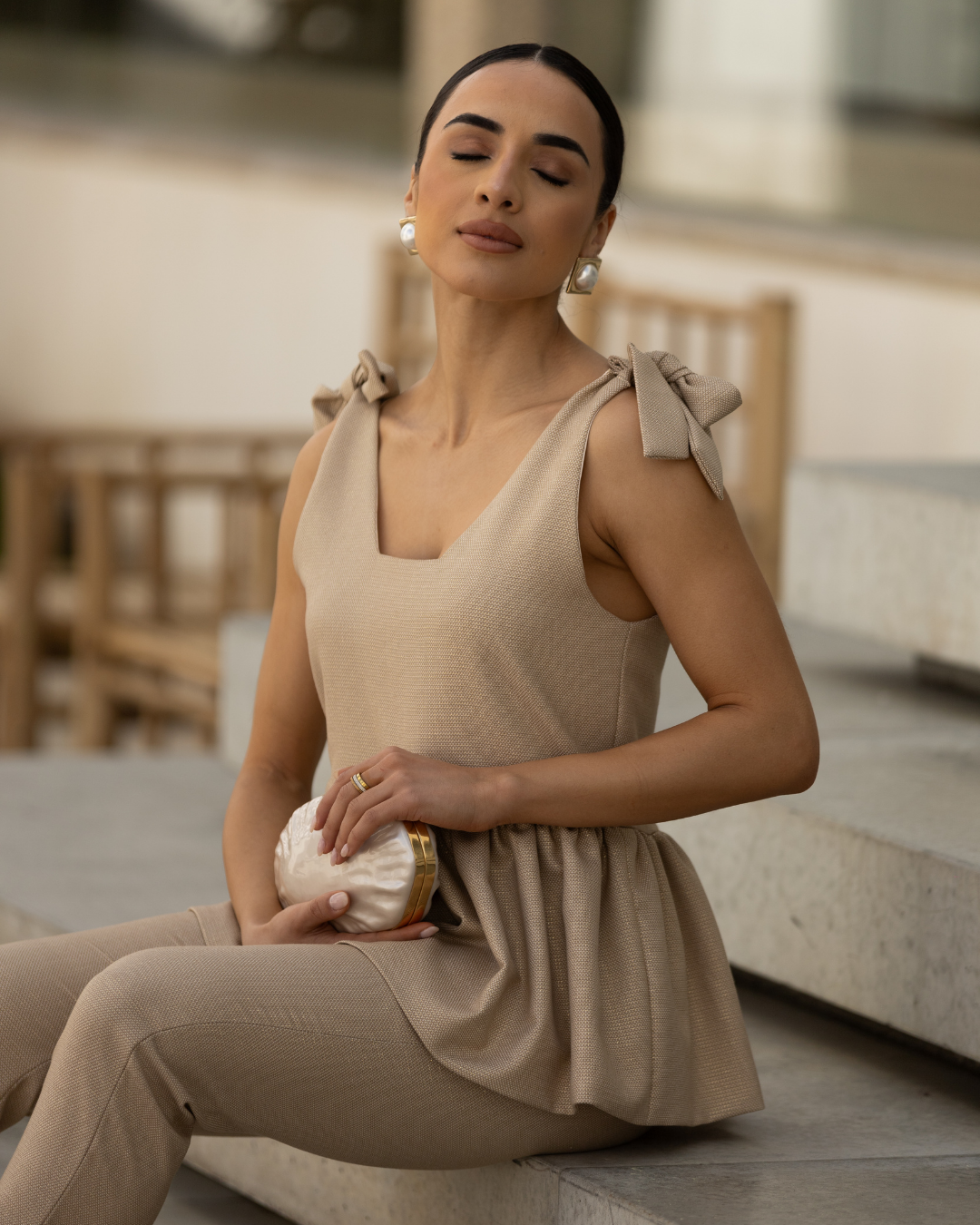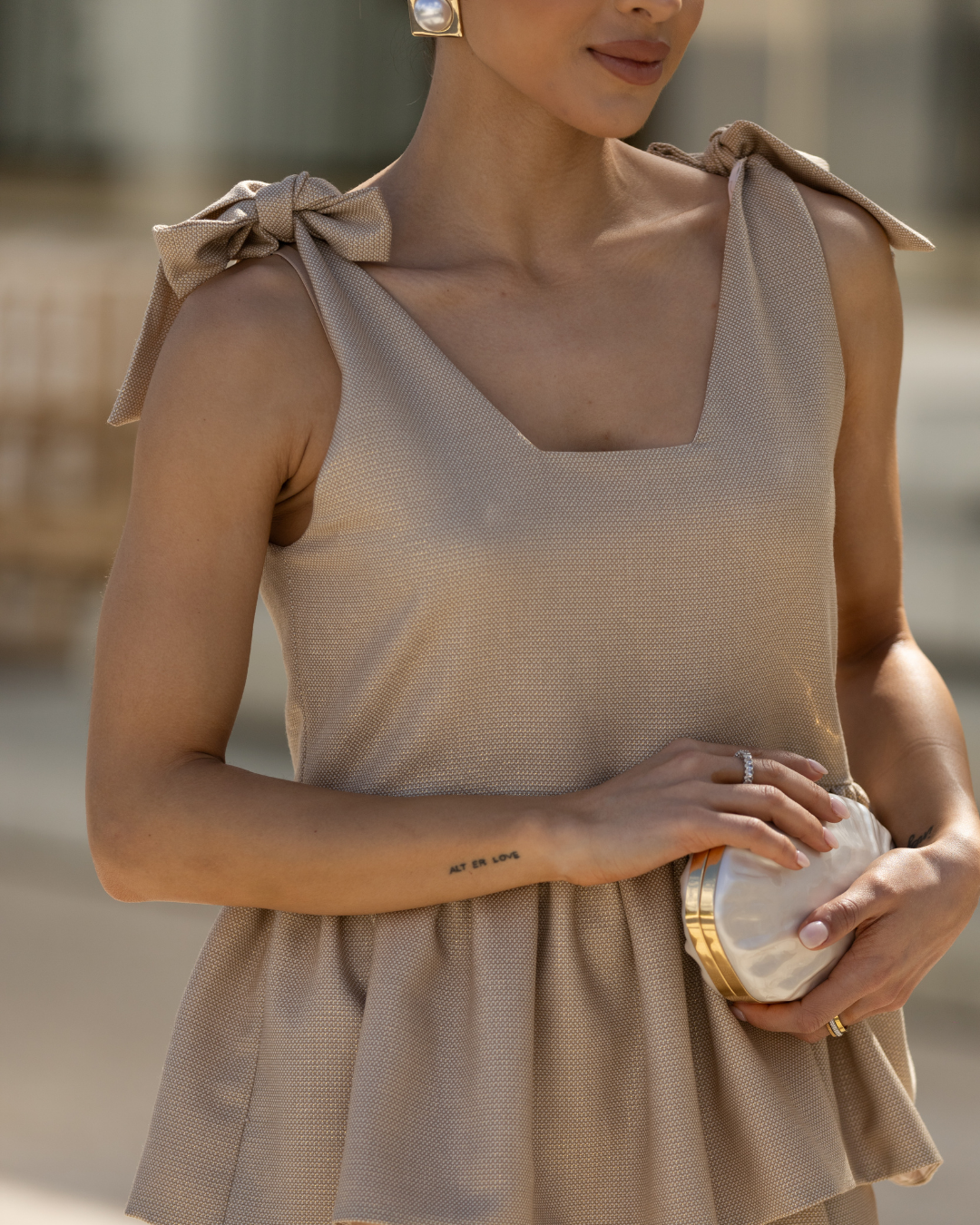 Top bege com efeito lurex (brilho dourado) em tecido estruturado, reversível com folho, com 2 botões forrados no decote em V que permite a abertura, facilitando também a amamentação. Forrado com tecido acetinado sublimado com logótipo da marca, concedendo assim maior conforto e robustez.  Pode usar o decote em V na frente ou nas costas.