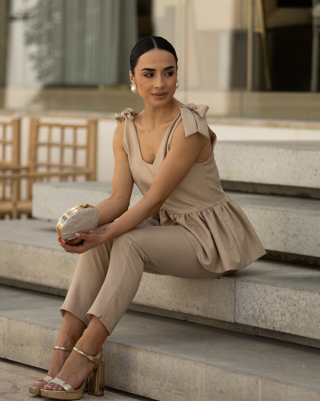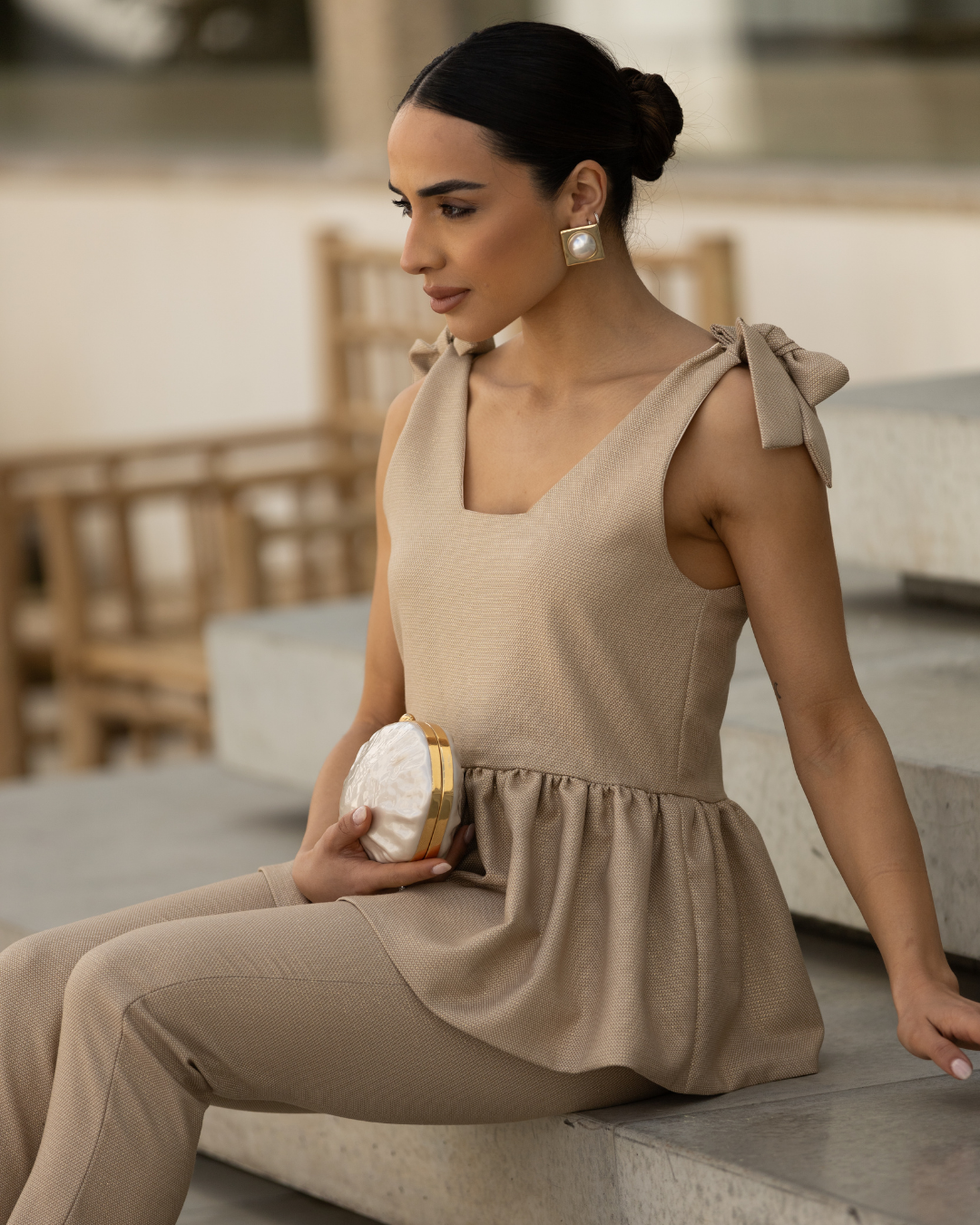 Top beige efecto lurex (brillo dorado) reversible con volante, con 2 botones forrados en el escote en pico que permite abrirlo facilitando también la lactancia. Forrado con tejido satinado sublimado con el logo de la marca, aportando así mayor comodidad y robustez. Puedes usar el escote en V en la parte delantera o trasera.