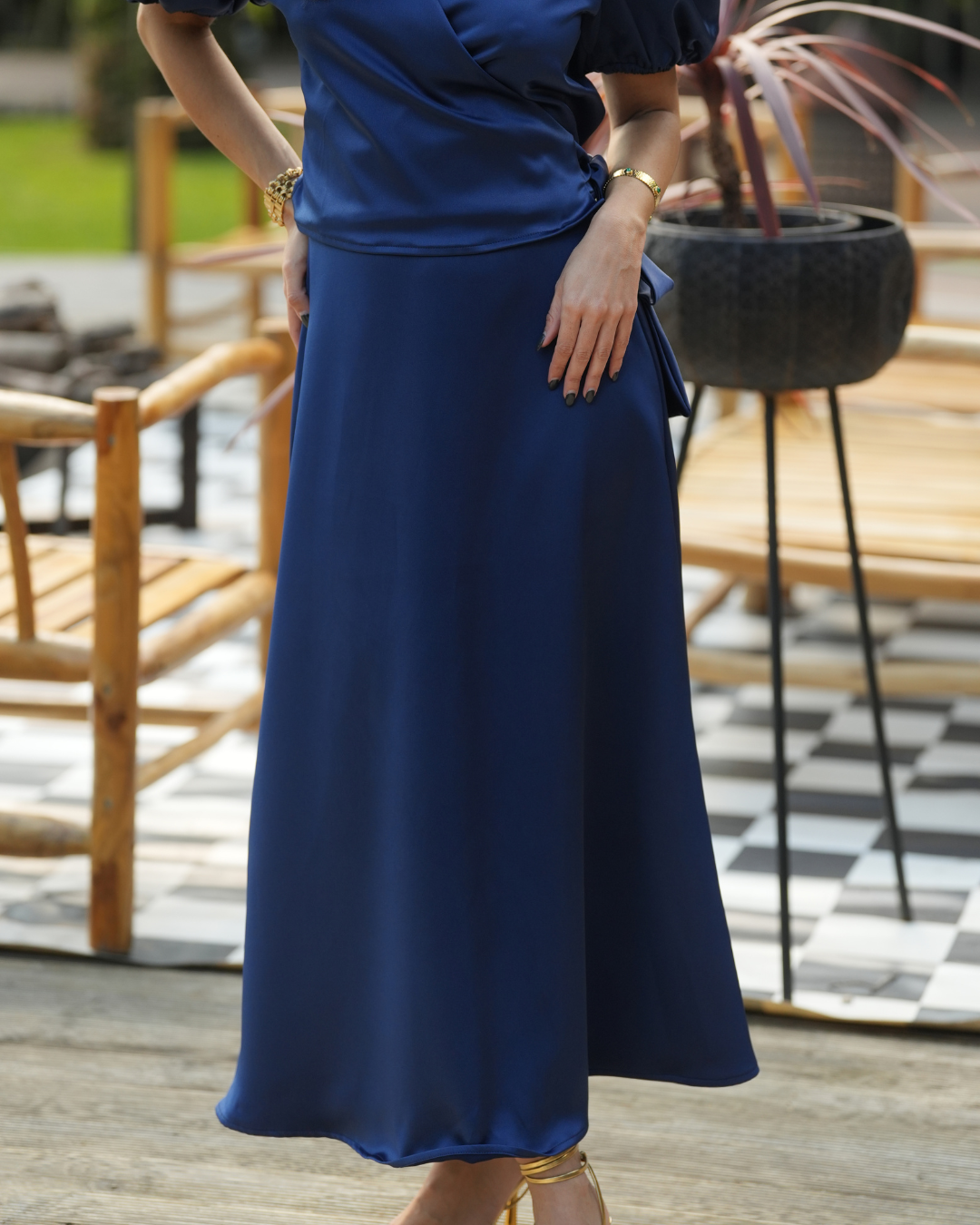 Esta es LA falda de raso perfecta para cualquier cuerpo y etapa de vida que pueda tener una mujer, como podéis ver en la modelo embarazada y se adapta perfectamente. De corte A, de talle alto, con cinturón que tiene efecto pellizco en la cintura para garantizar la apreciación del cuerpo y un ajuste perfecto. Cremallera invisible en la cintura. Gratitud es la palabra bordada en hilo de lúrex dorado.