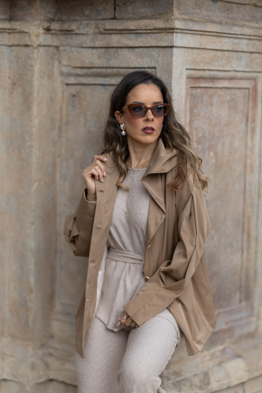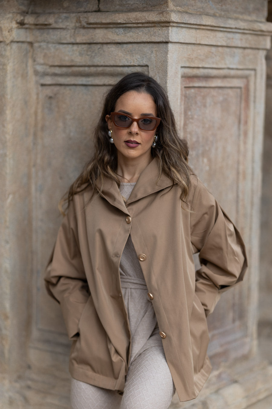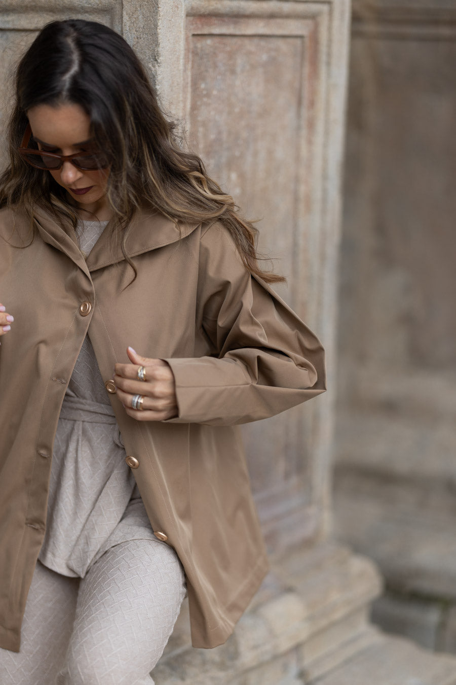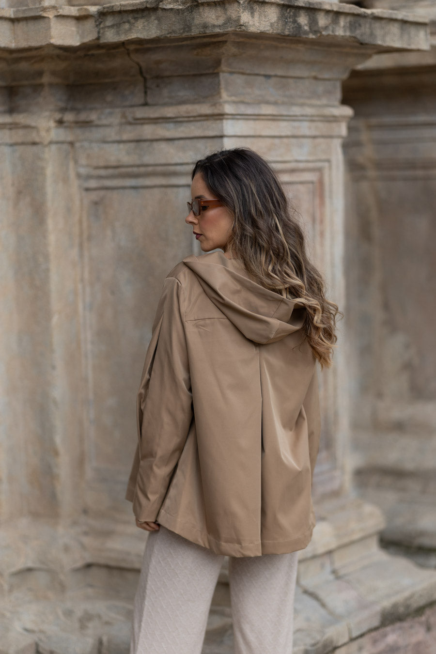 ¡La Parka más única y poderosa está lista para inspirarte! Fabricada en tejido repelente al agua, con capucha. Con una apertura en forma de A, contiene 4 botones dorados de primera calidad con ribete negro. Mangas largas abullonadas con efecto plisado que terminan en puño. En la parte trasera tiene un efecto masculino para un ajuste más sofisticado.