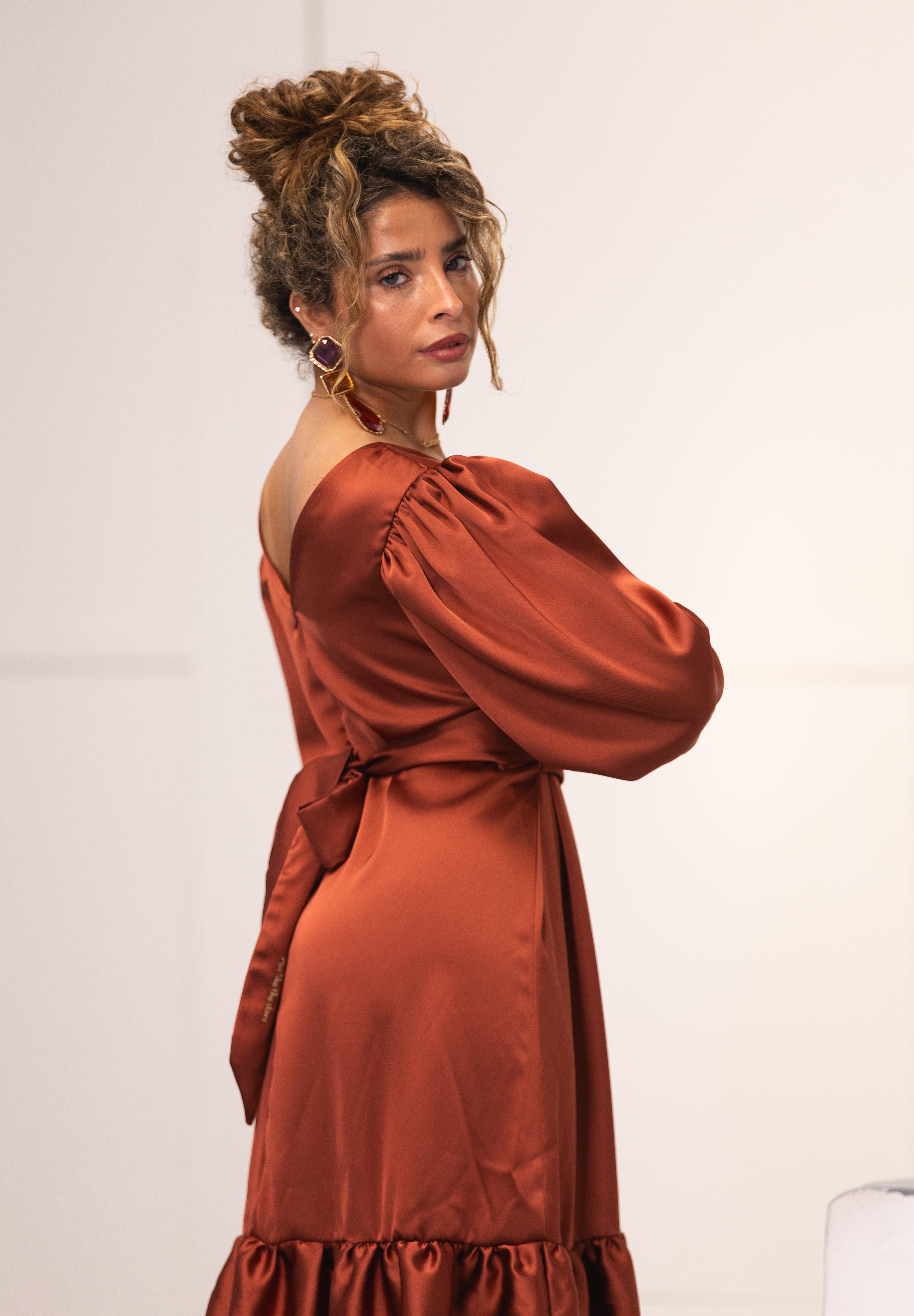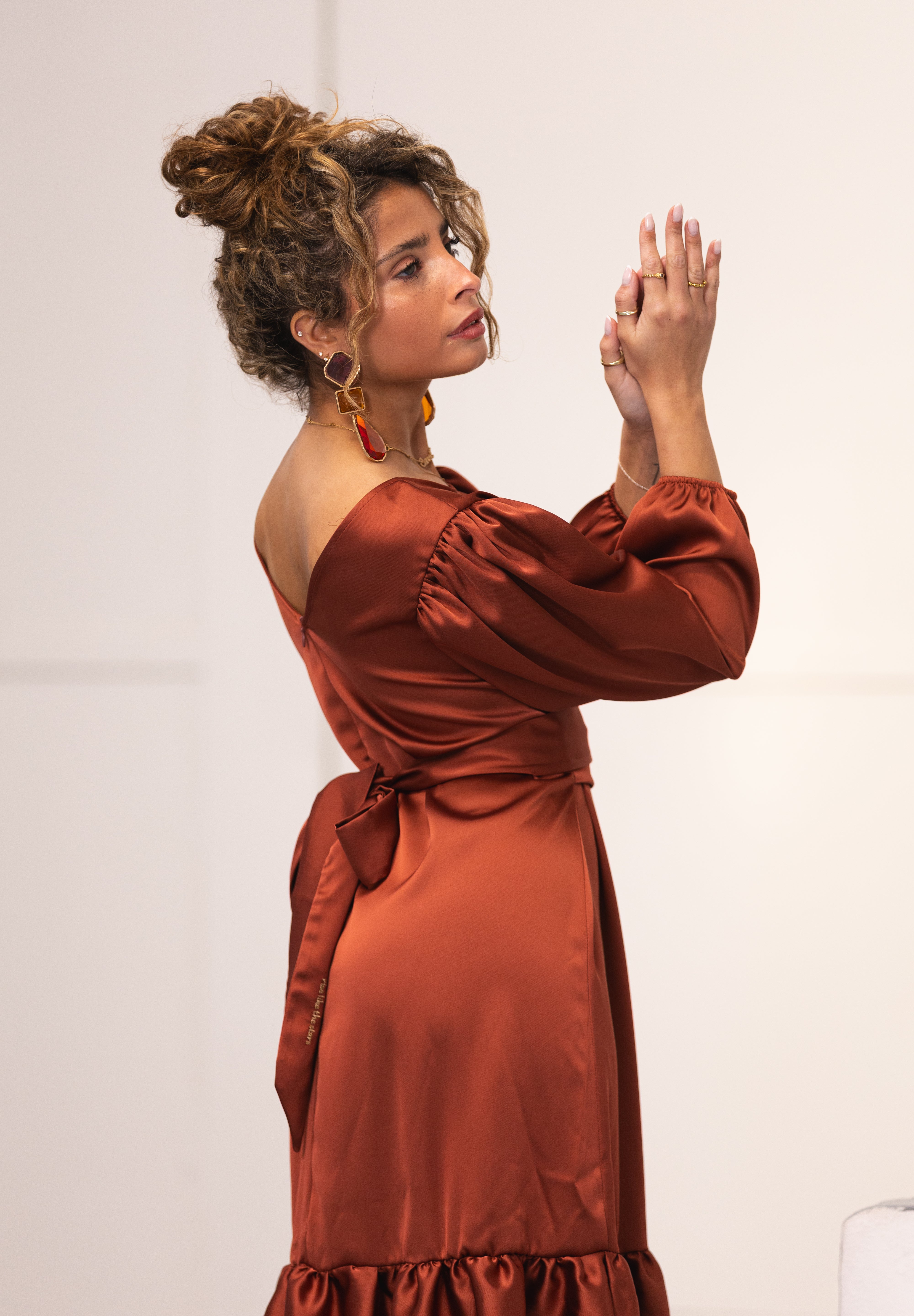 Vestido midi com folho, com decote redondo na frente e nas costas contém decote ligeiro em V. Fecho invisível pelo cós, que permite usarmos na frente ou nas costas, permitindo assim abertura fácil do decote. Com mangas 3/4 que terminam em elástico franzido que permite usarmos a manga mais comprida ou versão curta. Podemos usar, no mínimo 8 formas diferentes, através dos decotes, das diferentes formas de usarmos o cinto/laço e das mangas. Encontra no cinto a afirmação Rise Like The Stars bordada em linha lurex.