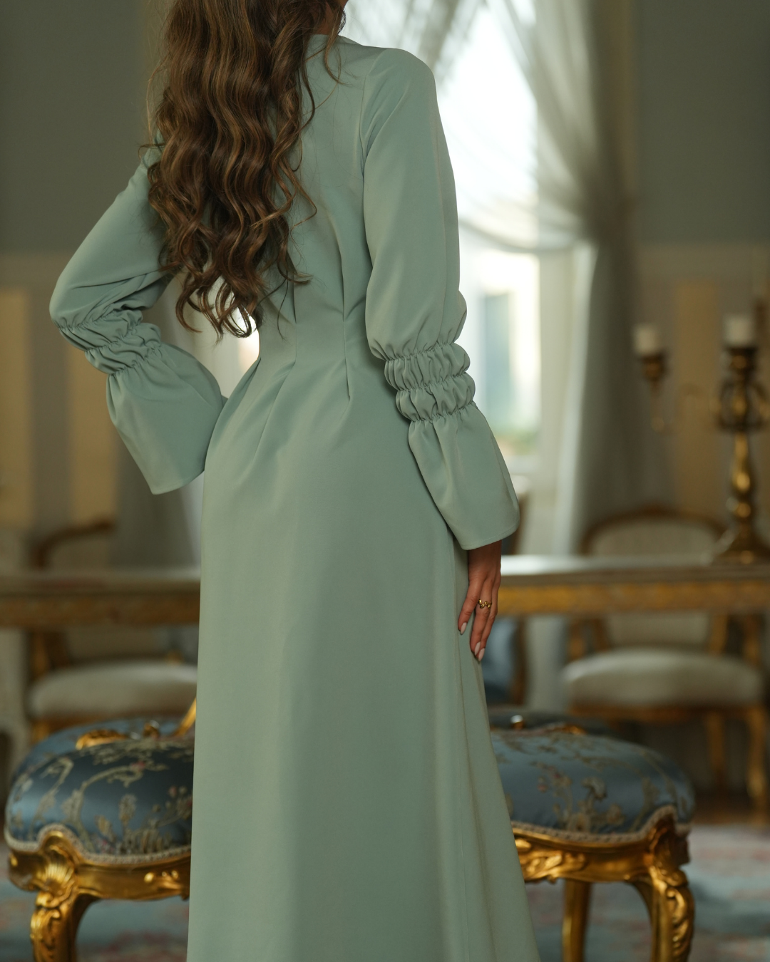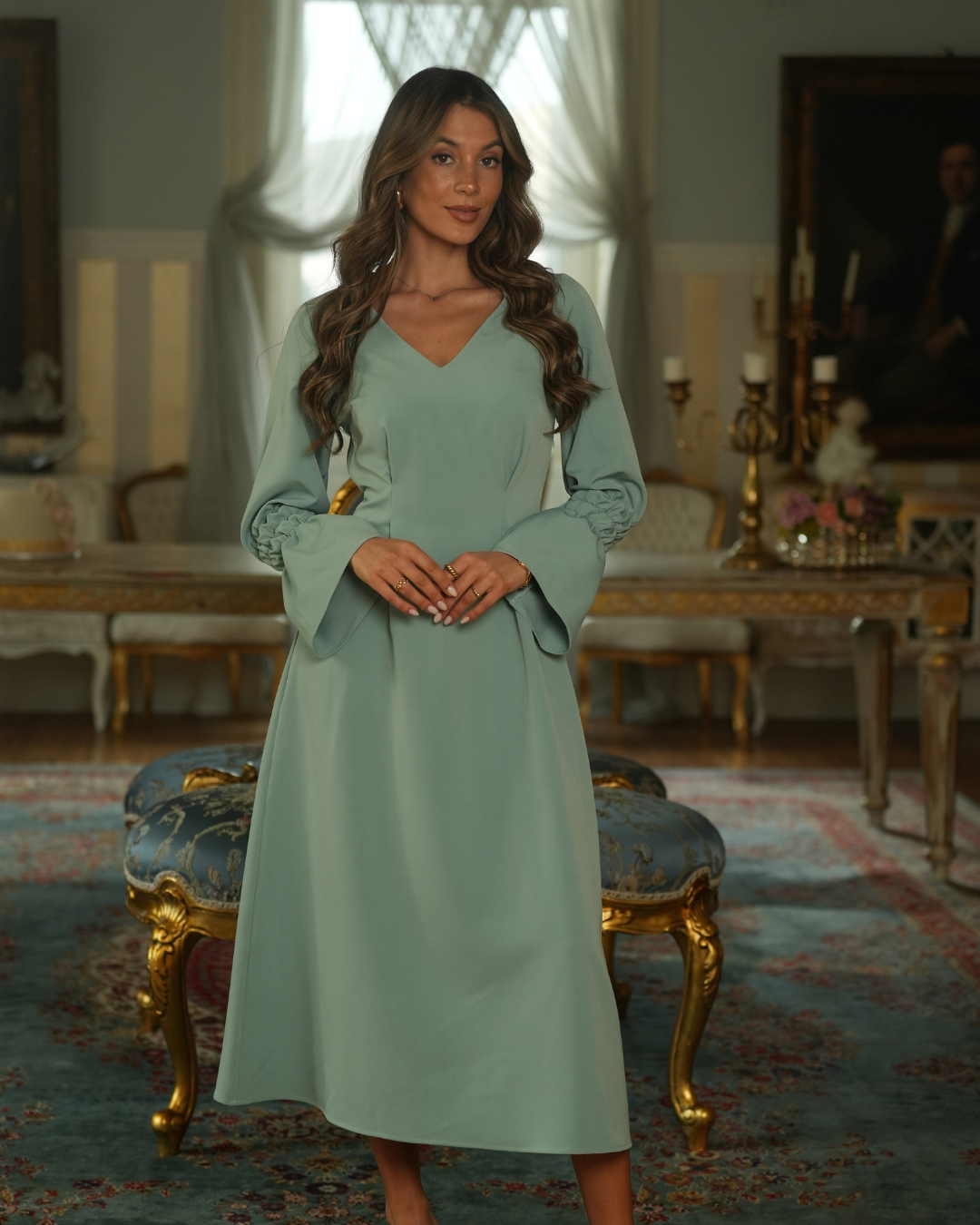 Vestido midi con efecto pinzas en la parte delantera y trasera para una silueta más ajustada. Escote en pico. Mangas largas con elástico que también se pueden llevar más cortas. Cierre de costura lateral invisible.