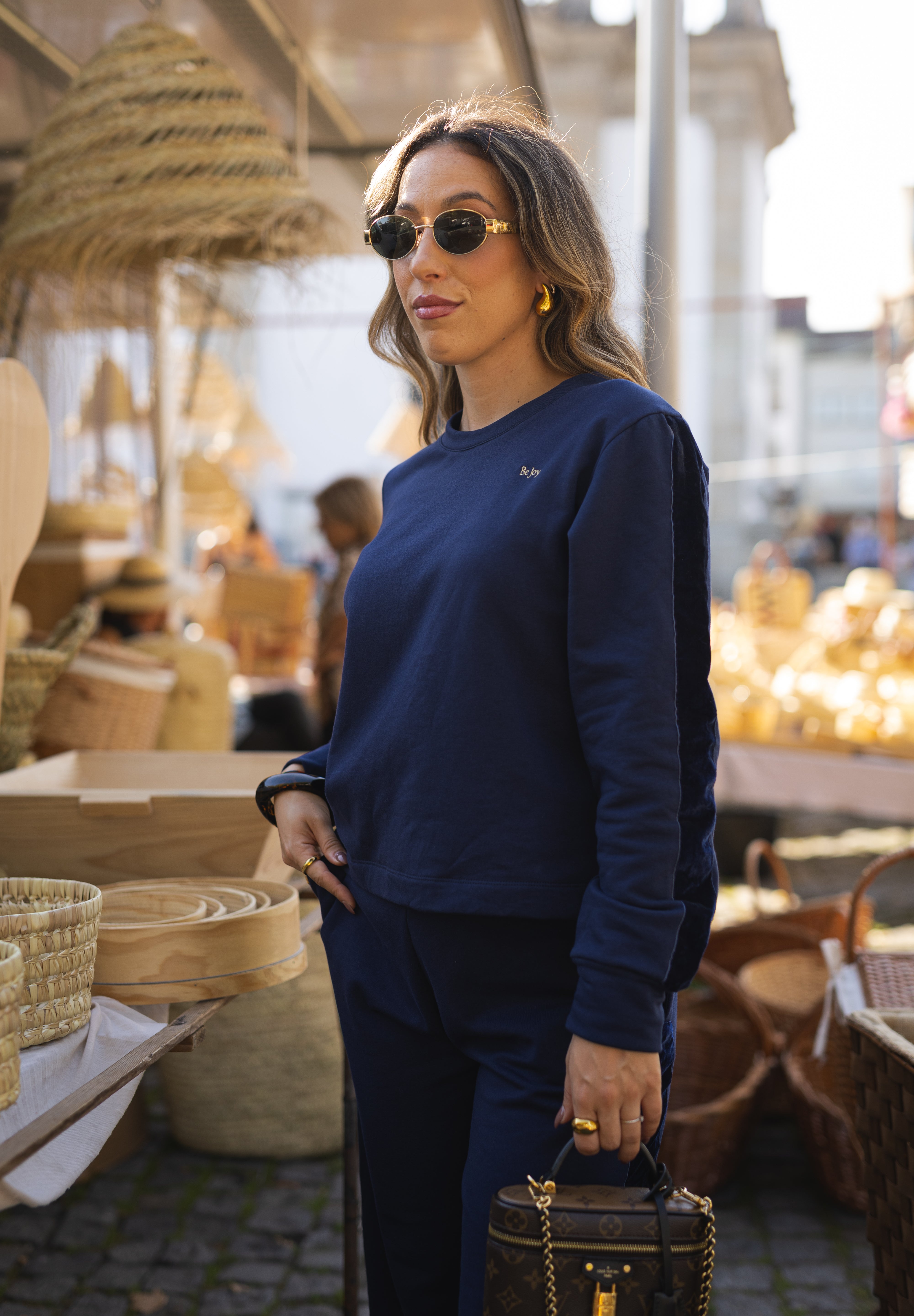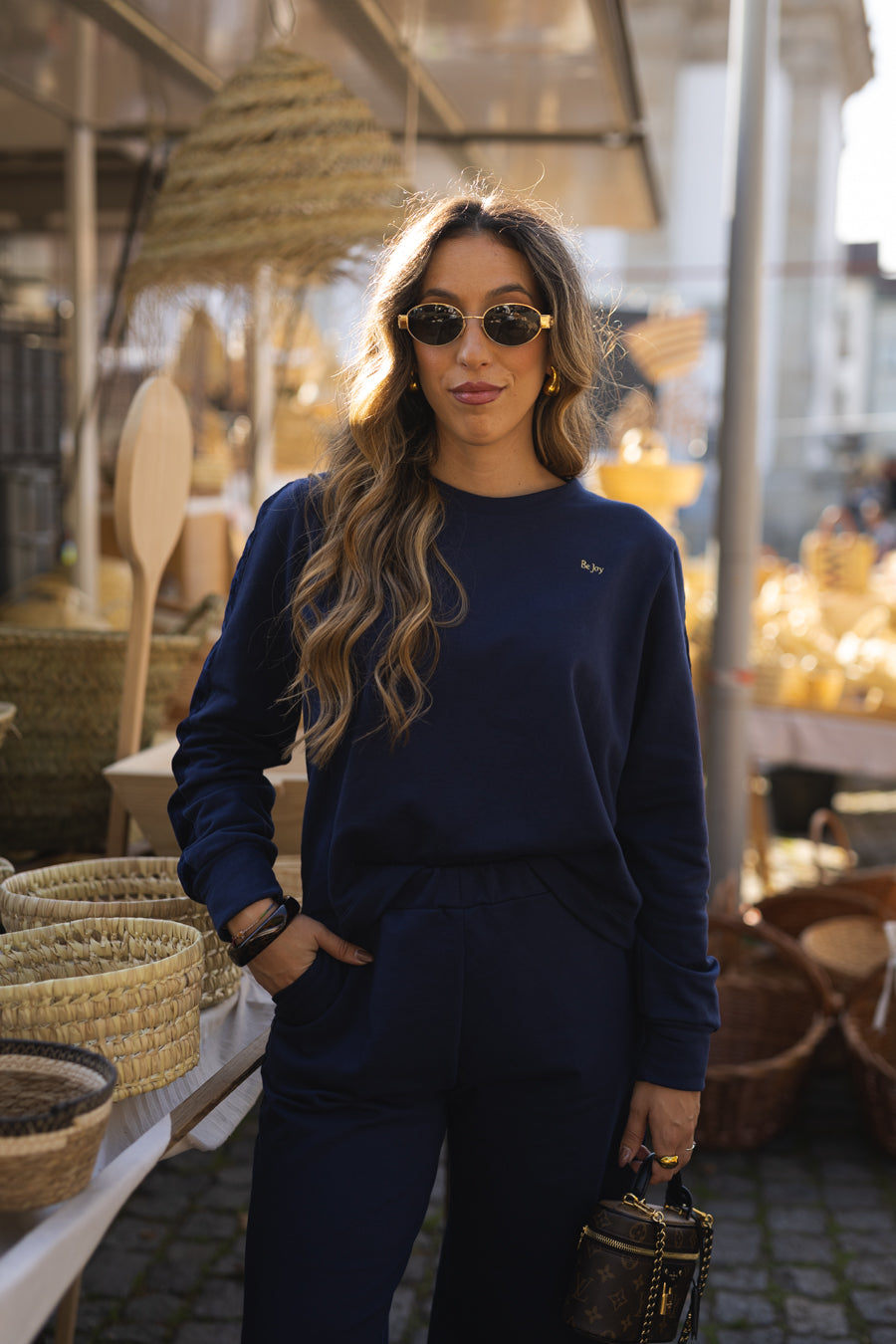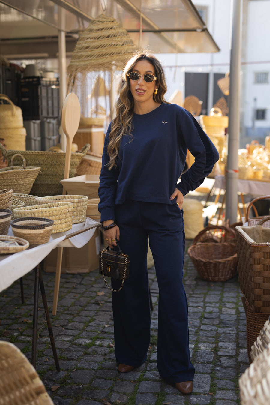 Be Joy Set is the new tracksuit/set that doesn't look like it.  Sweater with high cuffs, with white sequin ribbon detail on the sides of the sleeves, where you can be inspired by the embroidered statement Be Joy in white lurex thread.  Wide leg style straps, with pockets , high elastic waist, with white sequin ribbons on the sides . These 3 meters of sequin ribbon sewn all over the set give it greater glamour and difference.