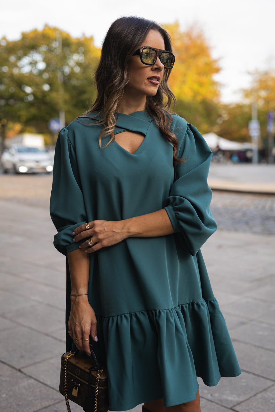 A-line dress with a round neckline at the front and a slight V-neck at the back. In fact, it is 2 in 1 and so you can use it on both sides.