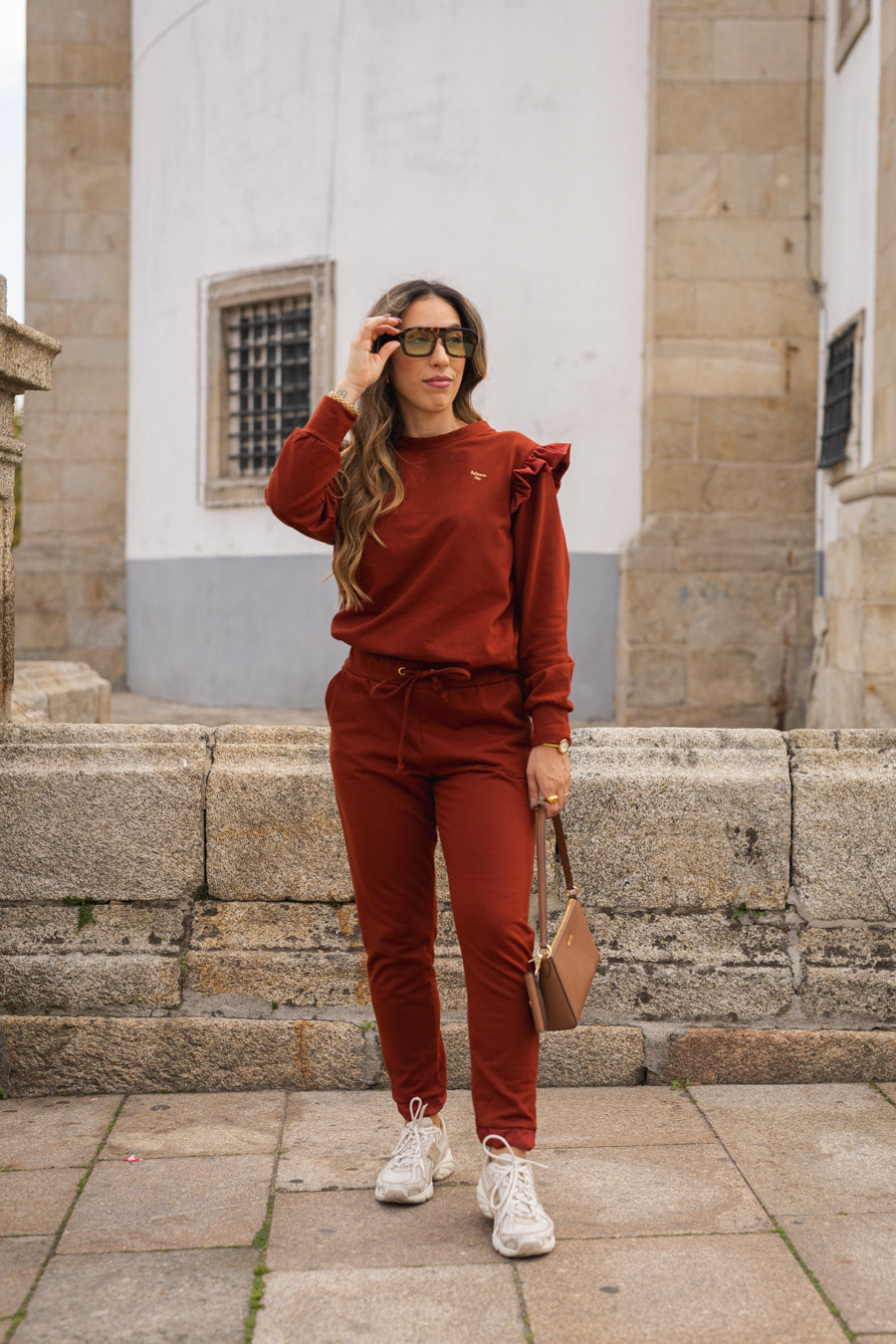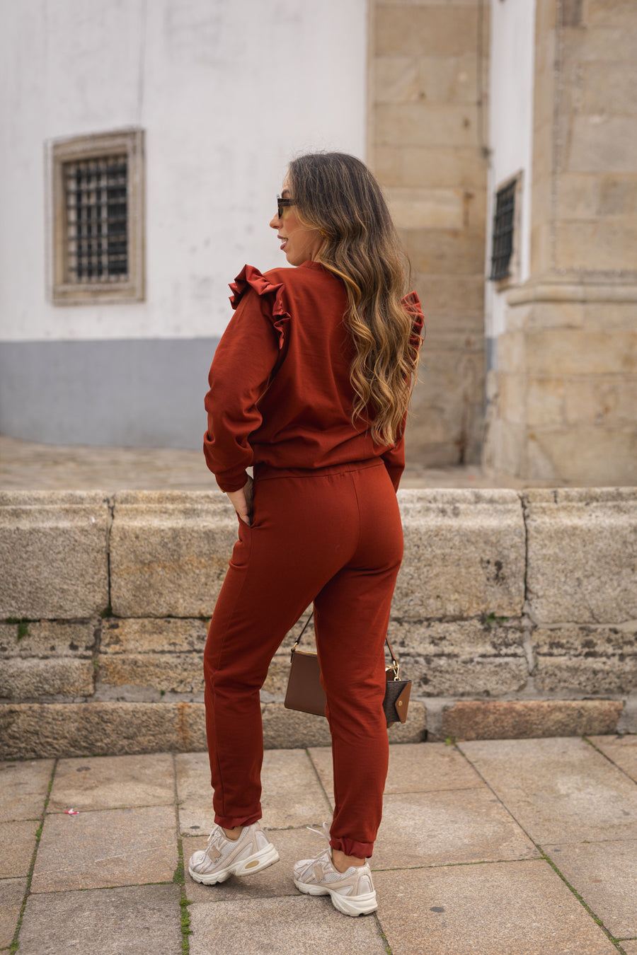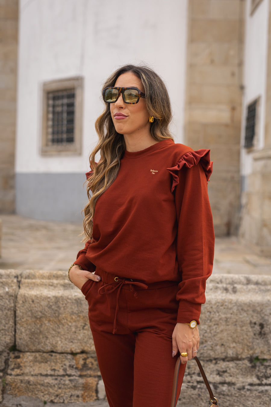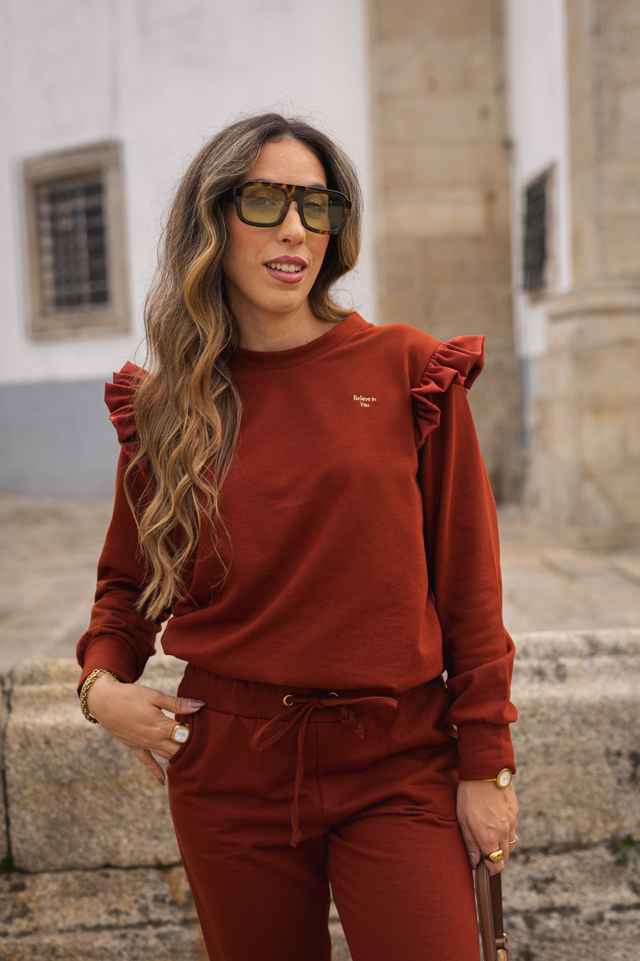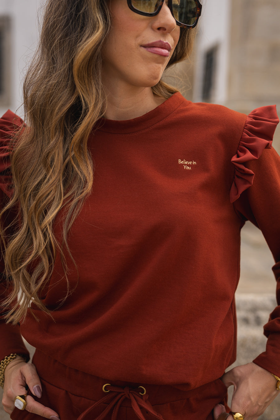 The best-selling 2-piece tracksuit/set since 2020, last at this price. High-cuffed sweater, where you can be inspired by the statement Believe In You embroidered in gold lurex thread on the heart side. Frills on the shoulders in burgundy satin fabric. Trousers with pockets, elasticated waistband with drawstring in burgundy satin fabric. Ankles with elasticated cuffs in burgundy satin fabric