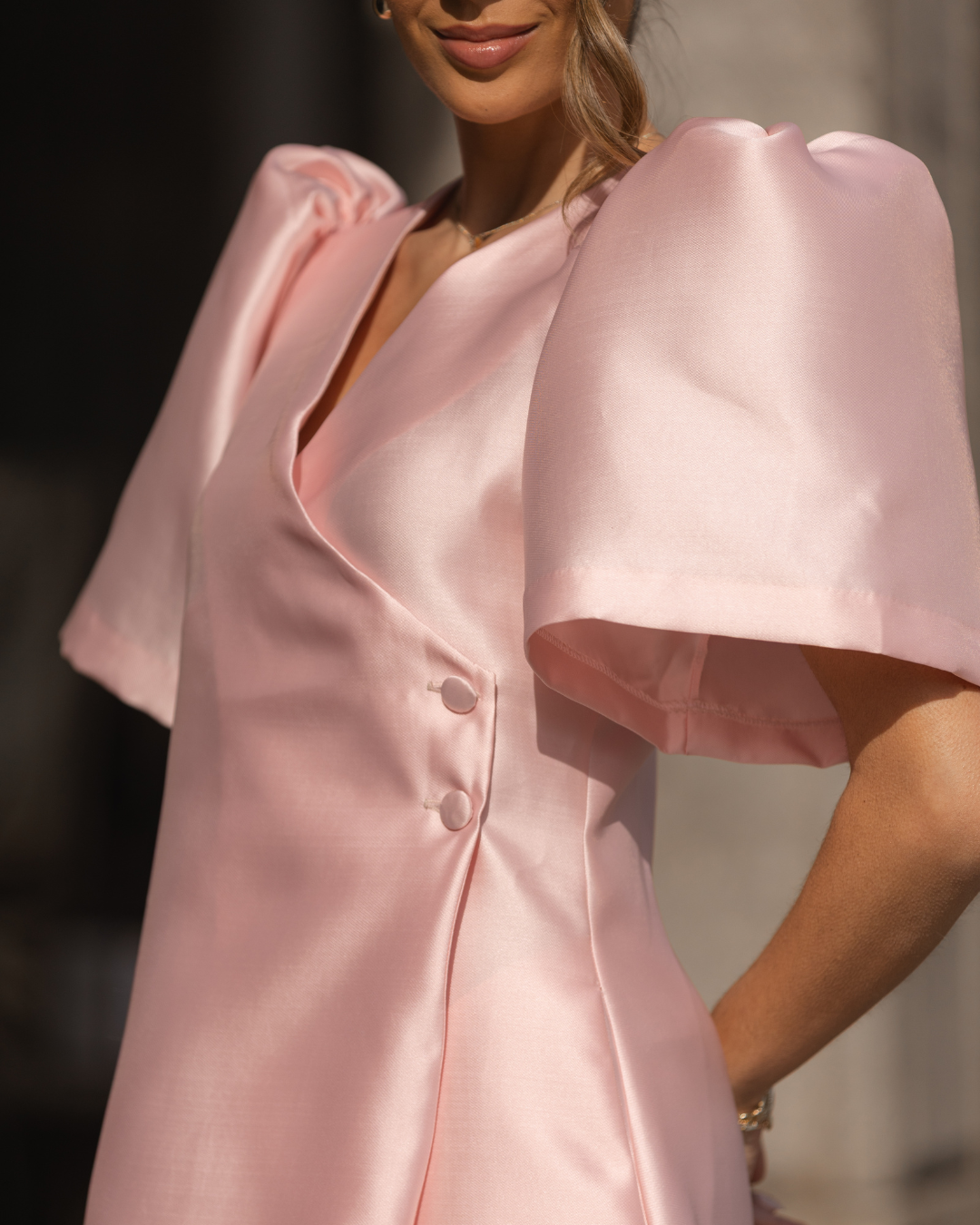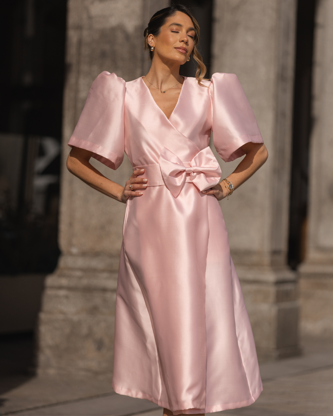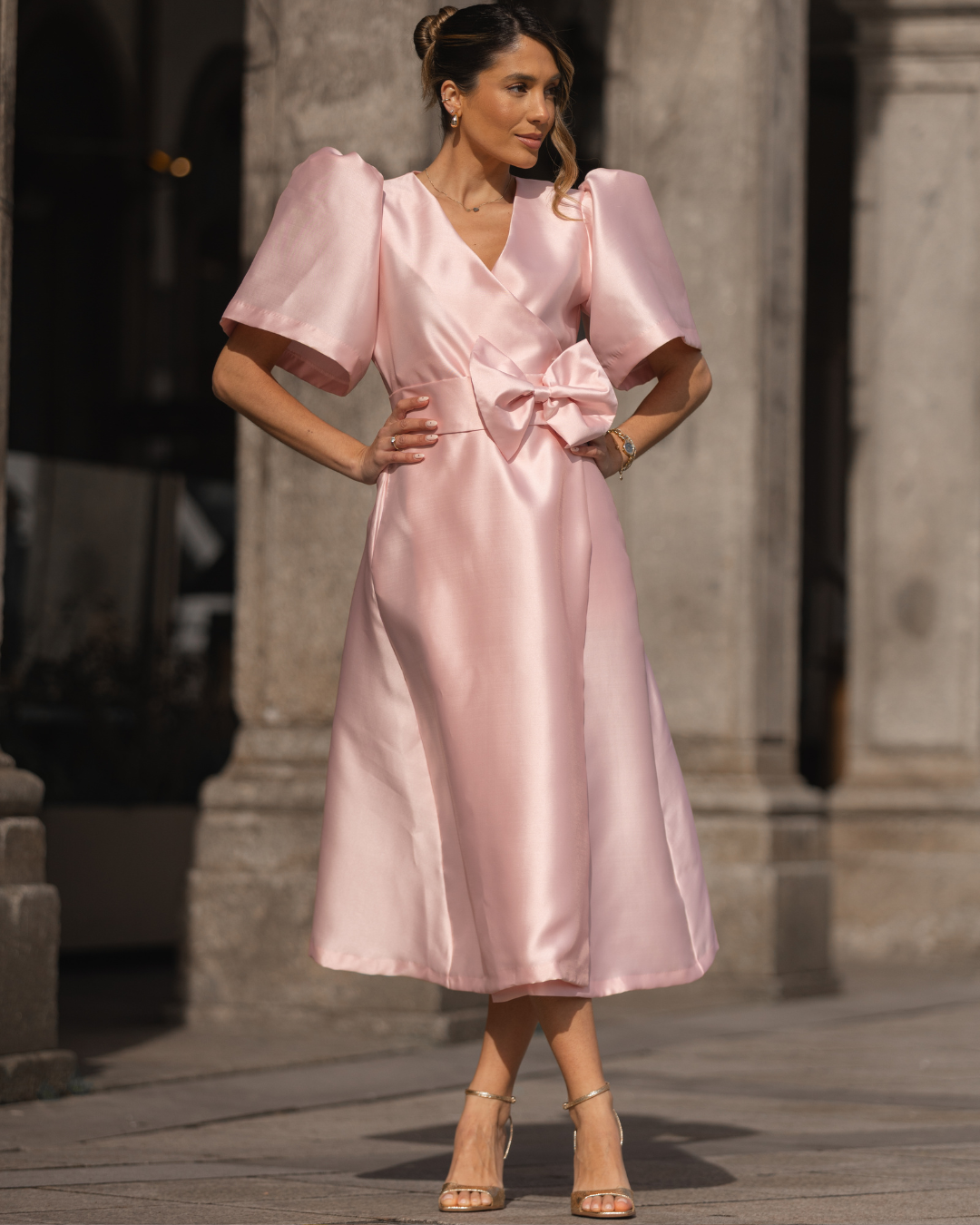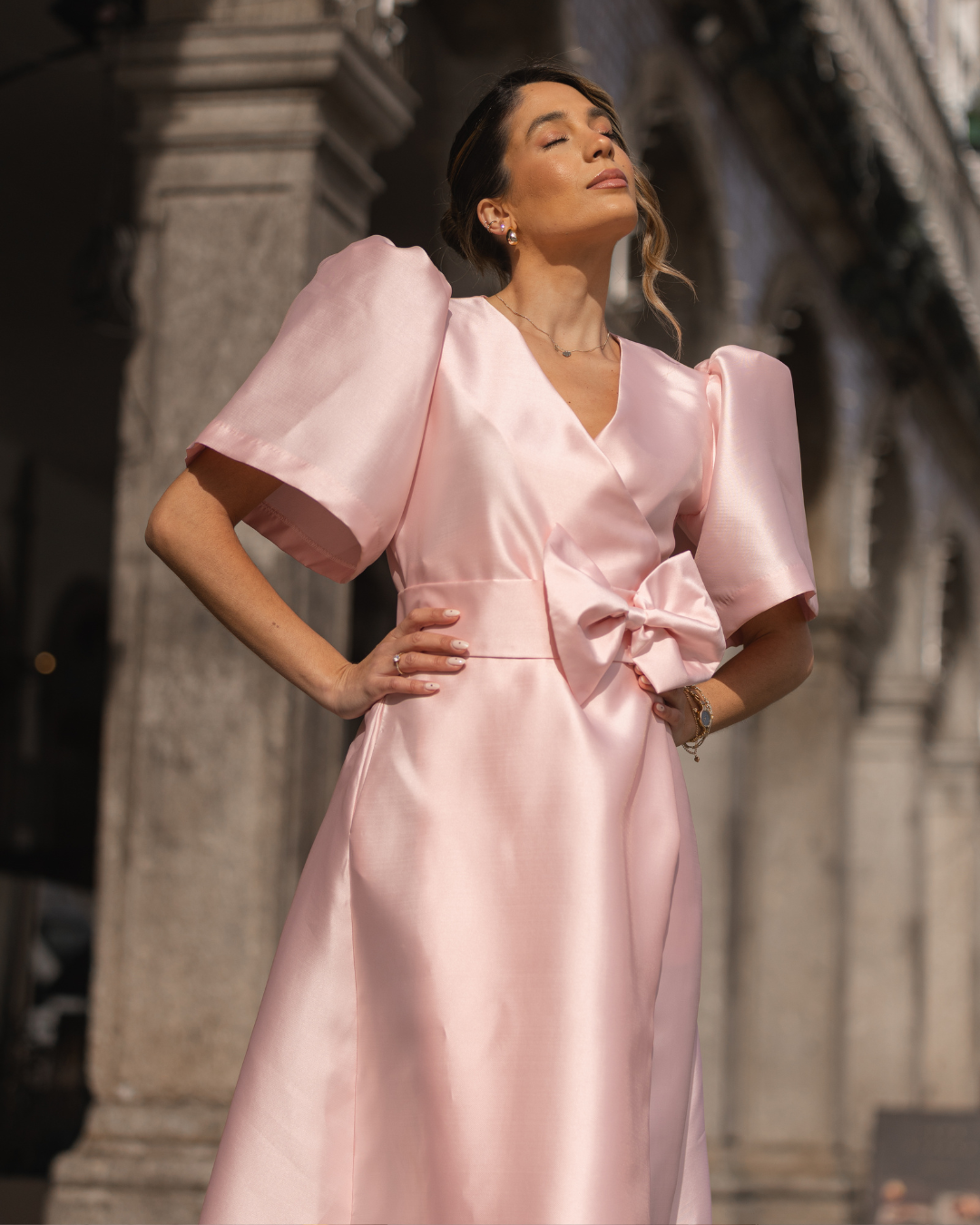 O vestido Bridgerton promete ser o verdadeiro diamante desta temporada. Confecionado em tecido mikado, conhecido pela sua estrutura e elegância, ideal para cerimónias, este vestido combina sofisticação e feminilidade em cada detalhe. As mangas bufantes incluem, no seu interior, um pequeno folho que acrescenta ainda mais estrutura e presença. O decote em bico em trespasse destaca-se pela sua elegância intemporal.