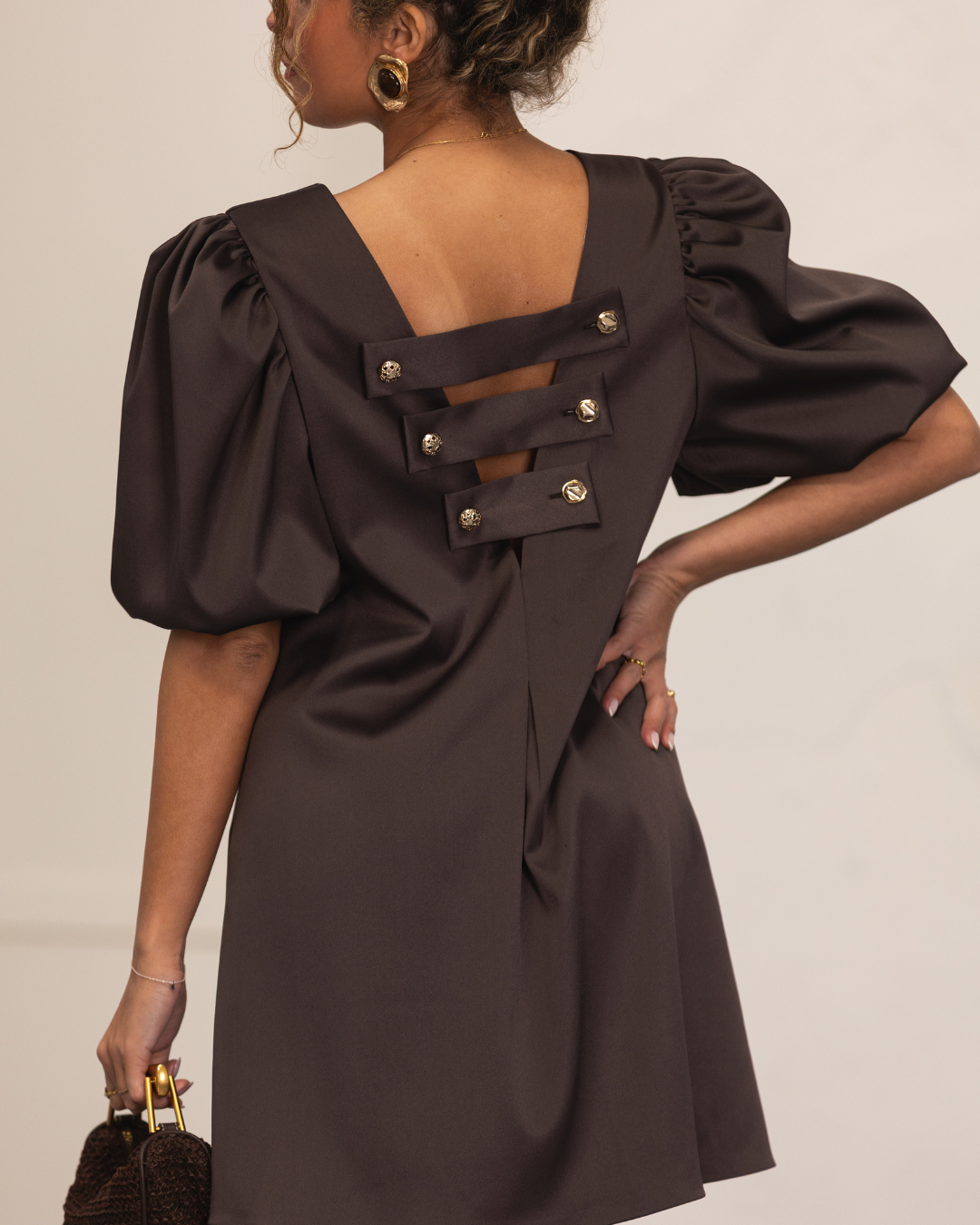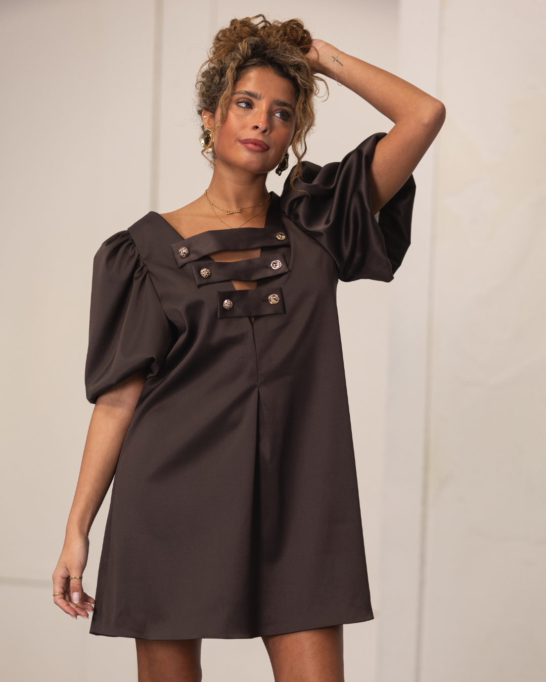 Vestido curto em tecido acetinado encorpado castanho, com detalhes únicos que começam no seu decote em bico, onde se encontram tiras com botões dourados que lhe conferem um toque fashionista e distinto.