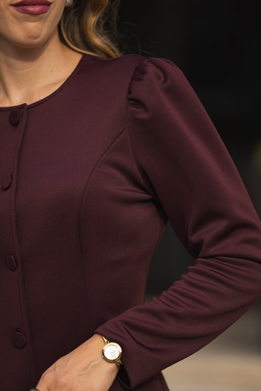 V-neckline at the front, fastens with an invisible zip on the side. Balloon sleeves with cuffs.