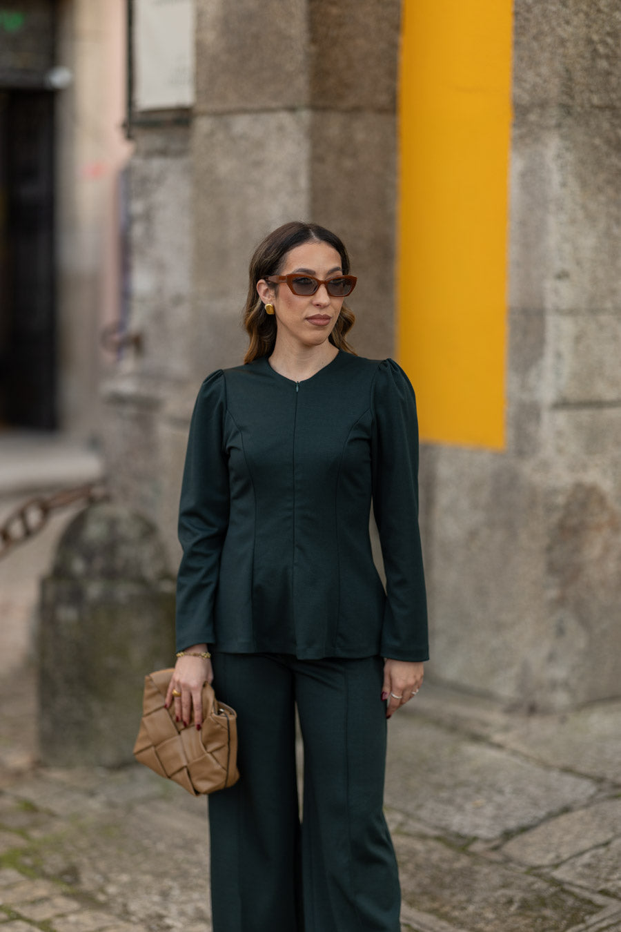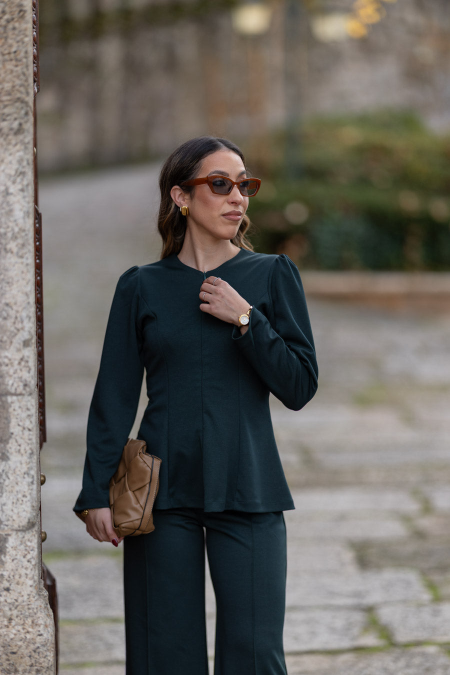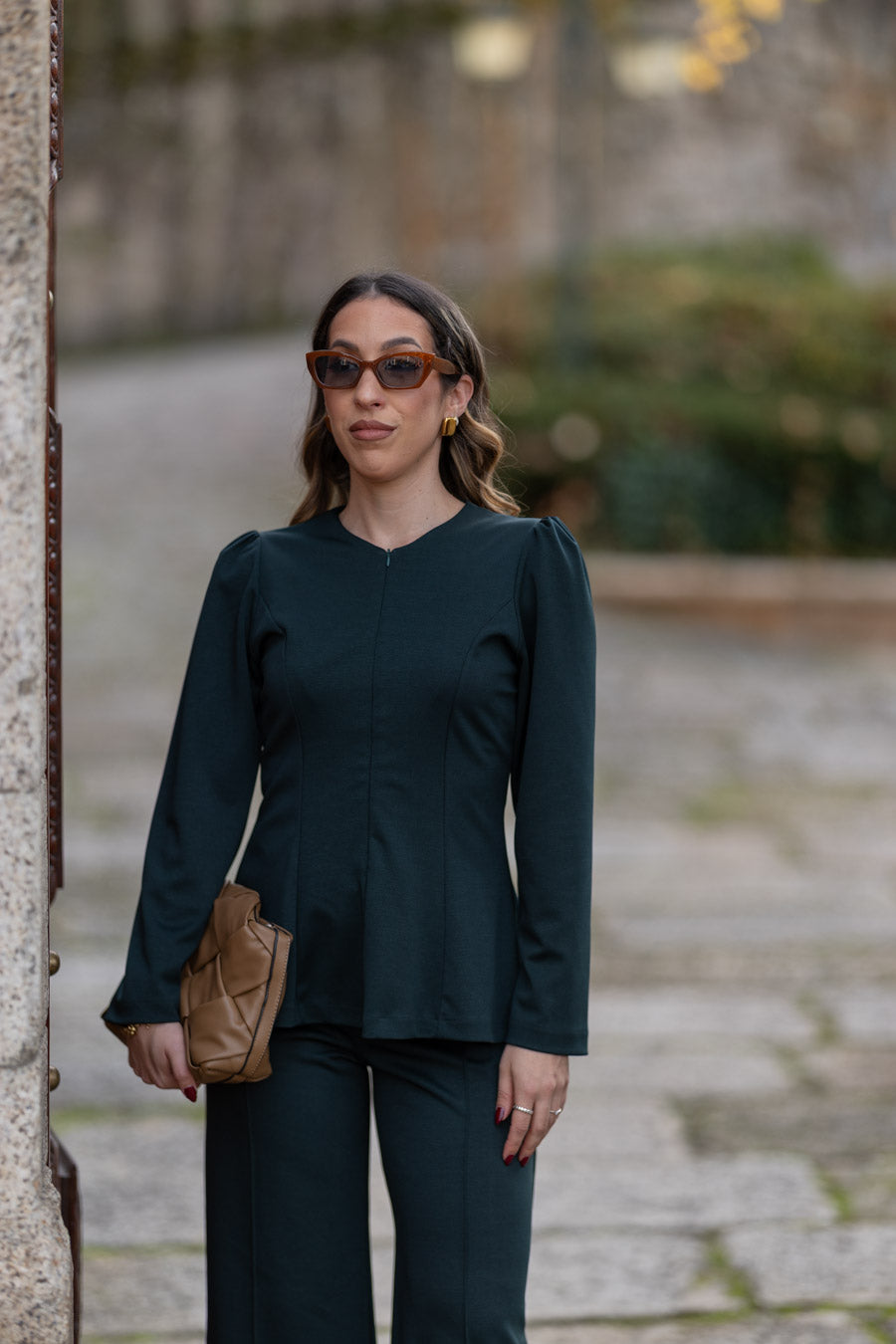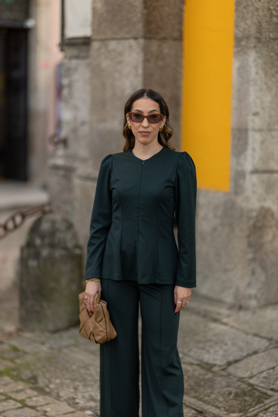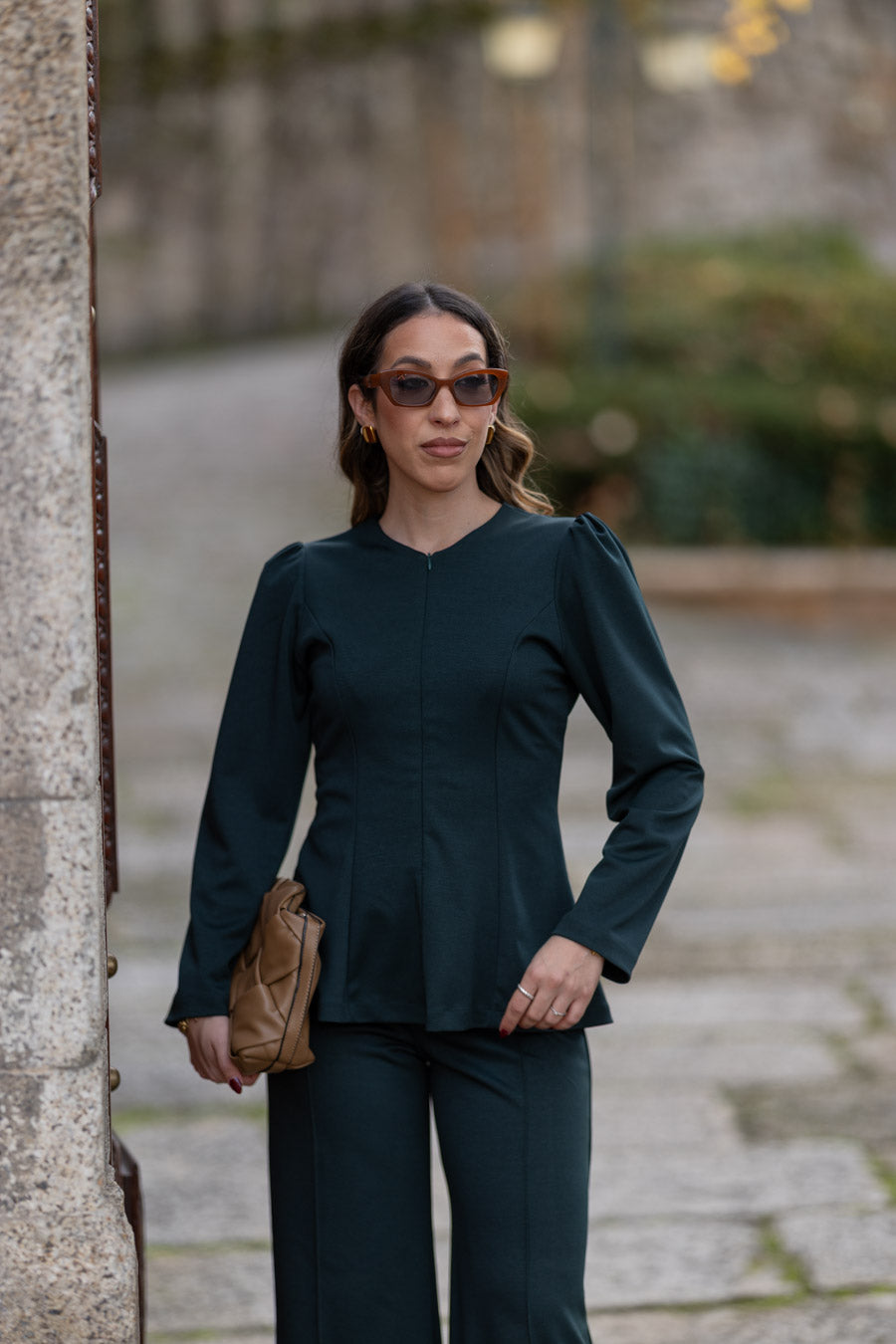 Blusa/casaco em malha ponto roma, uma malha muito confortável e suave, com franzido nos ombros, efeito de pinças à frente e nas costas. Fecho na frente invisível que permite abertura. Cintura mais definida através do seu fitting, o que potencia uma silhueta mais cintada.