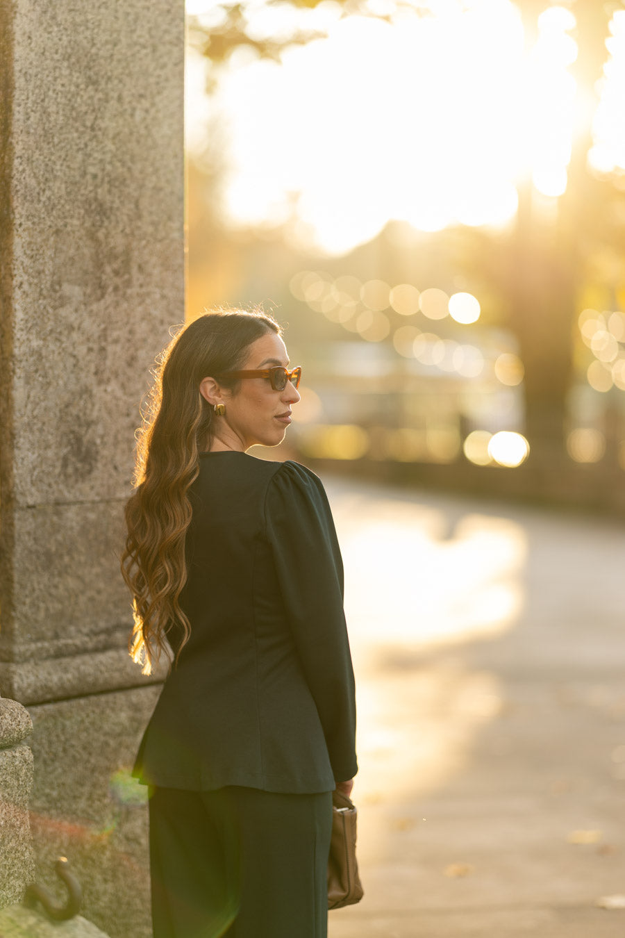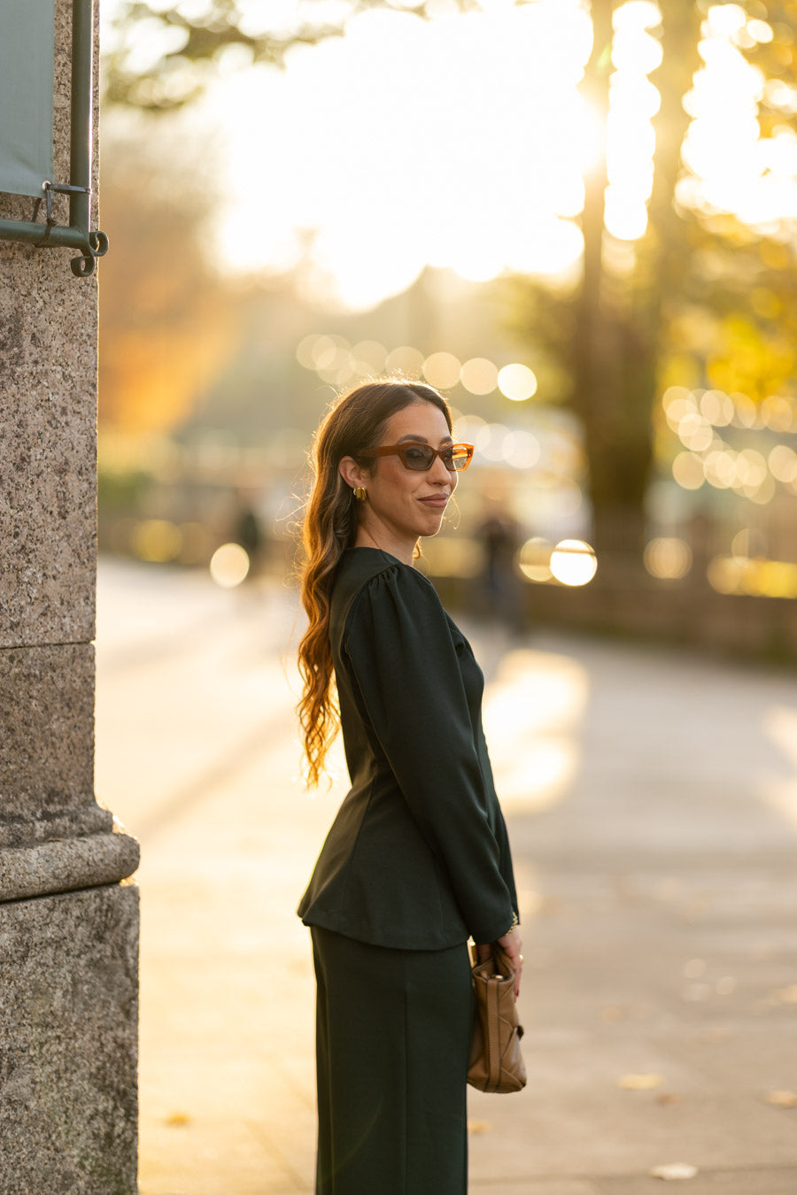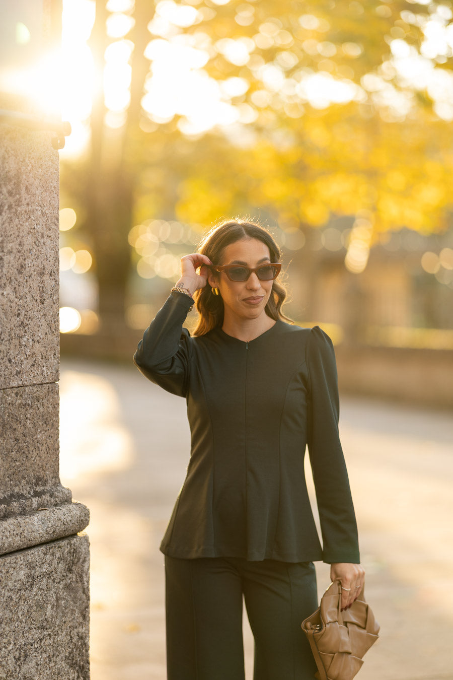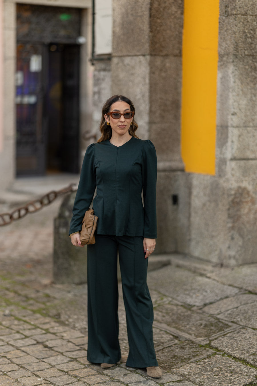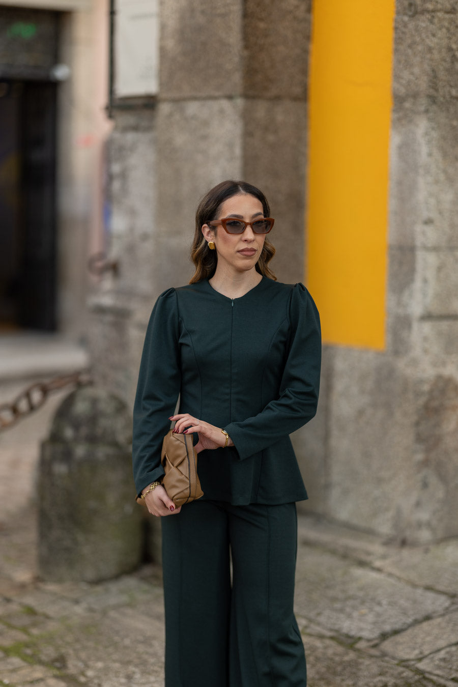 Blusa/casaco em malha ponto roma, uma malha muito confortável e suave, com franzido nos ombros, efeito de pinças à frente e nas costas. Fecho na frente invisível que permite abertura. Cintura mais definida através do seu fitting, o que potencia uma silhueta mais cintada.