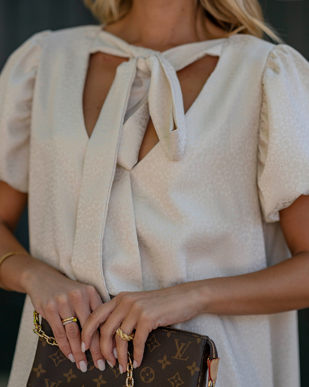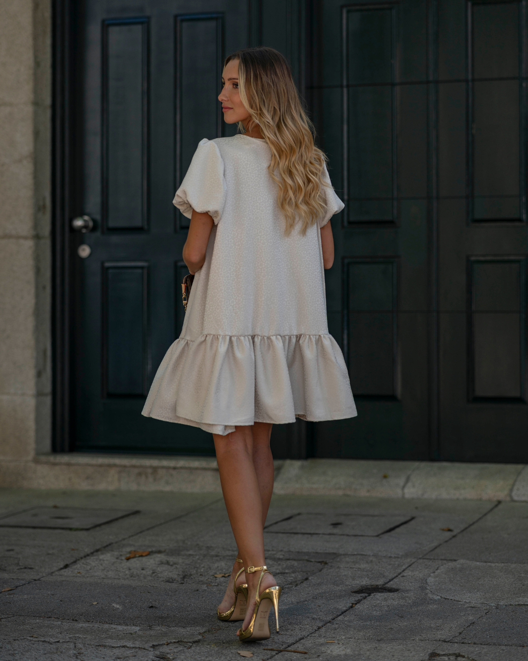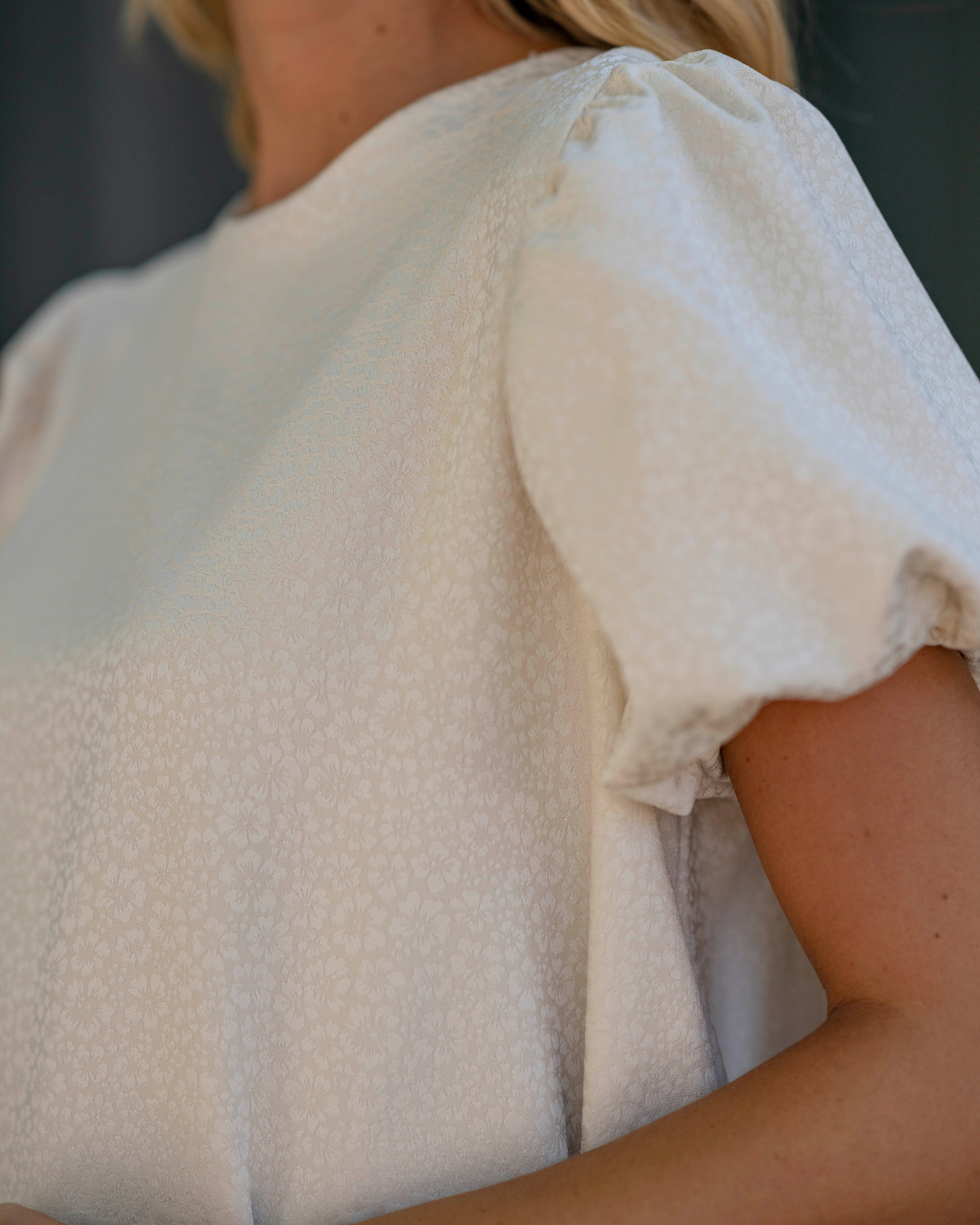 More than 3 metres of unique, premium fabric result in our new dress that portrays female emancipation. In brocade fabric with a subtle and elegant flower pattern. With an A-line opening, reversible, with a V-neckline that can be worn at the front or back. Ribbons at the neckline, to tie in a knot or bow. Short puff sleeves with a double effect.