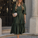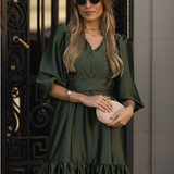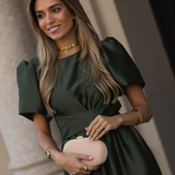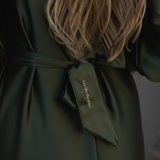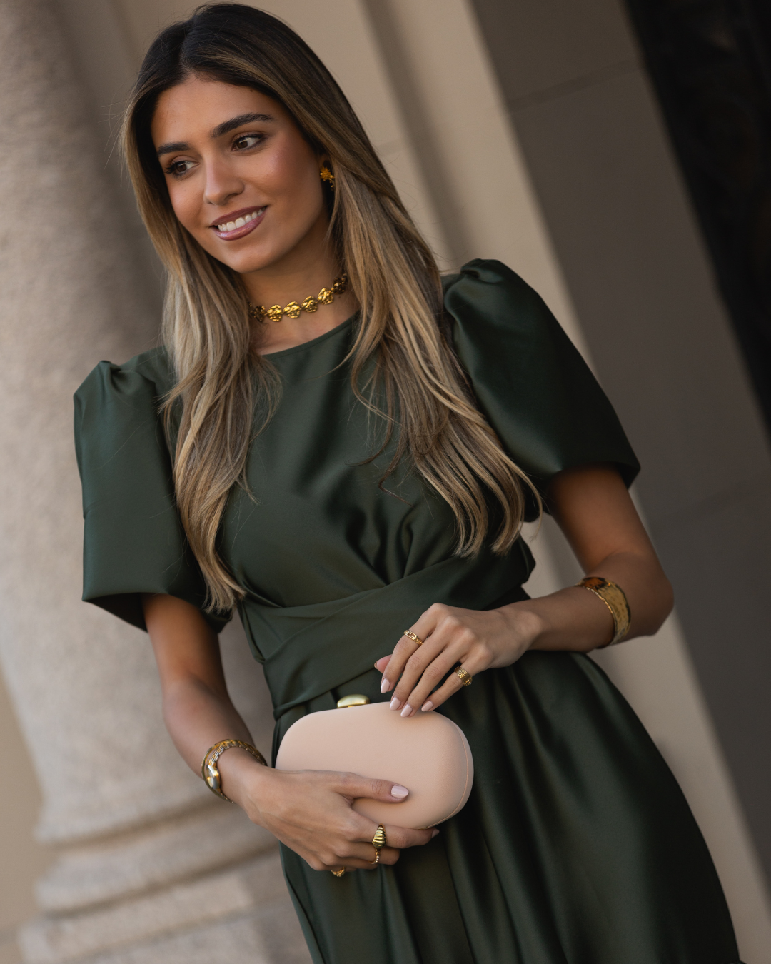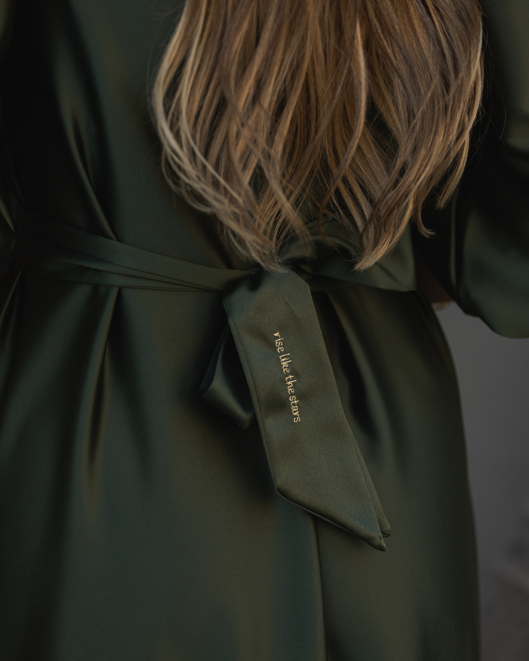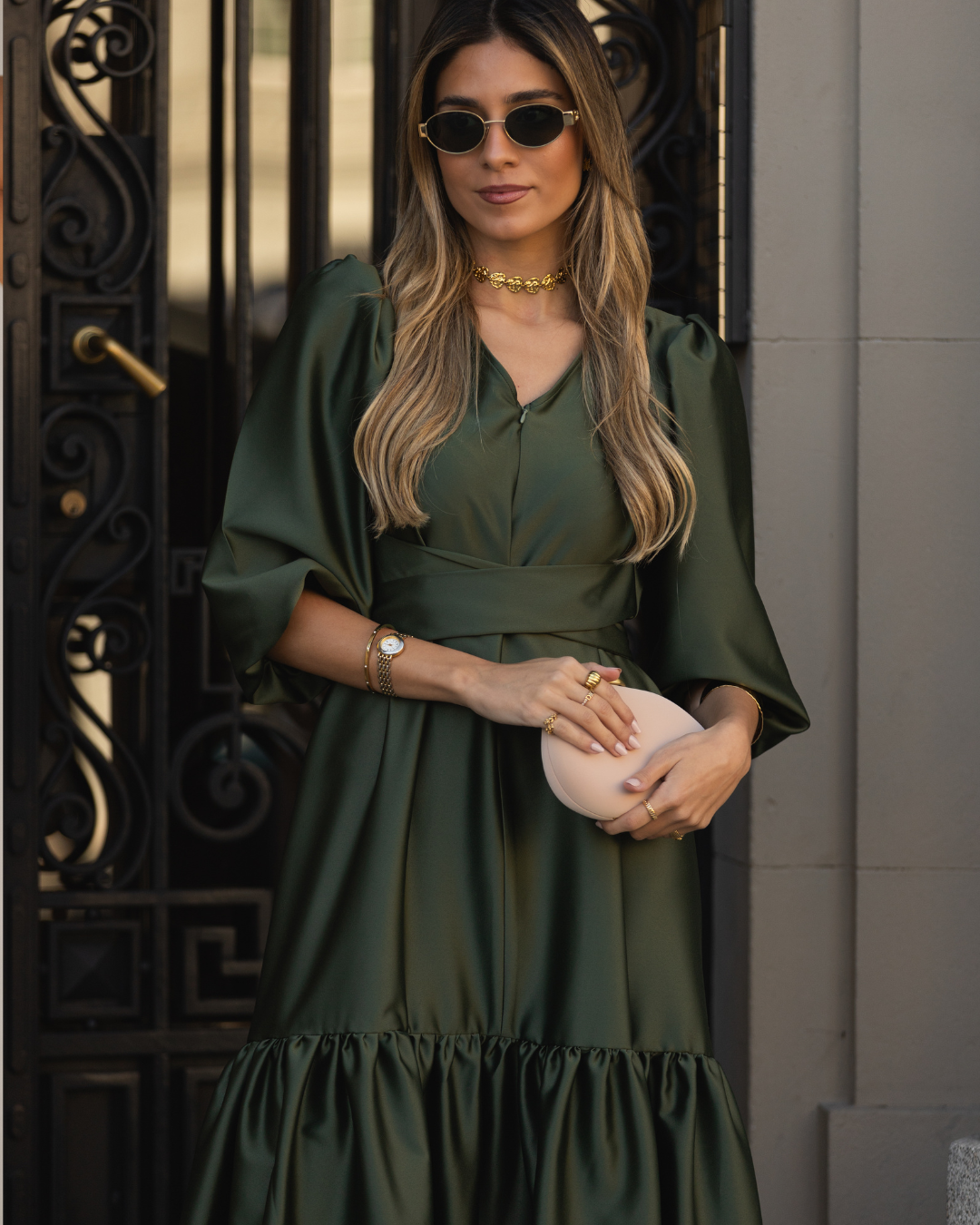 Midi dress with ruffles, round neckline at the front and back, with a slight V-neckline. Invisible fastening at the waist, which allows it to be worn at the front or back, thus allowing the neckline to be easily opened. With 3/4 sleeves that end in gathered elastic that allows us to wear the sleeves longer or shorter. We can use at least 8 different ways, through the necklines, the different ways of wearing the belt/bow and the sleeves. Find the statement in the belt Rise Like The Stars embroidered in lurex thread.