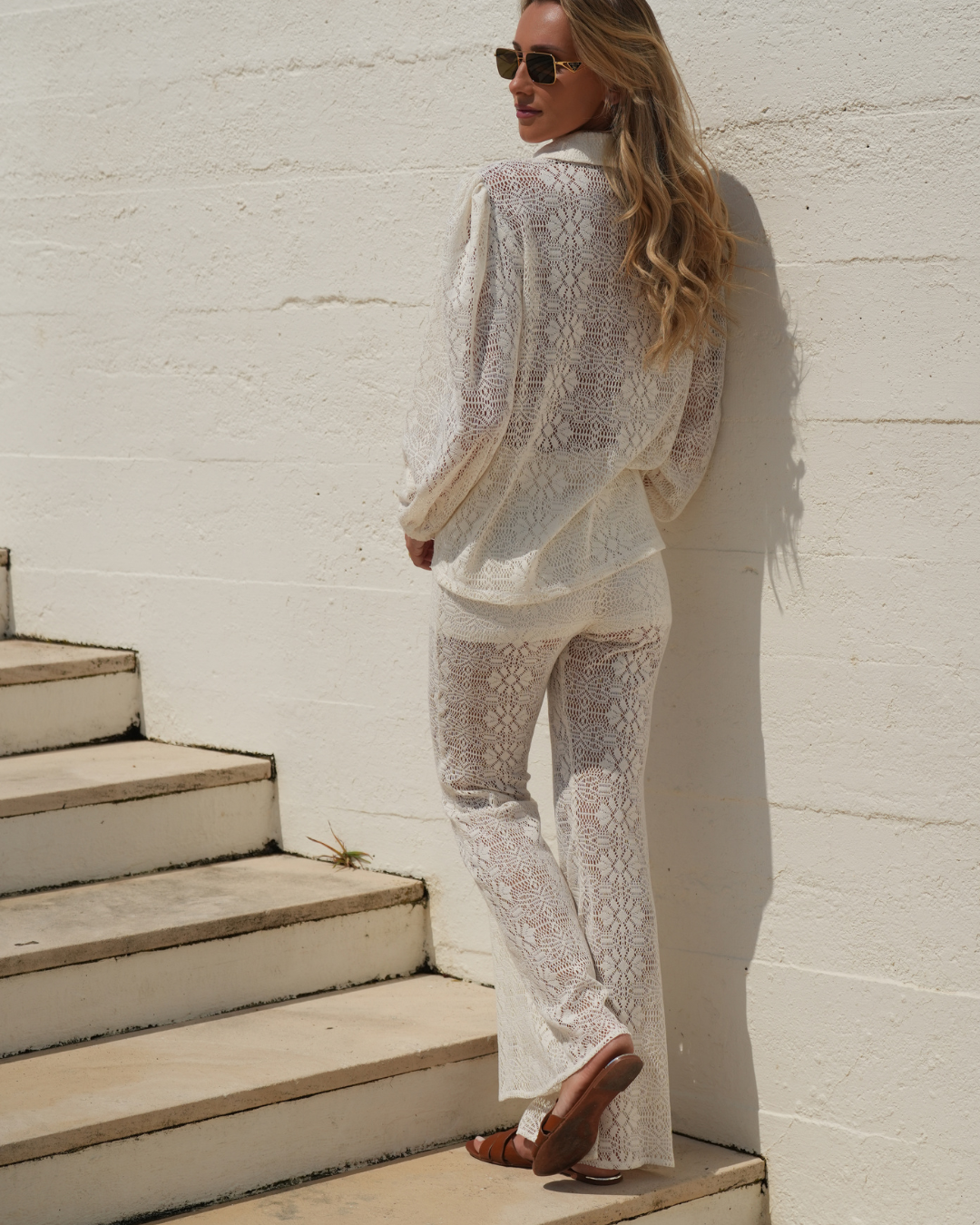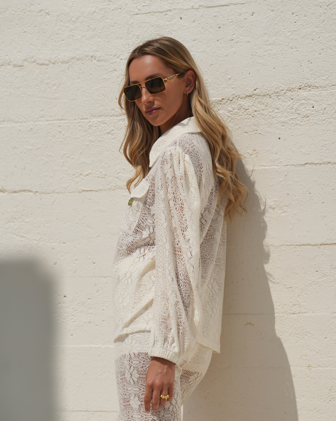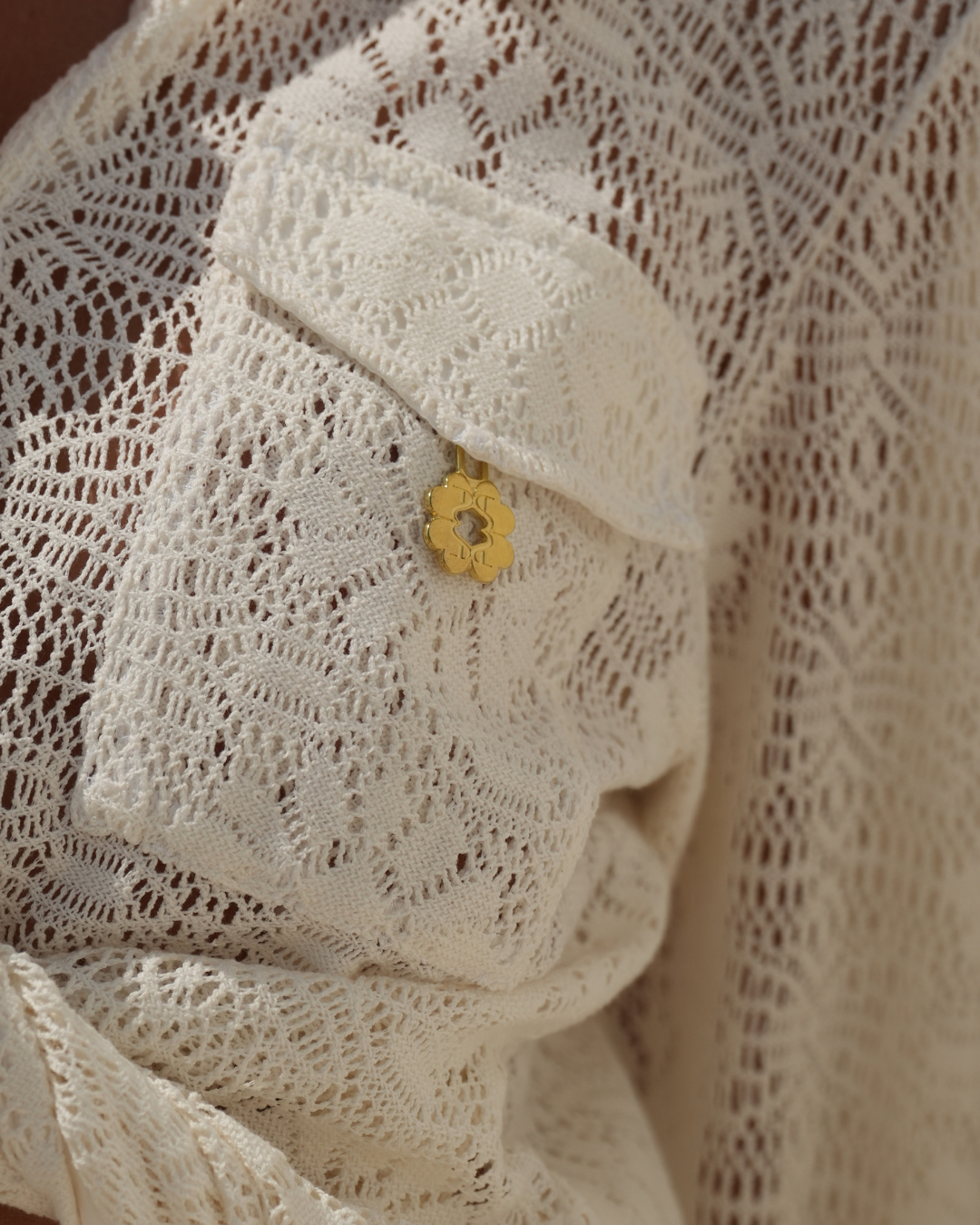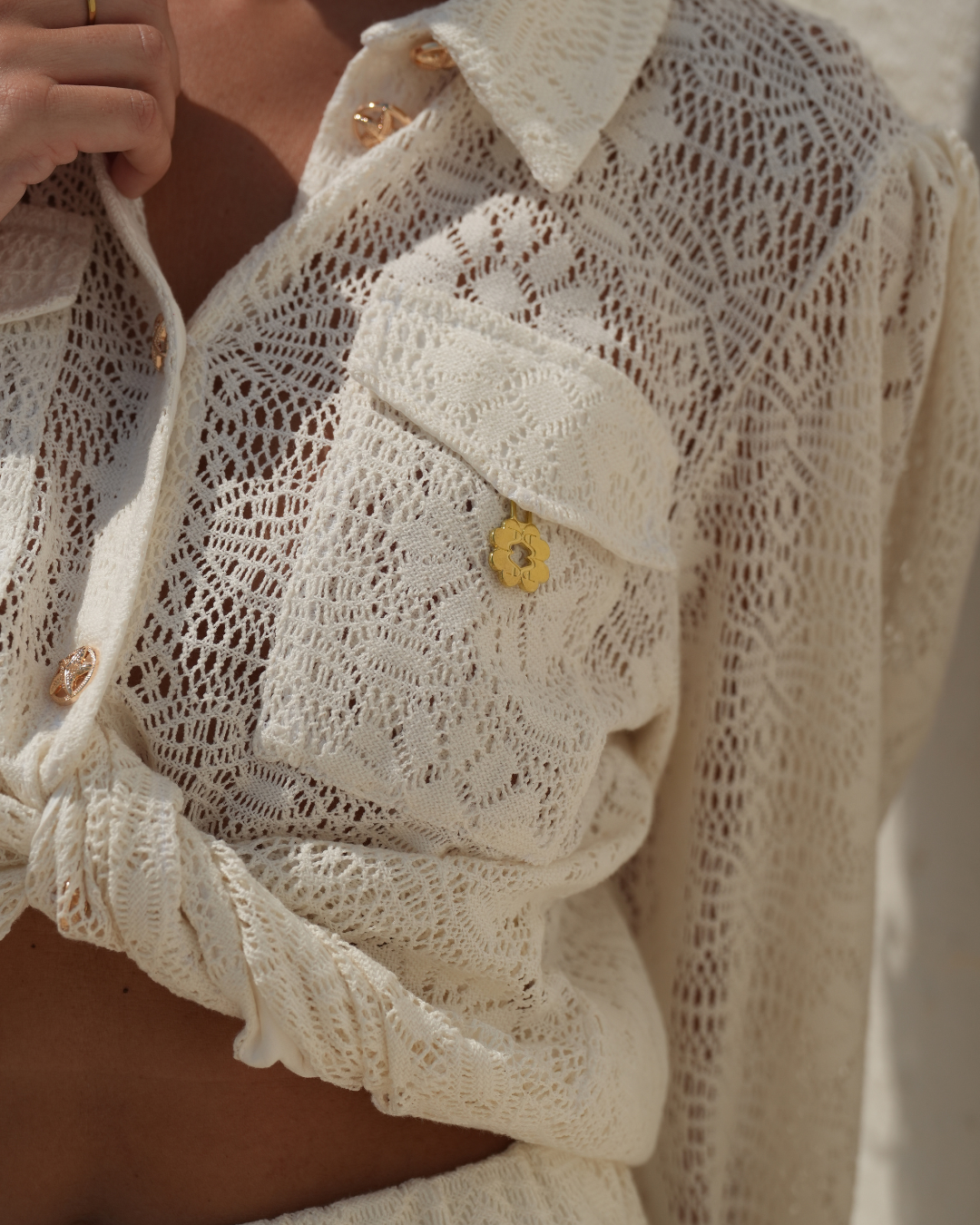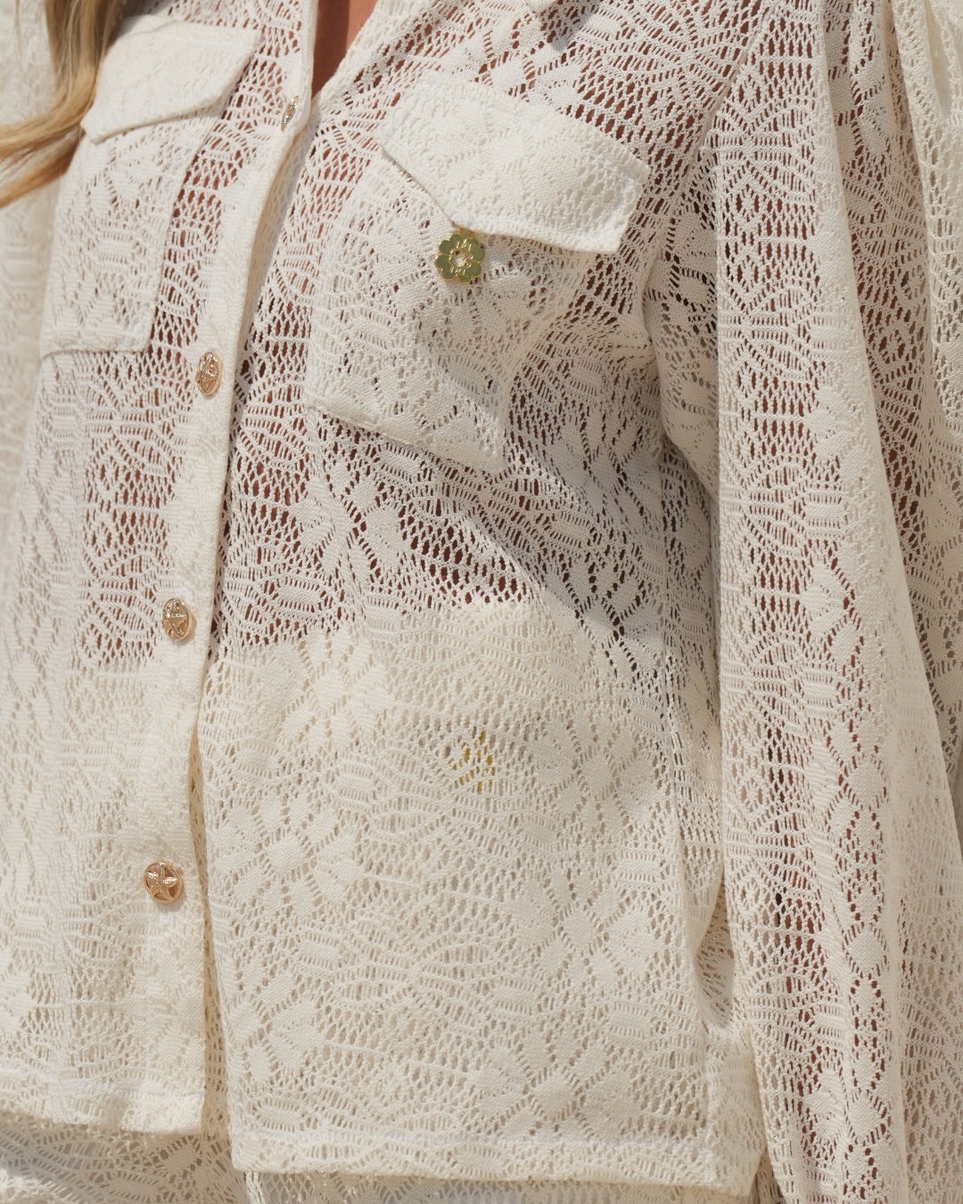 Salero Shirt é A camisa, respira moda em todos os seus detalhes e qualquer pessoa com gosto por moda vai querer ter. Feminina e fluída, em tecido de renda branca. Colarinho que lhe concede um toque clássico, desconstruído com os botões em formato estrela dourados. Bolsos na frente, em que do lado esquerdo contém o nosso pendente dourado do trevo coração. Mangas abalonadas e compridas para permitir usarmos em noites de verão mais frescas. Conseguimos facilmente transformá-las em mangas 3/4.