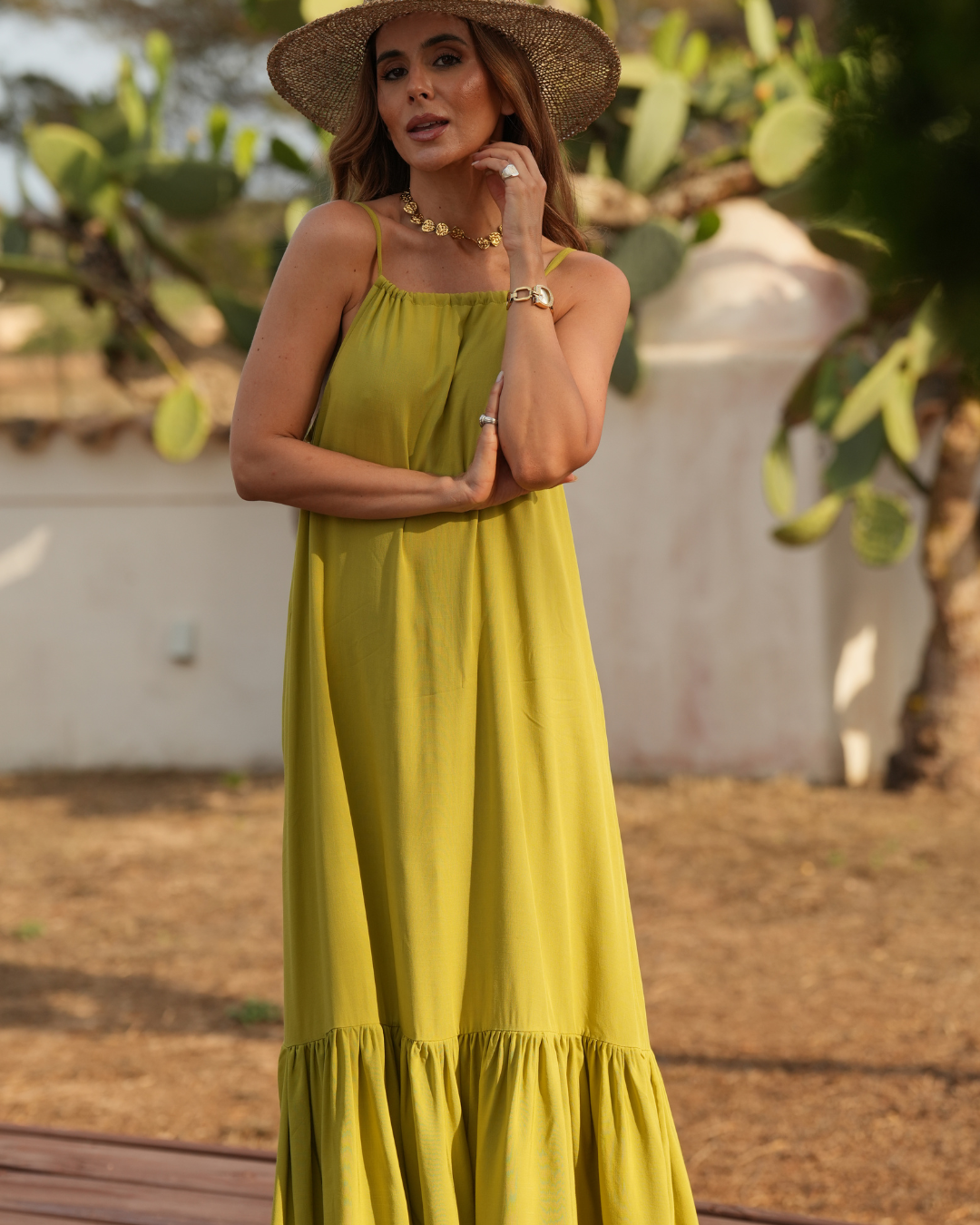 Vestido comprido fluído em tecido 100% viscose, muito fresco e leve. Aperta nas costas com cordão colarete à cor, fechados com ponteiras douradas que lhe concede um toque mais sofisticado e elegante. Todo forrado à cor. Perfeito para dias quentes, almoços, ou para dias de praia, piquenique ou para tomar aquele drink ao final do dia no bar da praia.