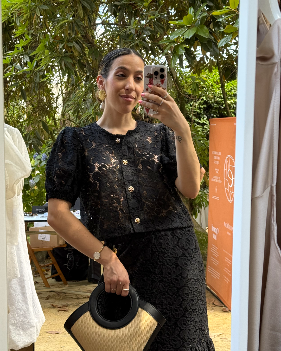 Blusa com fitting crop em estilo casaco, em tecido de renda branca, abotoa com botões em formato estrela do mar que lhe concede um toque de verão e leveza. Perfeita para combinar com a nossa DANZA SKIRT, ou até mesmo com jeans e calções. Mangas curtas abalonadas.