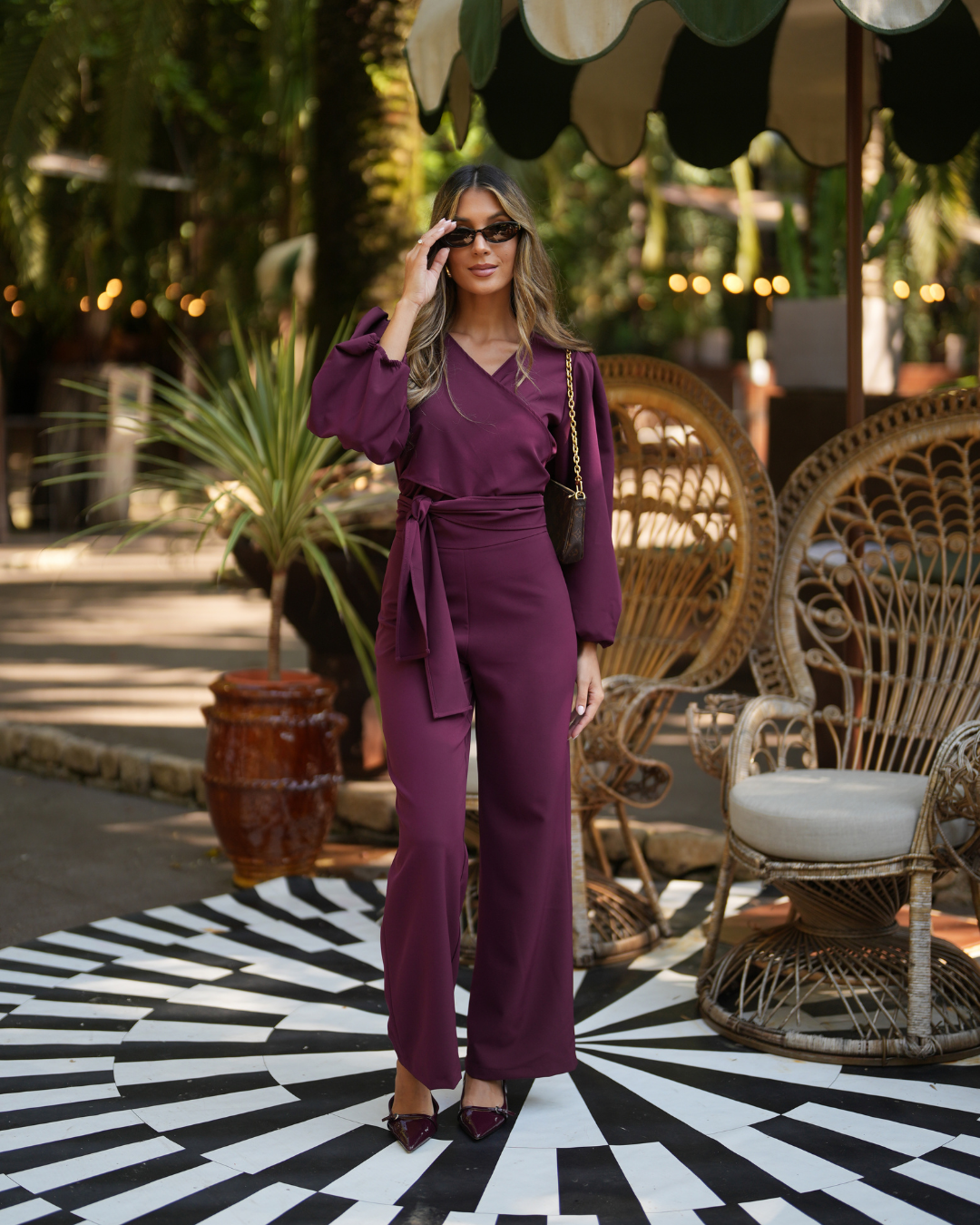 Macacão com calças fluídas, decote trespassado em V na parte da blusa que aperta com fitas que podem ser utilizadas de diferentes formas, mangas compridas abalonadas que permite usar também em 3/4. Fecho lateral invisível na costura.