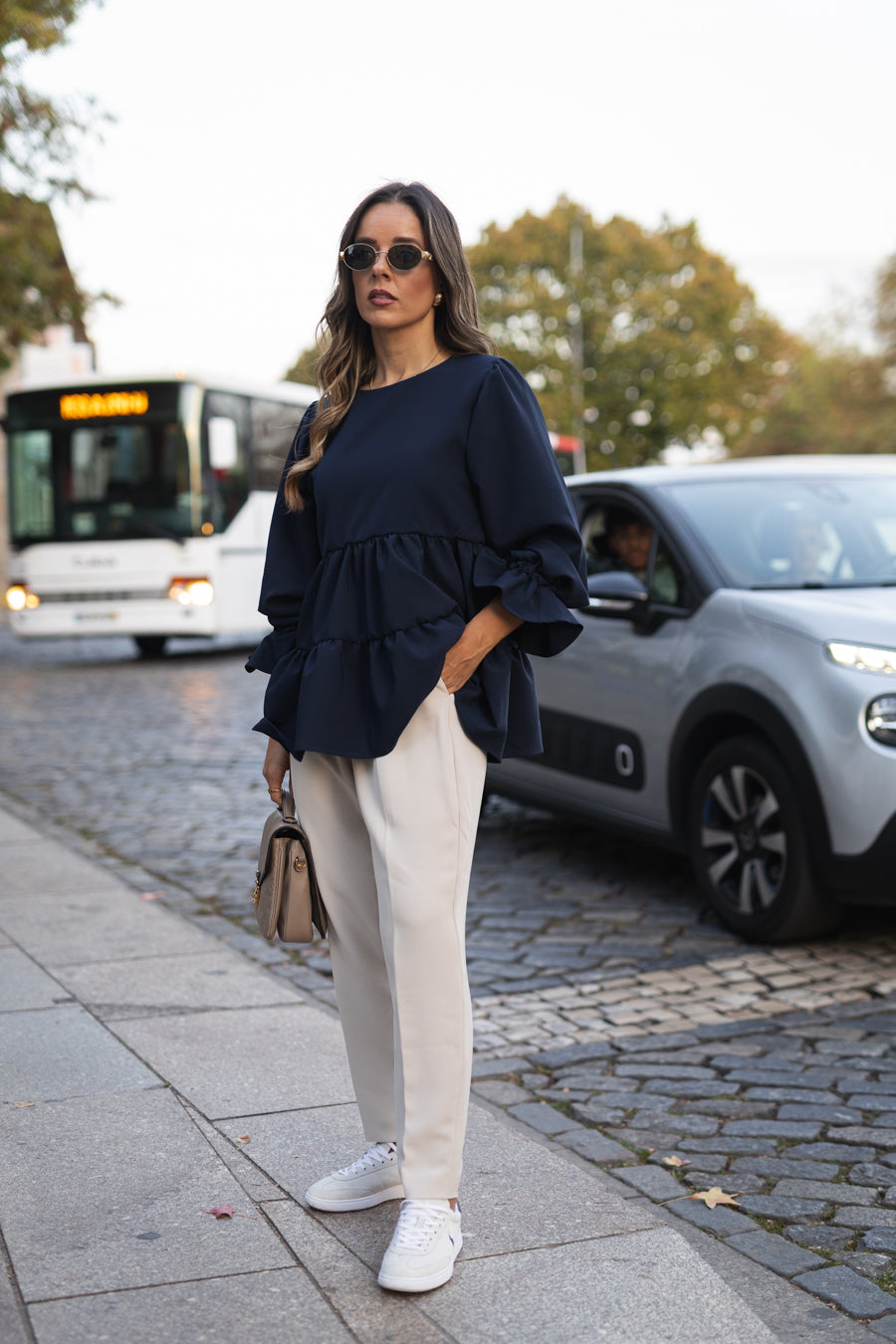 A blusa best-seller em folhos com mais de 2 metros de tecido está de volta e na cor clássica e atemporal. Decote redondo que aperta no cós com lágrima. Mangas abalonadas com punho franzido por elástico a terminar em folho, permitindo usar as mangas 3/4 ou compridas, concedendo-lhe uma versatilidade e intemporalidade únicas. Vai poder inspirar-se com a afirmação Be Love bordada em linha lurex dourada.