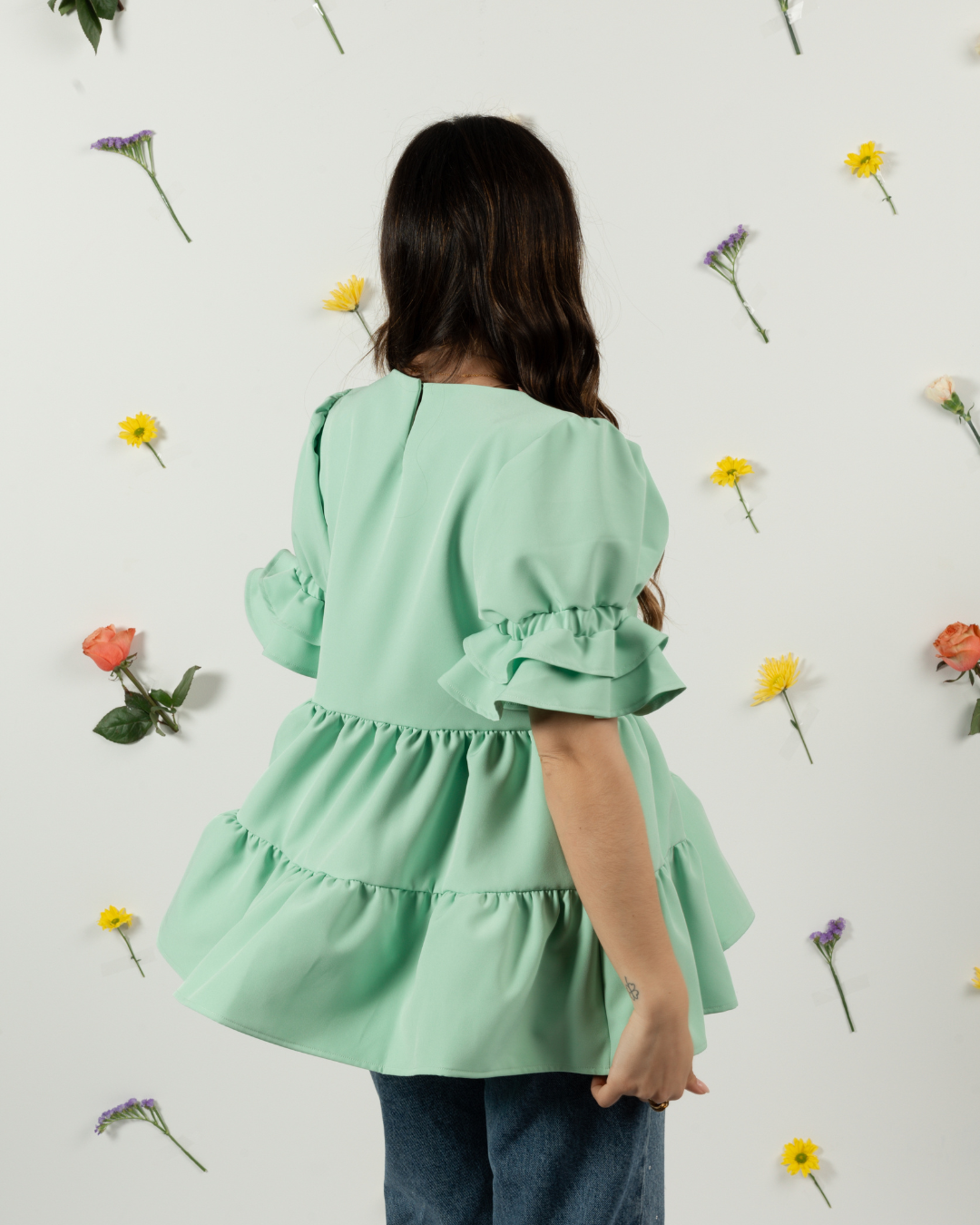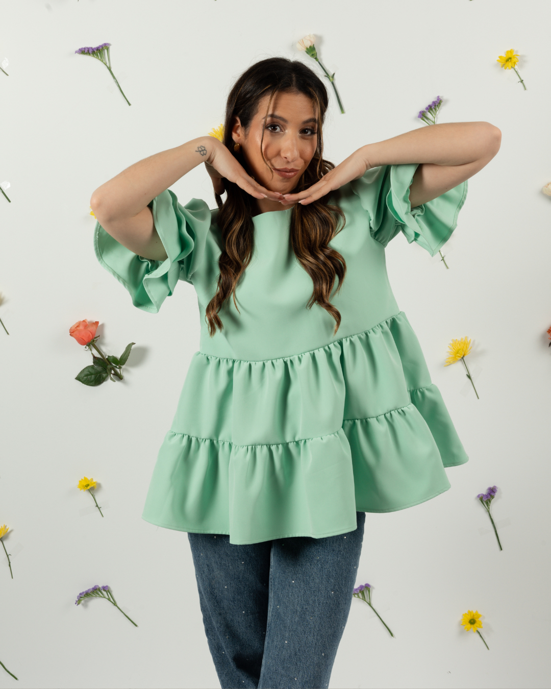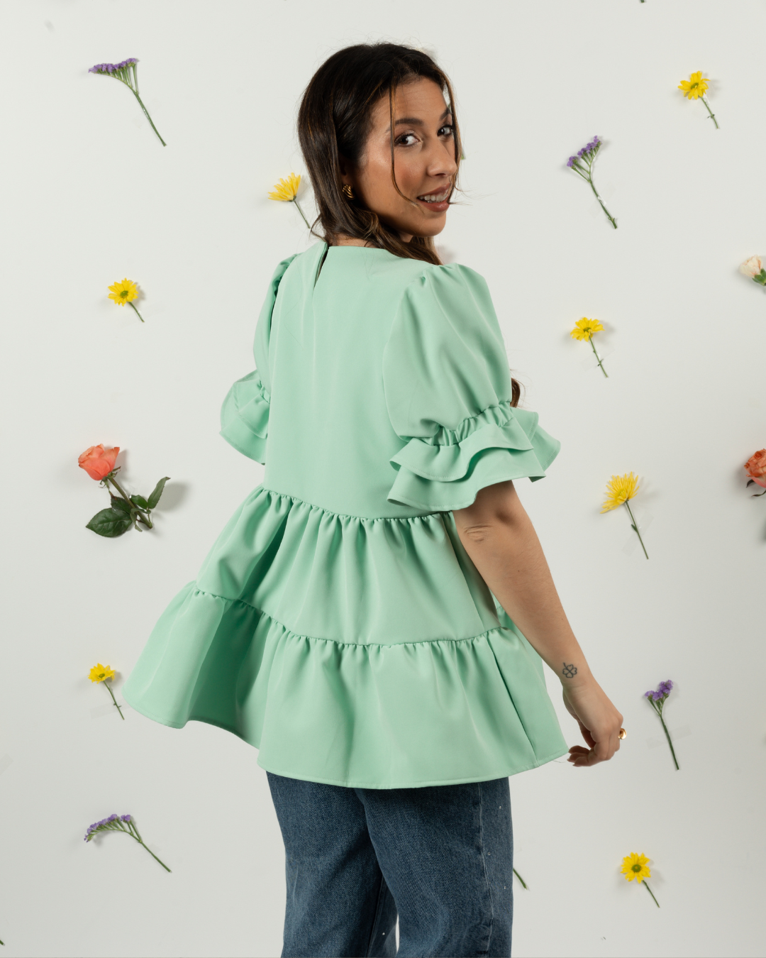 A blusa que fala de amor, em folhos, esvoaçante, pensada para todos os corpos. Decote redondo que aperta no cós com lágrima. Mangas abalonadas com punho franzido por elástico  a terminar em folho duplo. Vai poder inspirar-se com a afirmação Be Love bordada em linha lurex dourada.