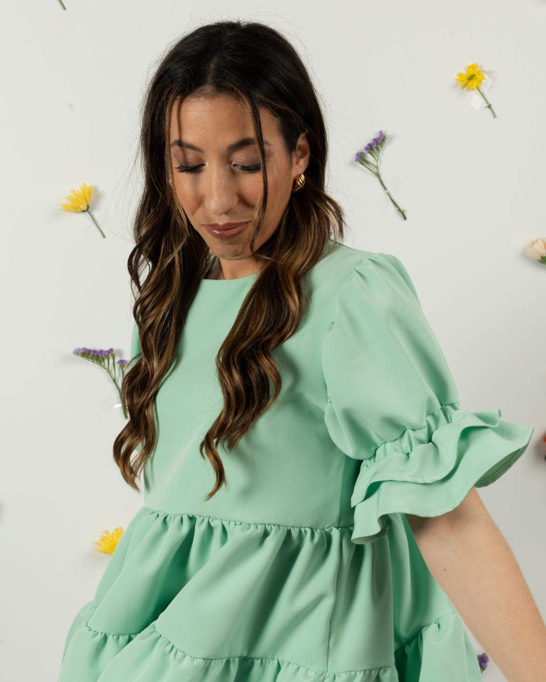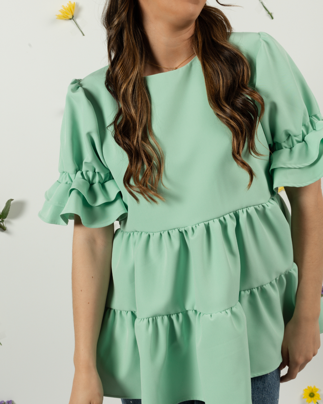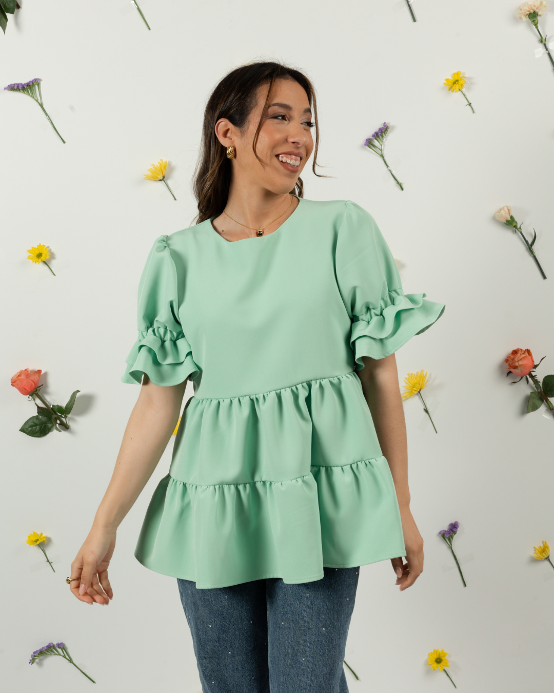 A blusa que fala de amor, em folhos, esvoaçante, pensada para todos os corpos. Decote redondo que aperta no cós com lágrima. Mangas abalonadas com punho franzido por elástico  a terminar em folho duplo. Vai poder inspirar-se com a afirmação Be Love bordada em linha lurex dourada.