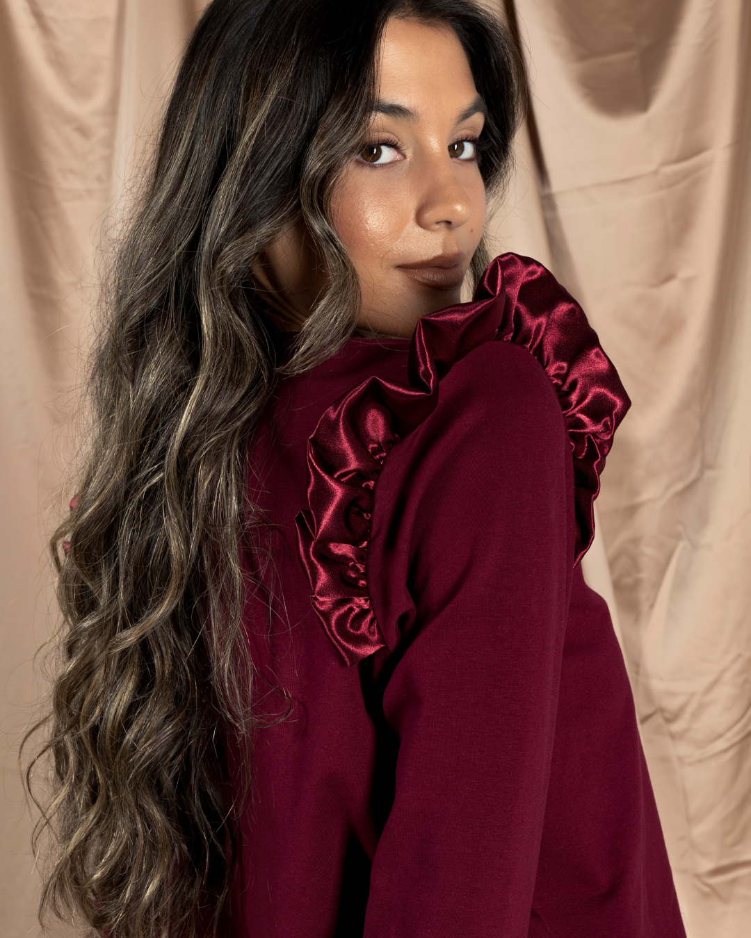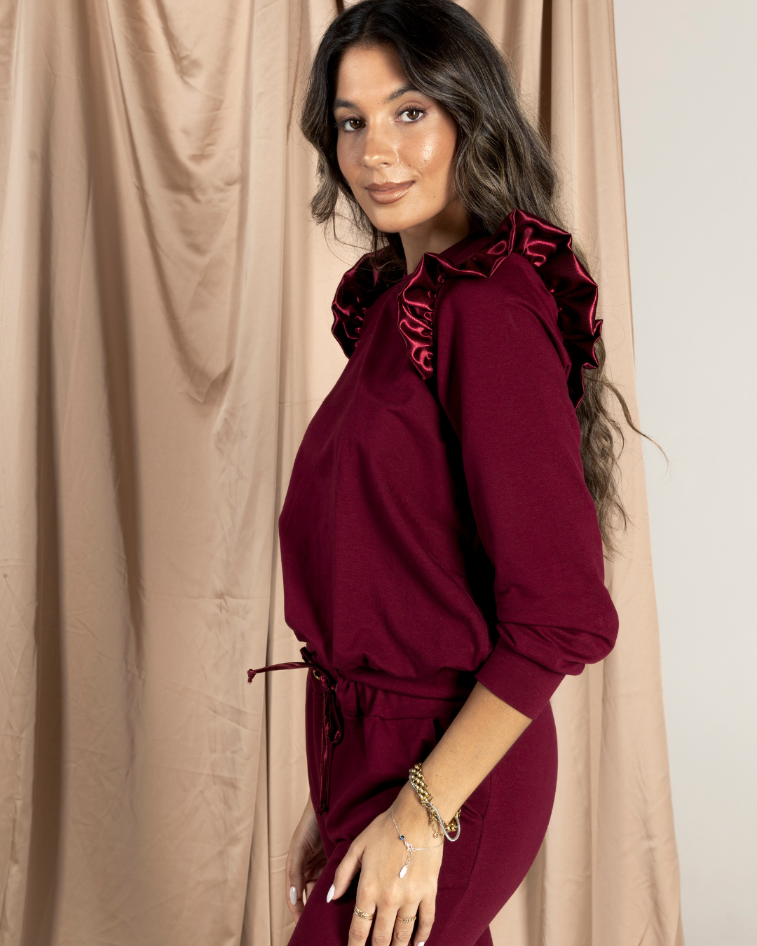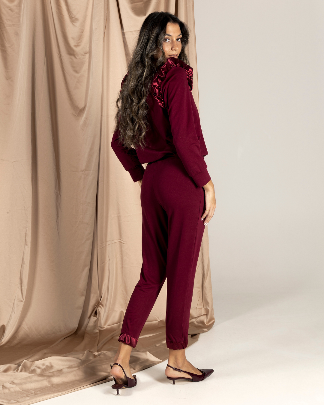 O conjunto/fato de treino que não parece de 2 peças best-seller desde 2020 pela última vez a este valor. Camisola com punhos altos, onde pode inspirar-se com a afirmação Believe In You bordada em linha lurex dourada do lado do coração. Folhos nos ombros em tecido acetinado bordeaux. Calças com bolsos, cintura em elástico a aperto com cordão em tecido acetinado bordeaux. Tornozelos com punho elástico em tecido acetinado bordeaux