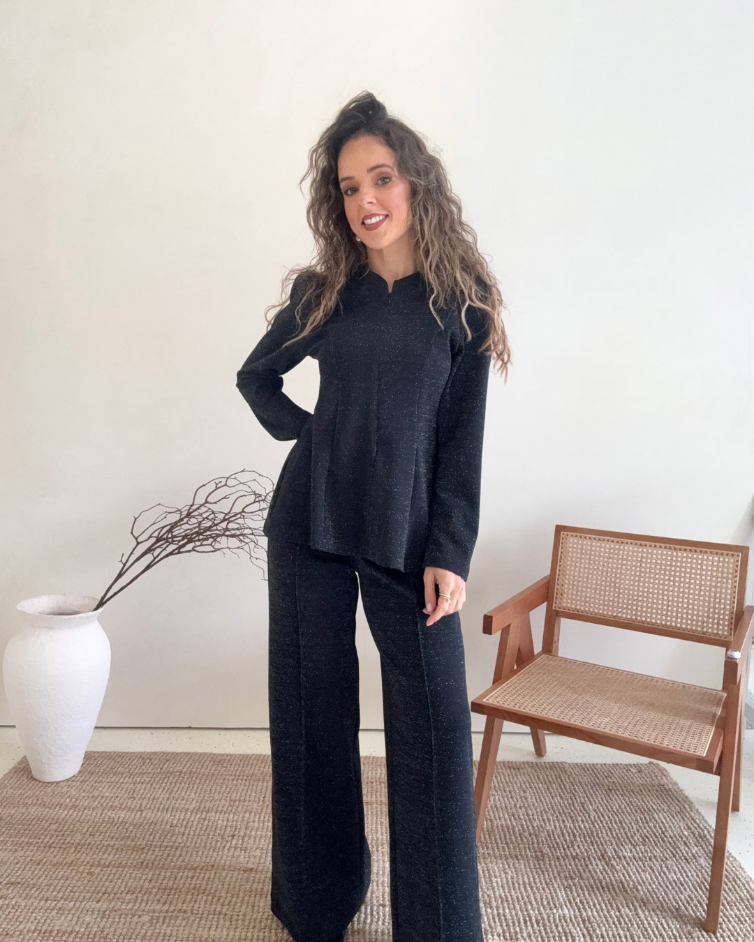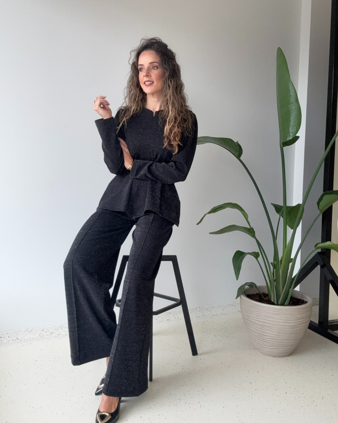 Blusa/casaco em malha cor preto com lurex prata, uma malha muito confortável e suave, com franzido nos ombros, efeito de pinças à frente e nas costas. Fecho na frente invisível que permite abertura. Cintura mais definida através do seu fitting, o que potencia uma silhueta mais cintada.