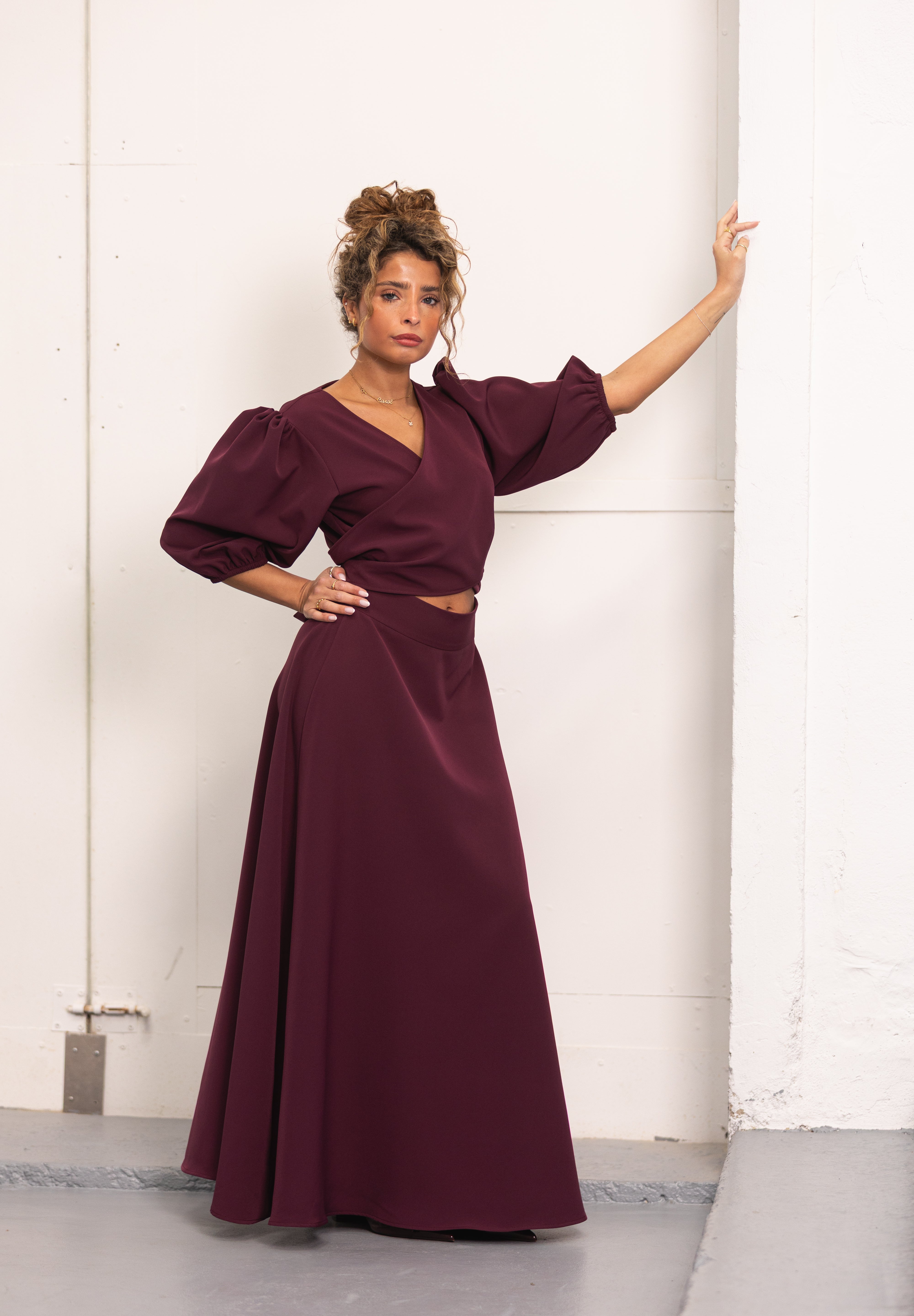 Apresenta um decote trespassado em V na parte da blusa, que aperta com fitas ajustáveis, permitindo diferentes formas de utilização. As mangas abalonadas podem ser usadas em versão 3/4 ou mais curtas, adaptando-se facilmente ao estilo pretendido. A saia conta com fecho lateral invisível integrado na costura, garantindo um acabamento discreto e sofisticado.
