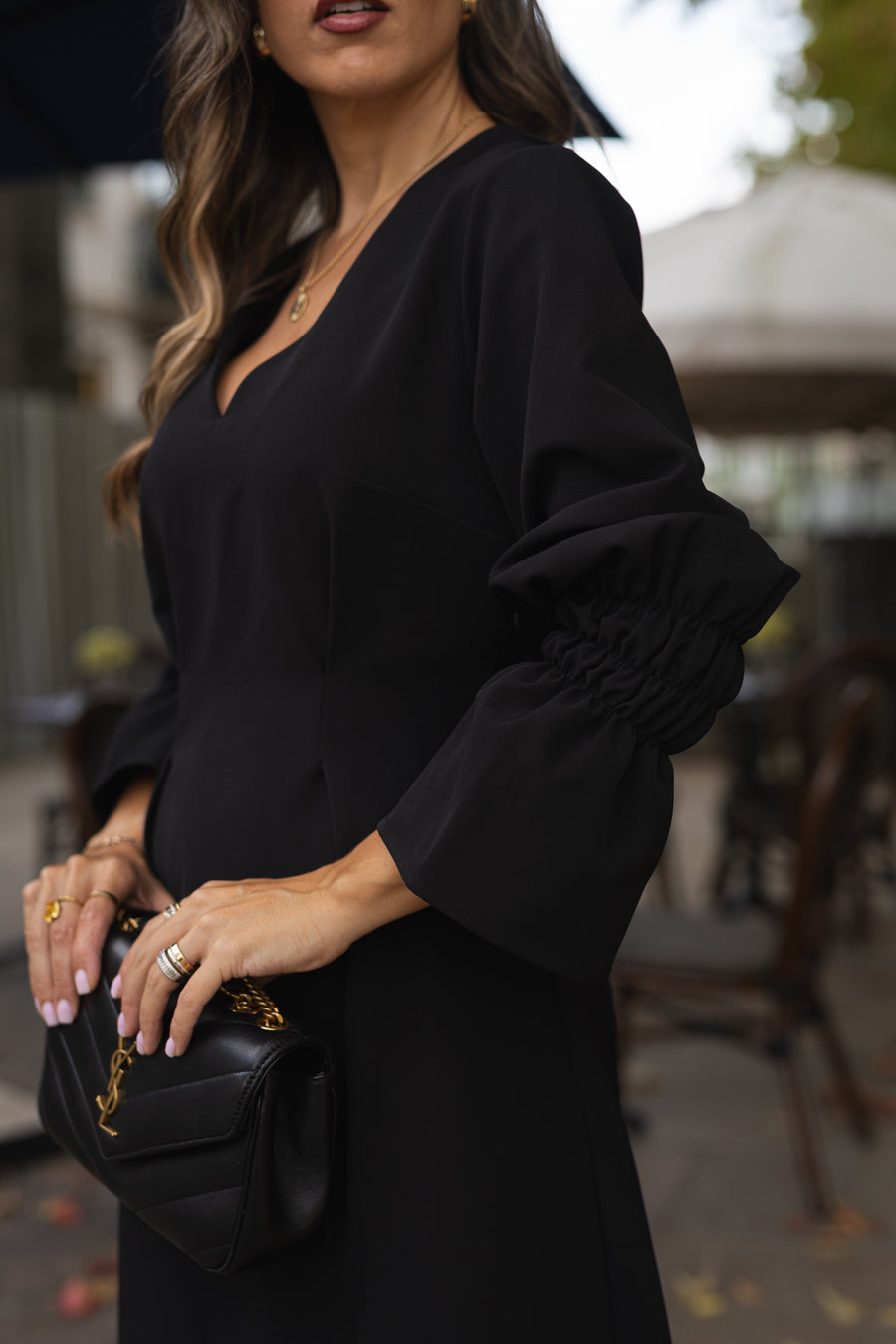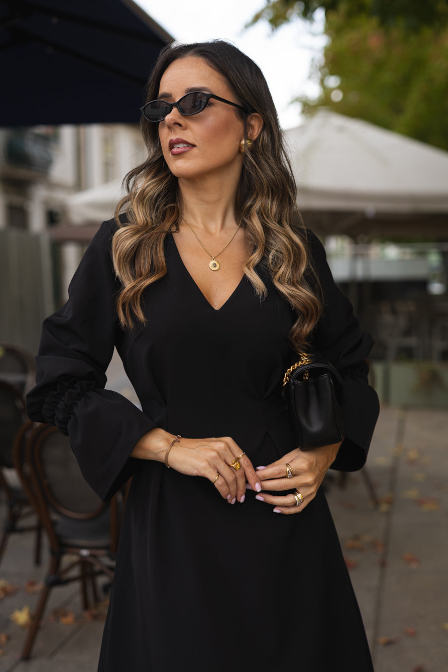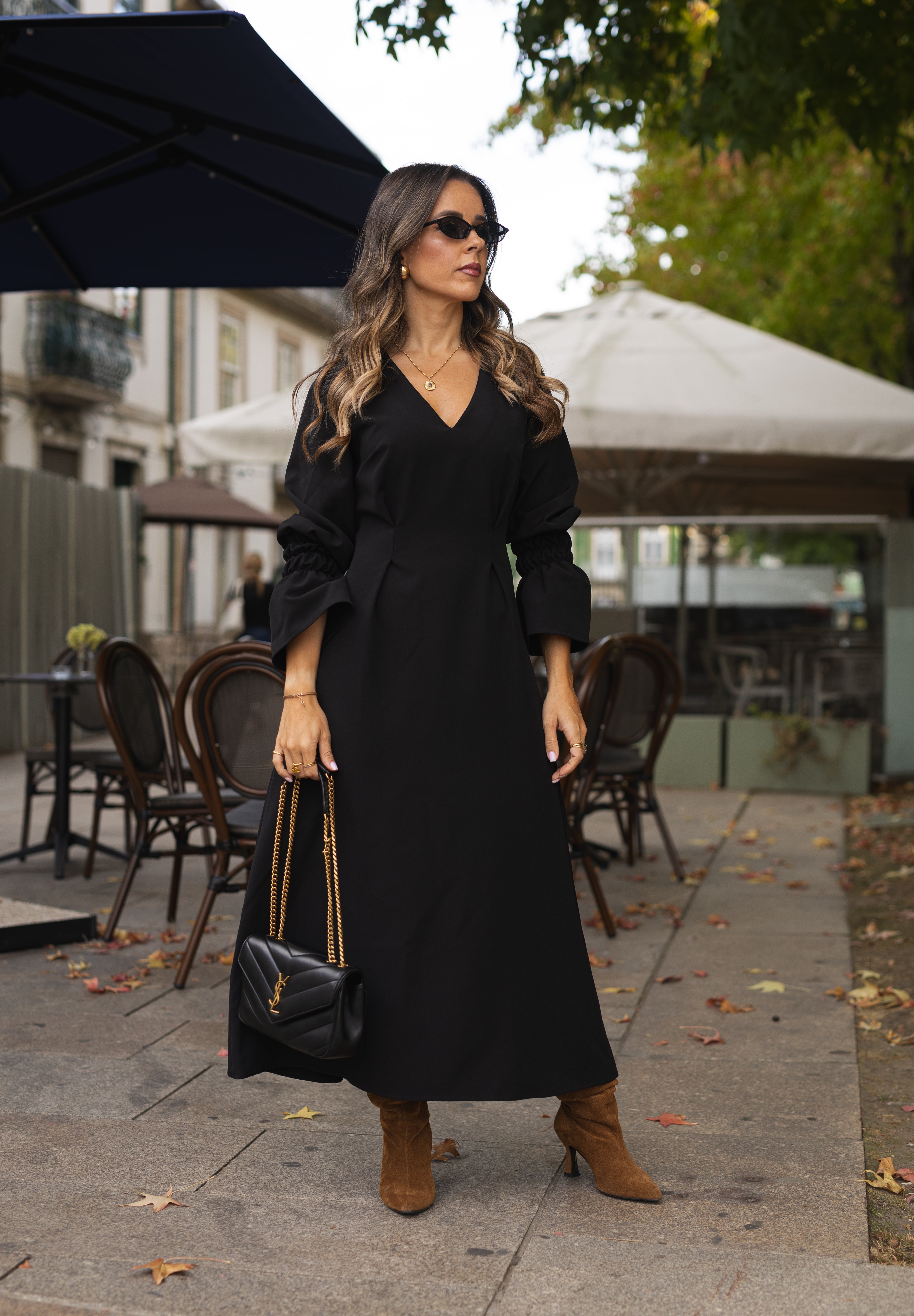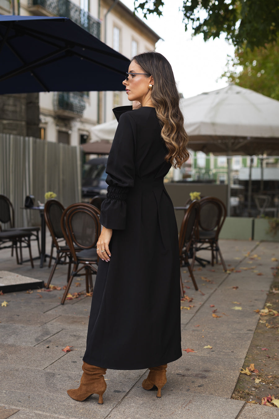 Vestido midi com efeito de pinças na frente e nas costas para uma silhueta mais cintada. Decote em V que o torna ainda mais elegante. Mangas compridas com elásticos que permite usar também mais curtas. Fecho lateral invisível na costura. Contém na manga do lado esquerdo a afirmação inspiracional bordada Be Strong.