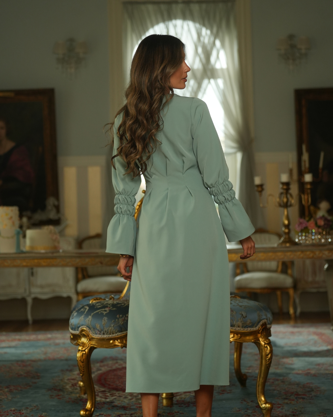 Vestido midi com efeito de pinças na frente e nas costas para uma silhueta mais cintada. Decote em V. Mangas compridas com elásticos que permite usar também mais curtas. Fecho lateral invisível na costura.